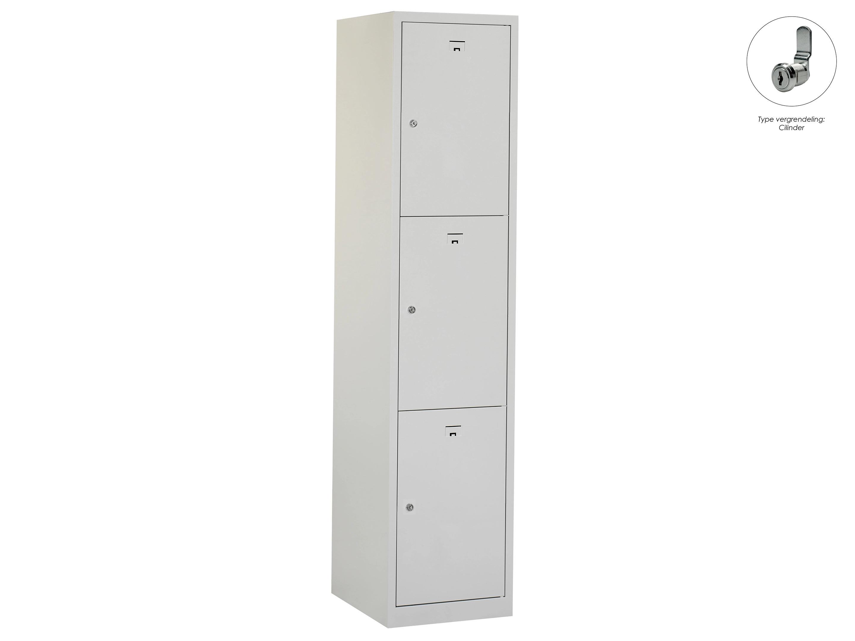 Type deuren: glad zonder naamkaarthouder, type slot: cilinderslot. Kleur romp: grijs (RAL7035), kleur deuren: grijs (RAL7035) . Afmeting: 180x30x50 cm (HxBxD). Netto doorsteek: 321x212x468mm. Aantal sleutels per slot: 2.