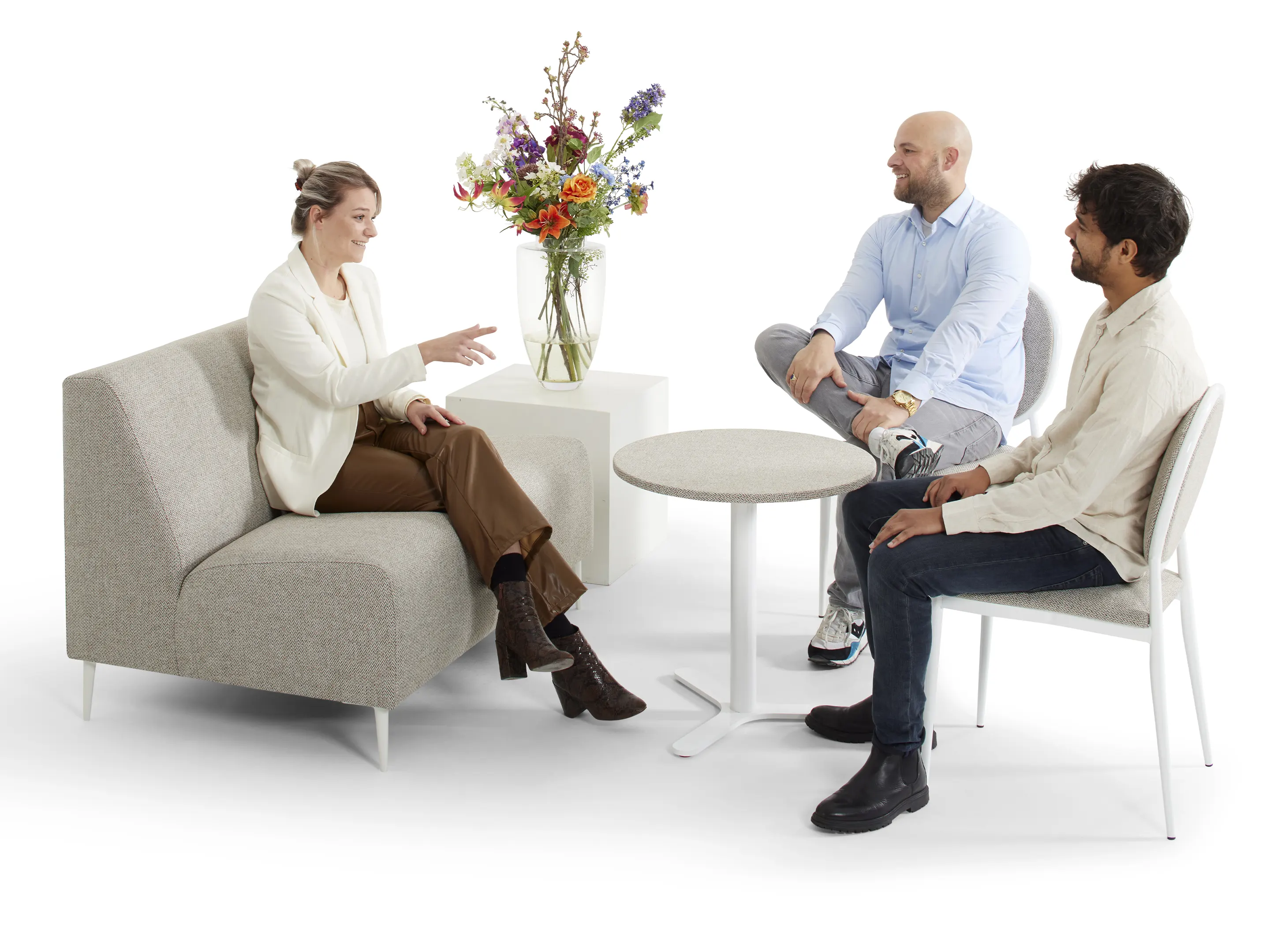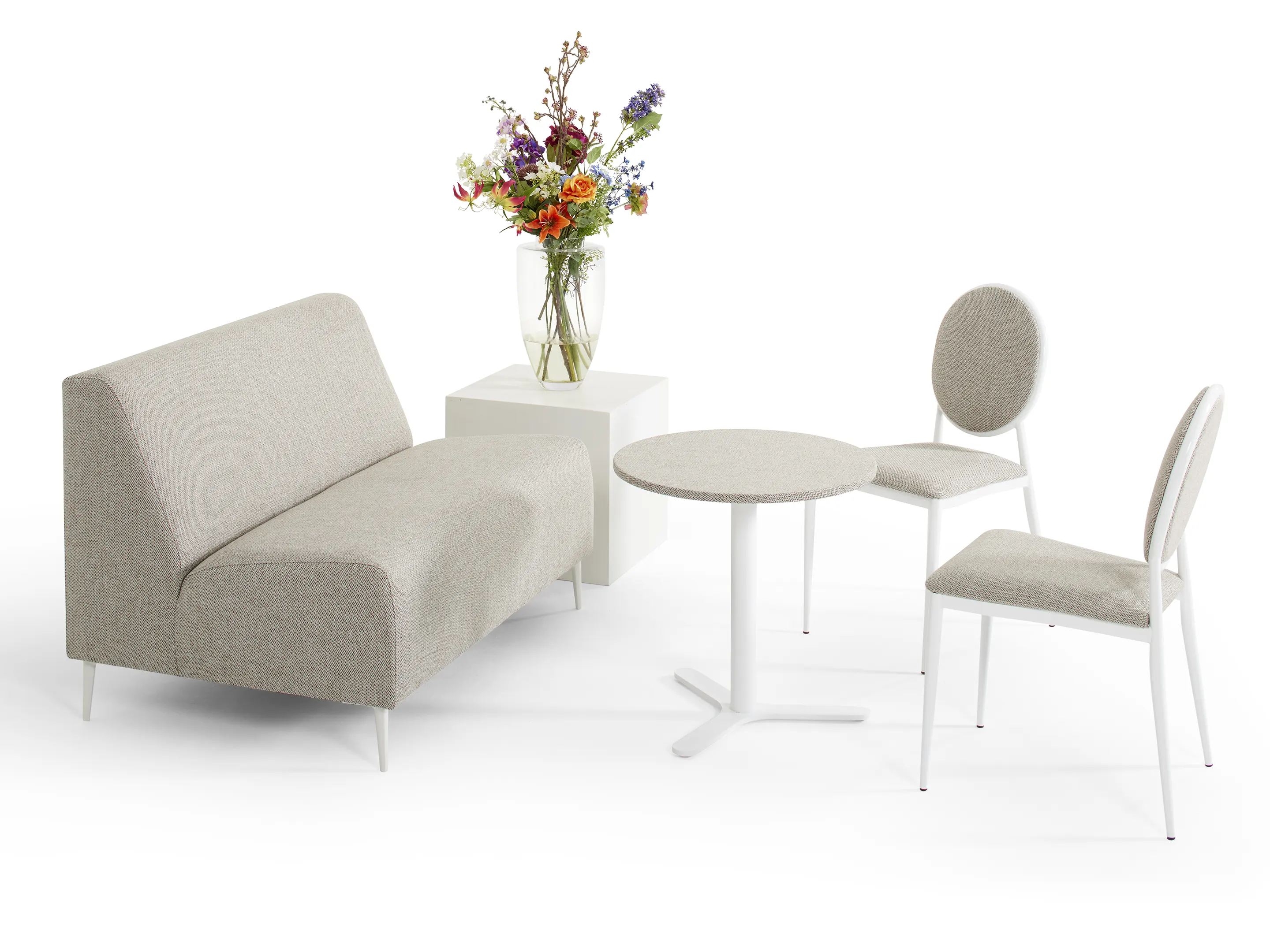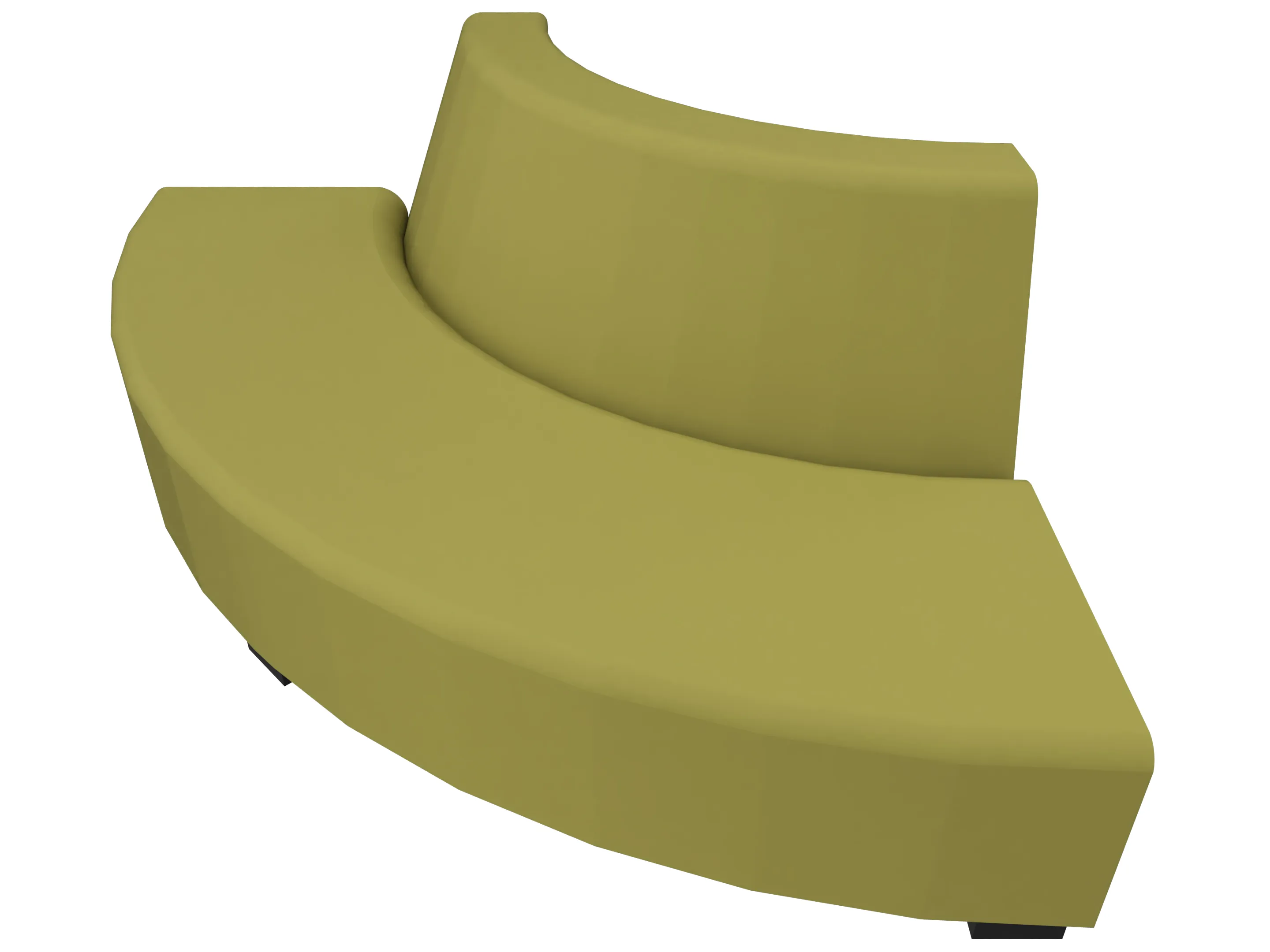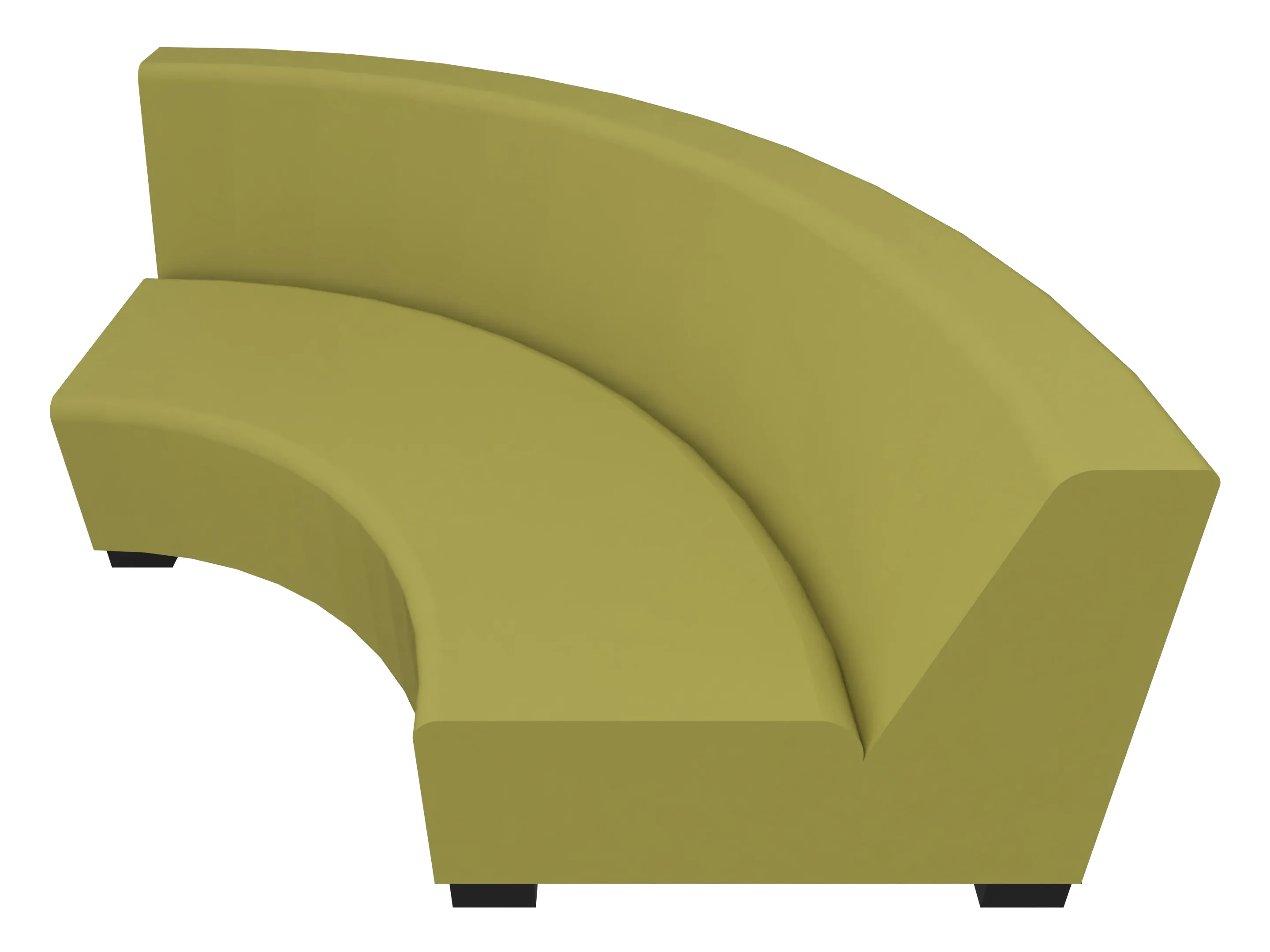 Volledig gestoffeerde bank in kwartronde vorm voor het maken van binnenbochten (rugleuning aan de lange zijde). Buitendiameter is 3080mm, binnendiameter is 1400mm. Rughoogte: 720mm, diepte: 840mm.Standaard zithoogte 360mm (op 60mm hoge PVC meubelpoot).