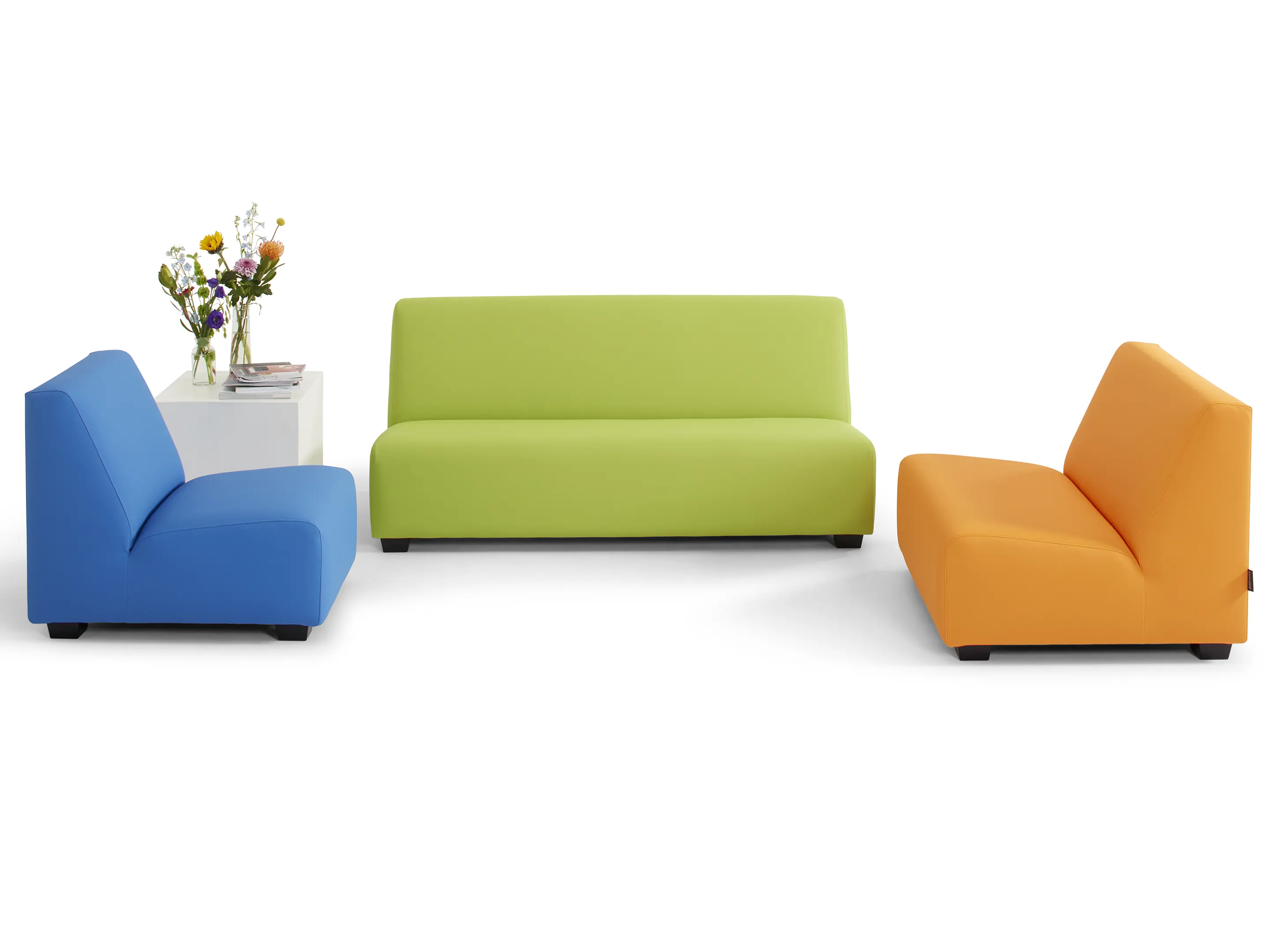 Volledig gestoffeerde 3-zits bank, zonder armleggers. Standaard zithoogte 360mm (op 60mm hoge PVC meubelpoot). Afmeting: 1650 x 710 x 840mm (BxHxD)