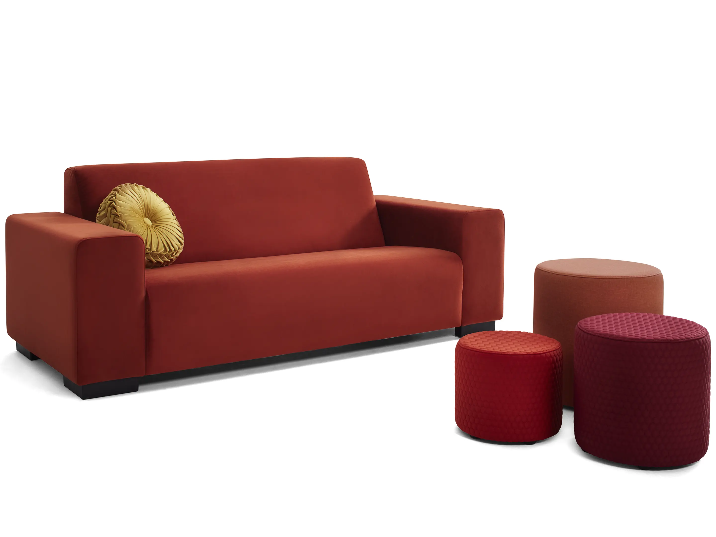 Volledig gestoffeerde 3-zits bank, met armleggers. Standaard zithoogte 360mm (op 60mm hoge PVC meubelpoot). Afmeting: 2130 x 710 x 840mm (BxHxD)