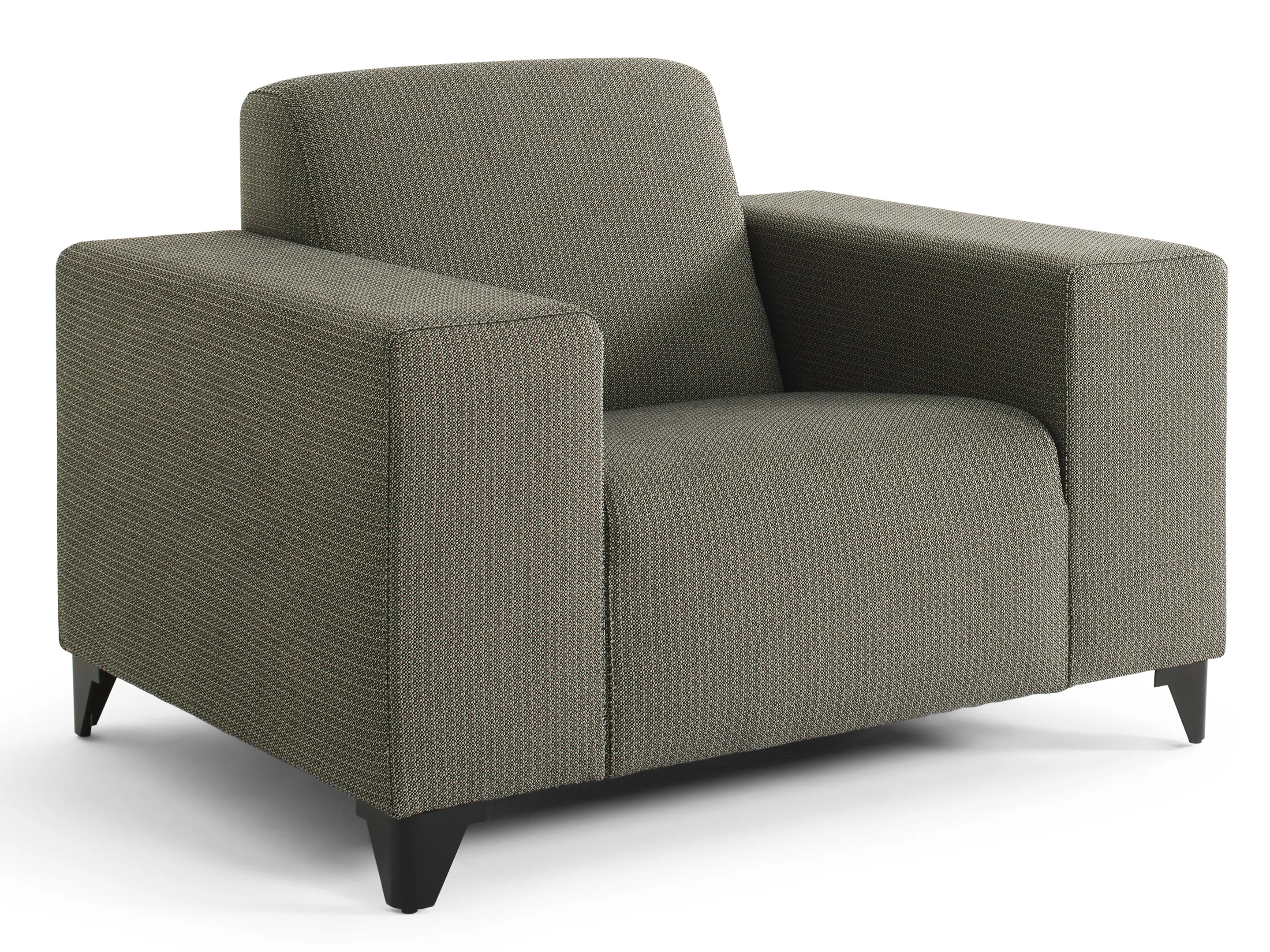 Volledig gestoffeerde fauteuil, met armleggers. Standaard zithoogte 360mm (op 60mm hoge PVC meubelpoot). Afmeting: 1080 x 710 x 840mm (BxHxD)