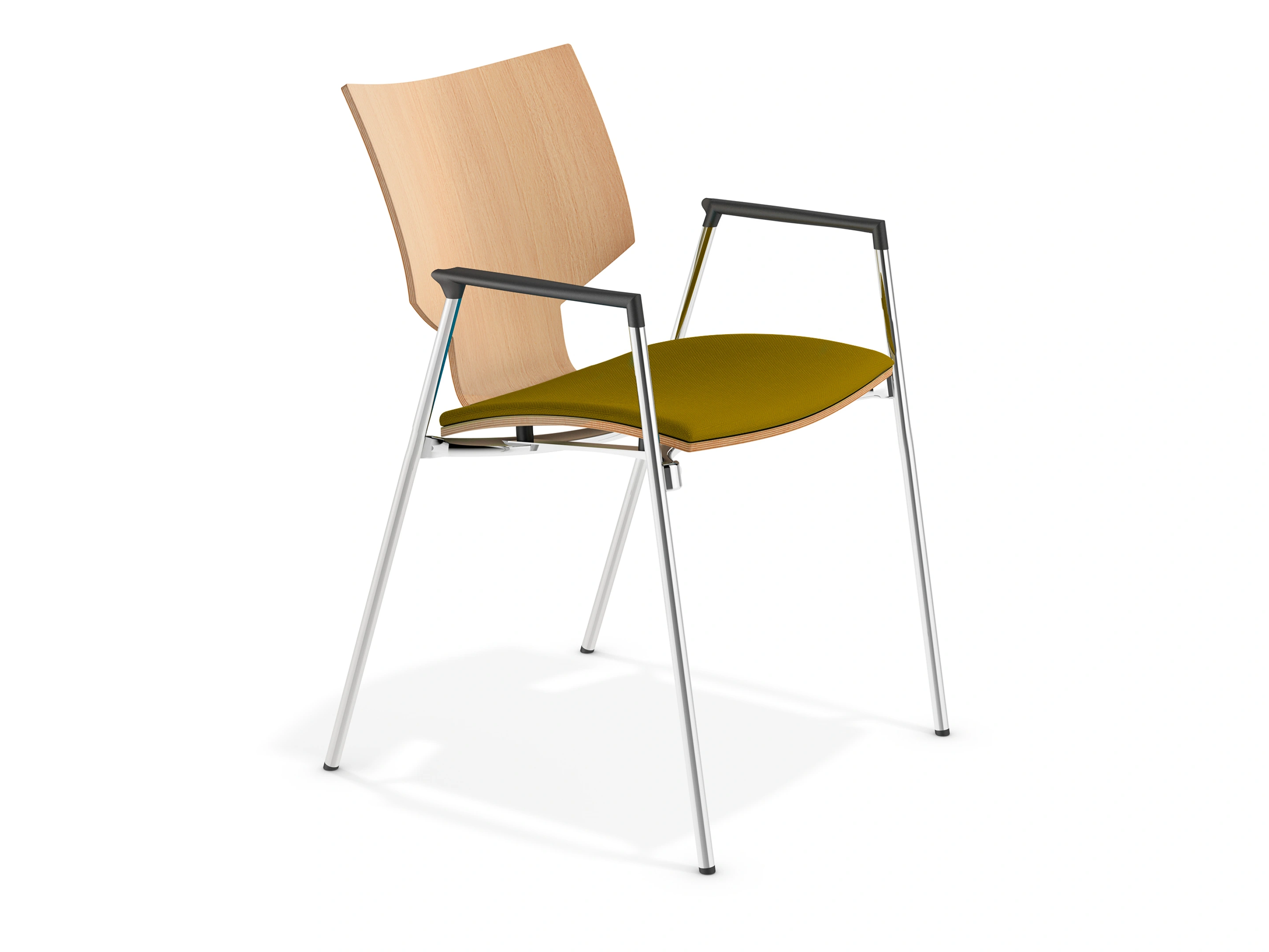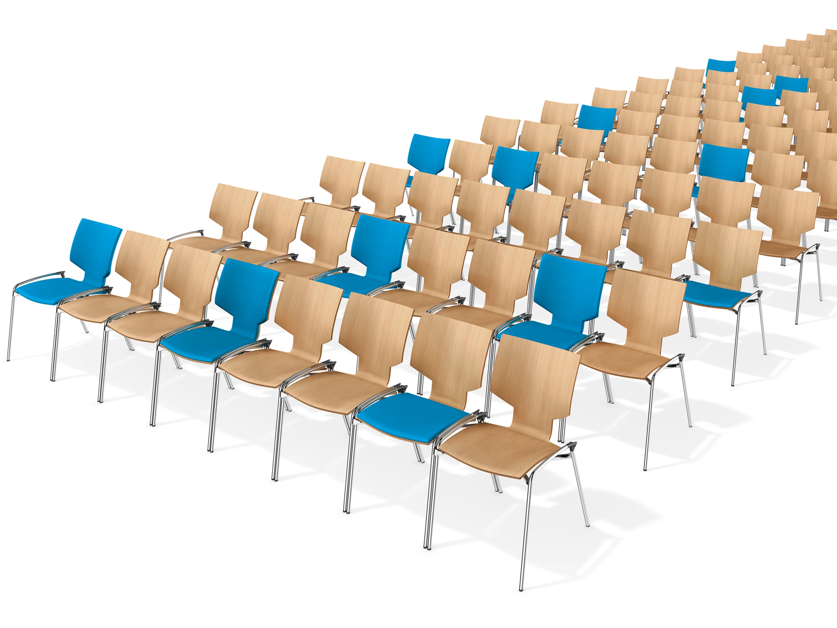 4-poots koppelbaar frame op kunststof glijders met een houten kuip met zitting opdekstoffering. Inclusief armleggers. Stapelbaar tot 12 stuks op transportwagen (verticaal stapelbaar) en 6 stuks vrijstaand.