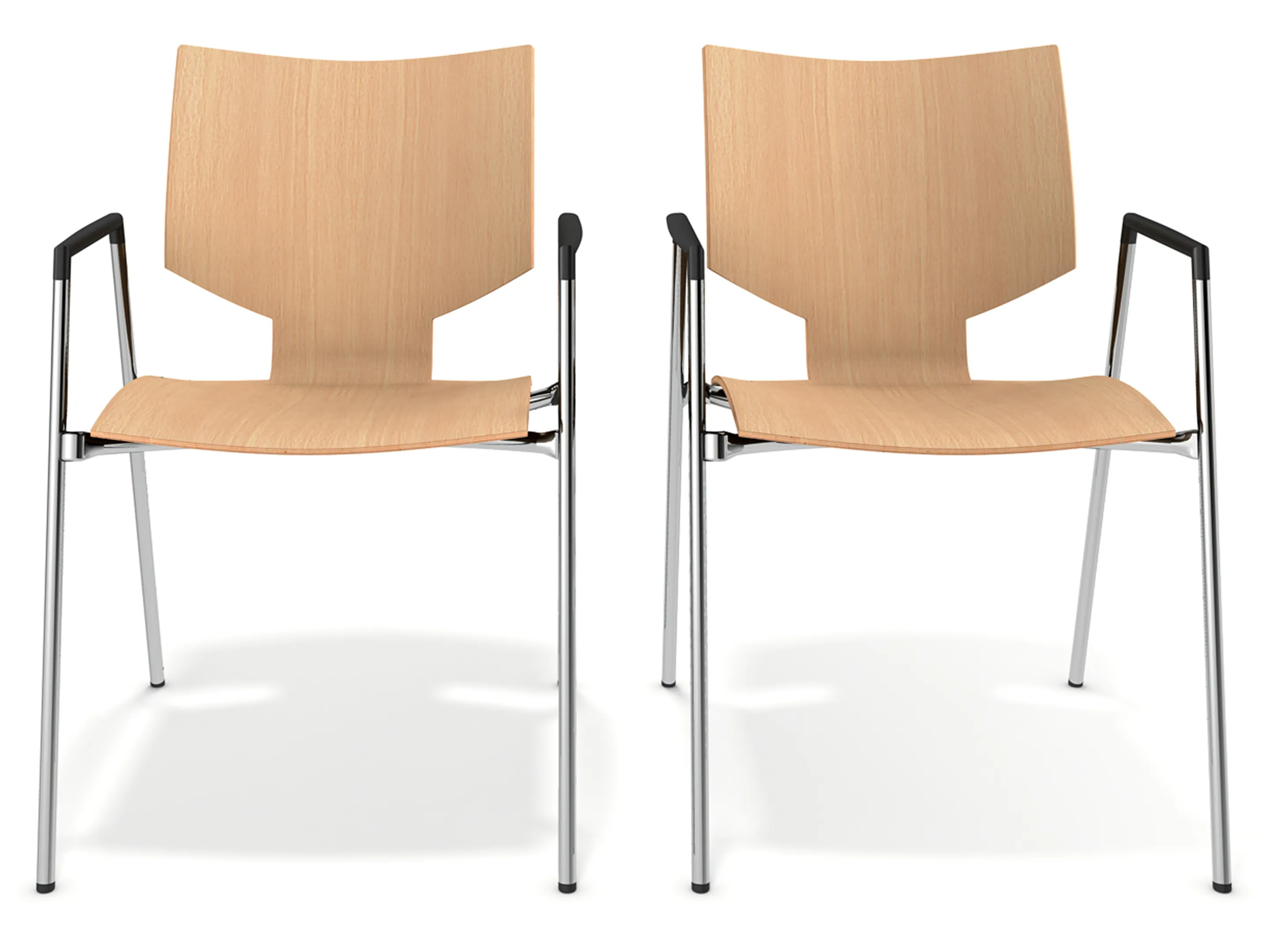 4-poots koppelbaar frame op kunststof glijders met een houten kuip zonder stoffering. Inclusief armleggers. Stapelbaar tot 12 stuks op transportwagen (verticaal stapelbaar) en 6 stuks vrijstaand.