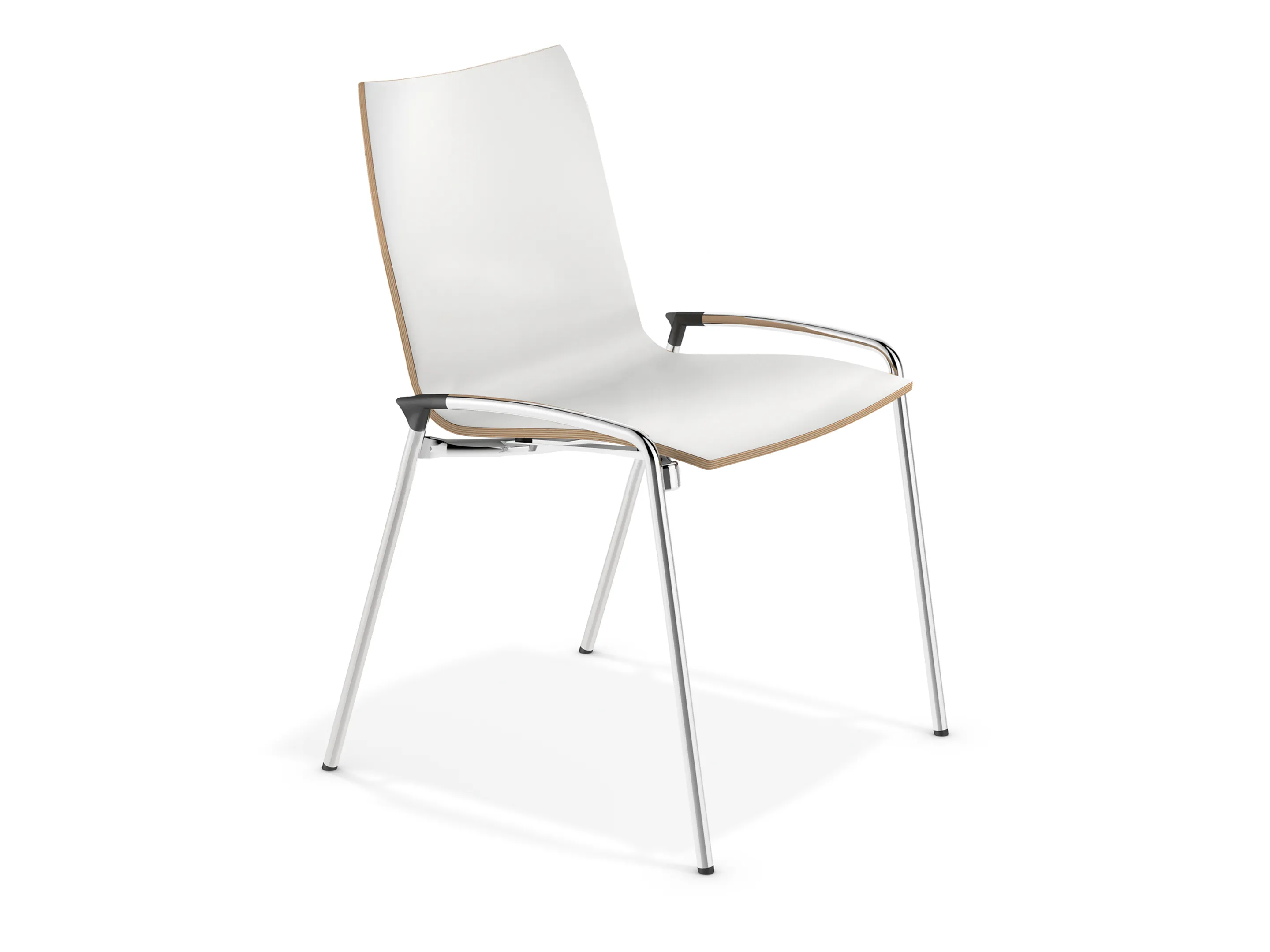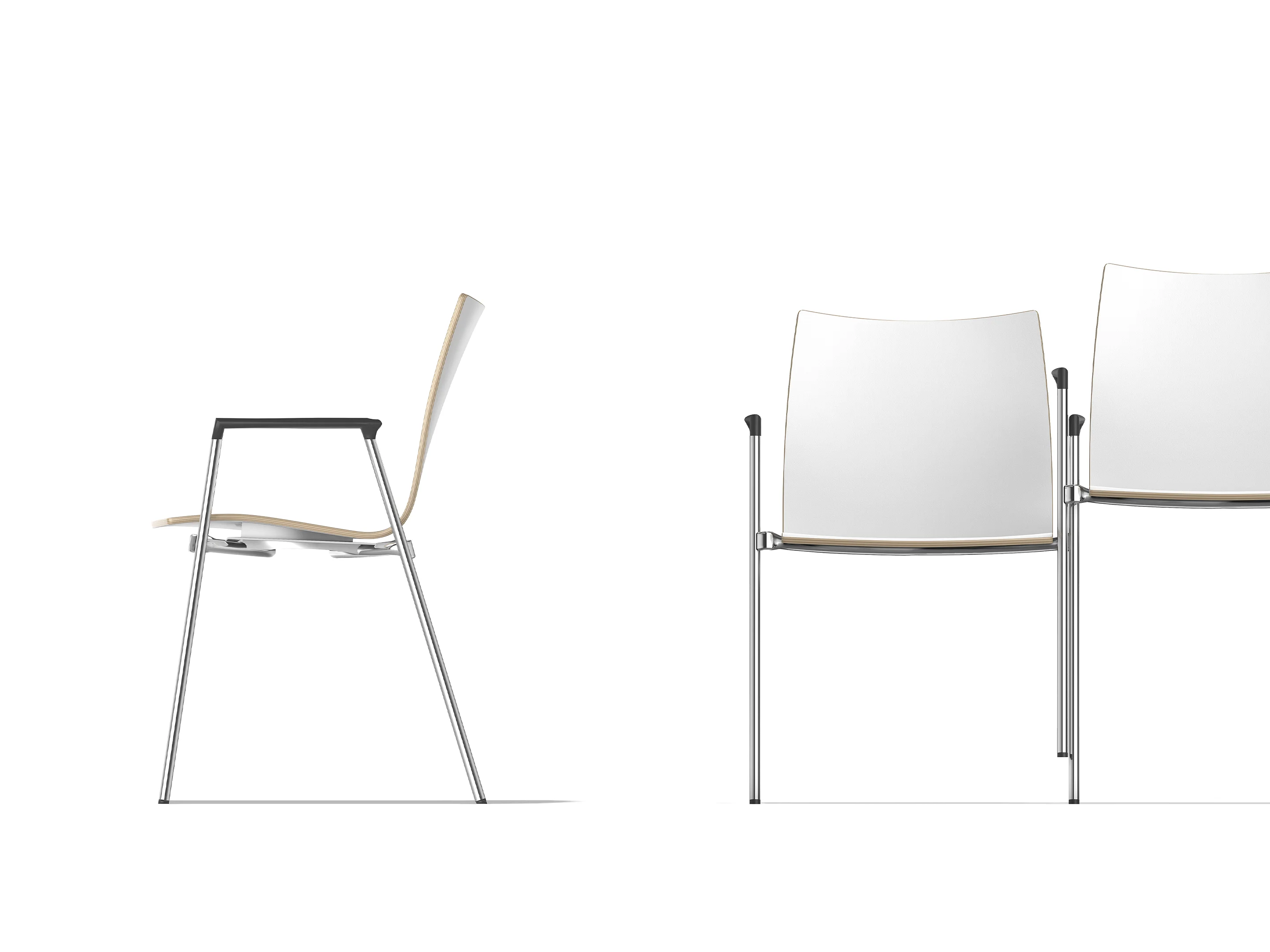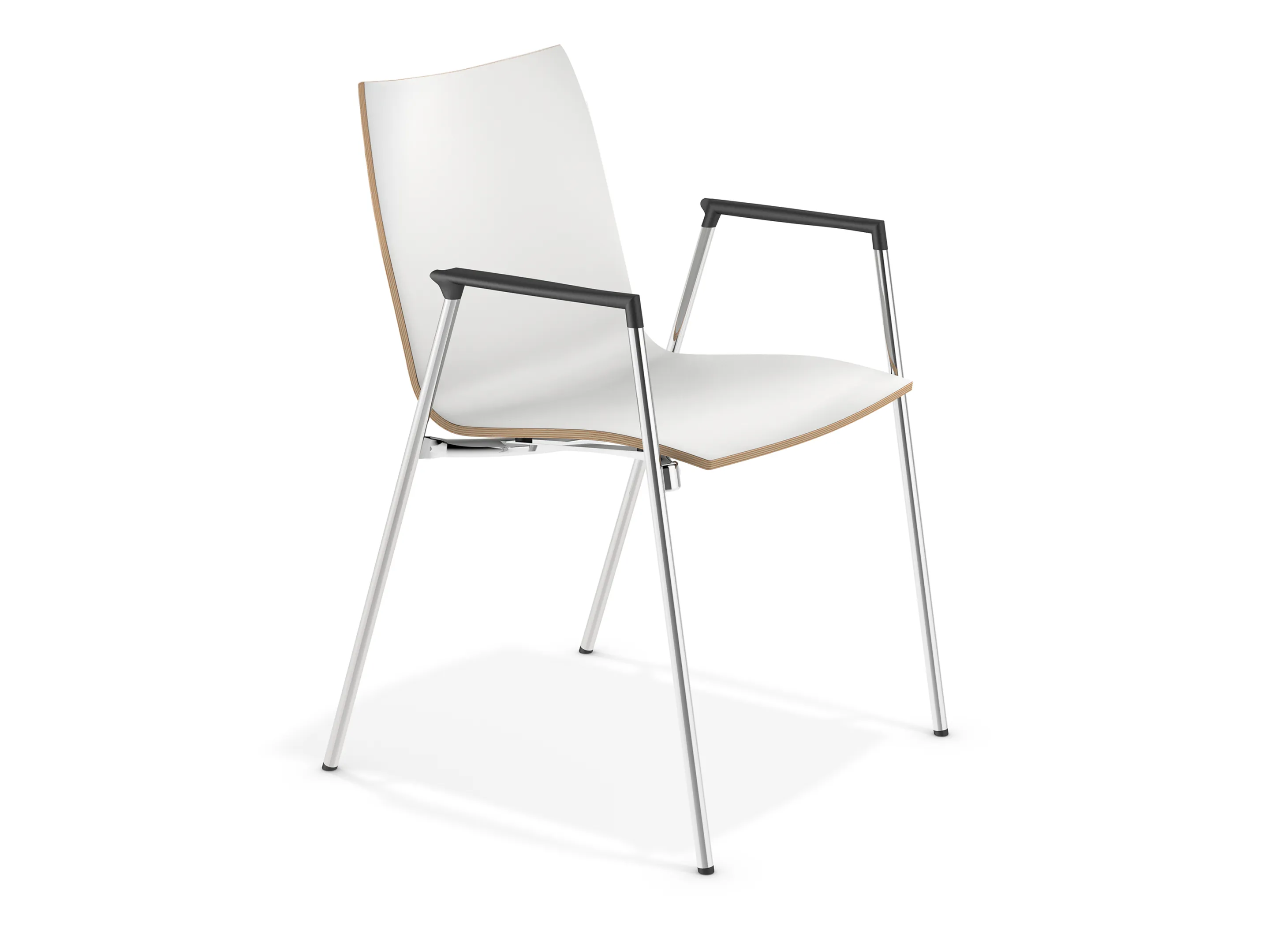 4-poots koppelbaar frame op kunststof glijders met een CPL kuip. Inclusief armleggers. Stapelbaar tot 12 stuks op transportwagen (verticaal stapelbaar) en 6 stuks vrijstaand.