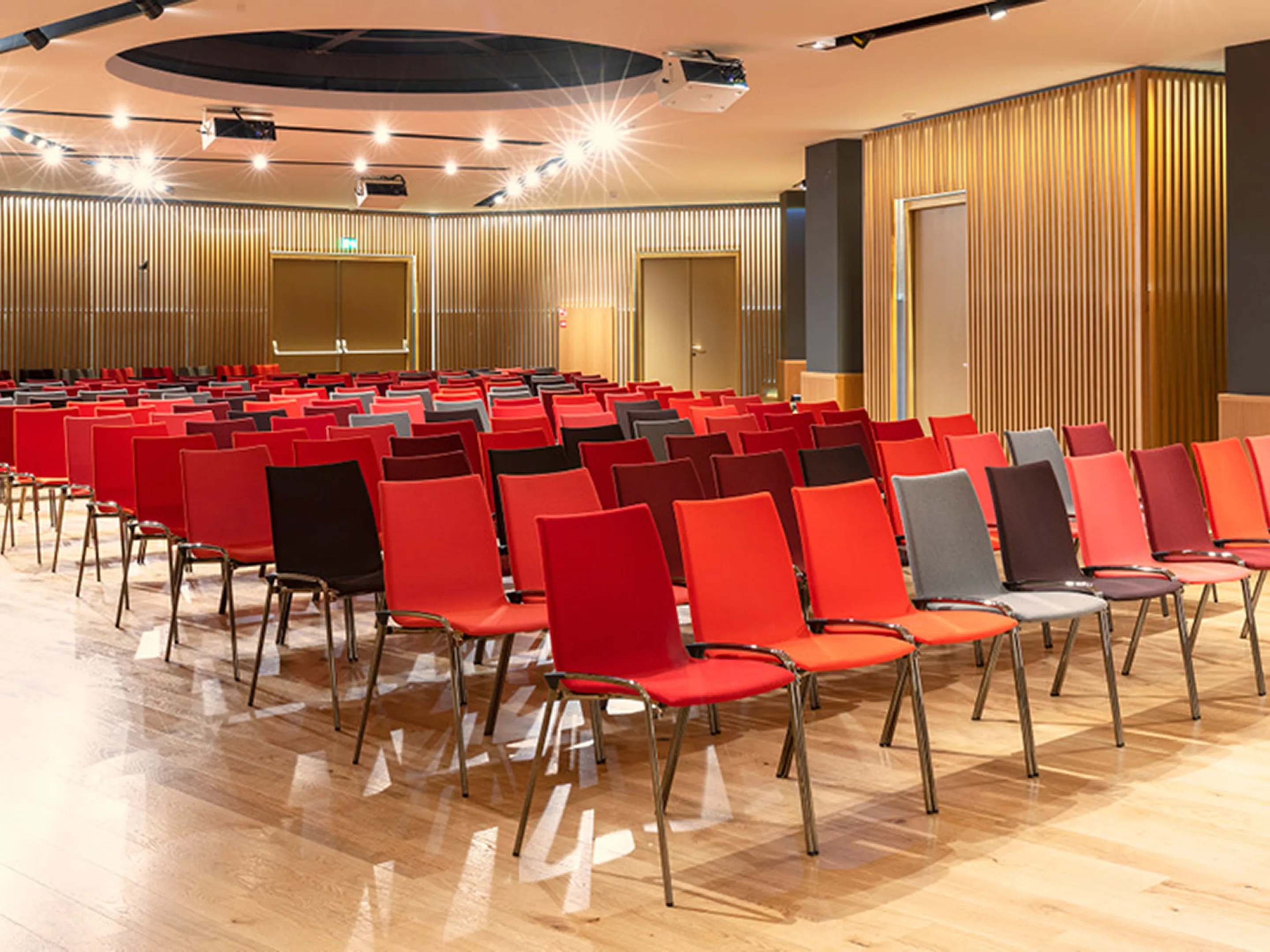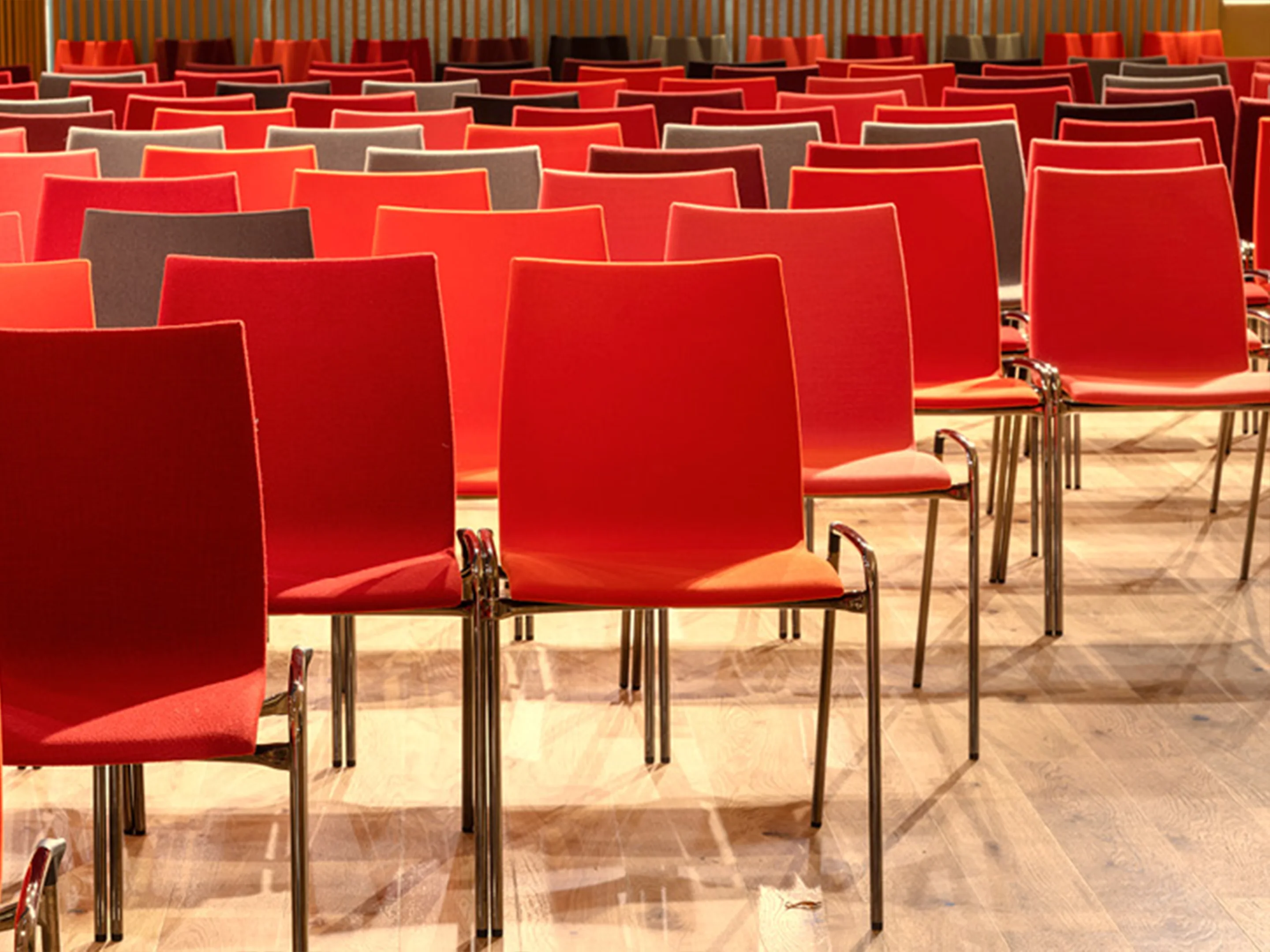 4-poots koppelbaar frame op kunststof glijders met een houten kuip zonder stoffering. Exclusief armleggers. Stapelbaar tot 12 stuks op transportwagen (verticaal stapelbaar) en 6 stuks vrijstaand.