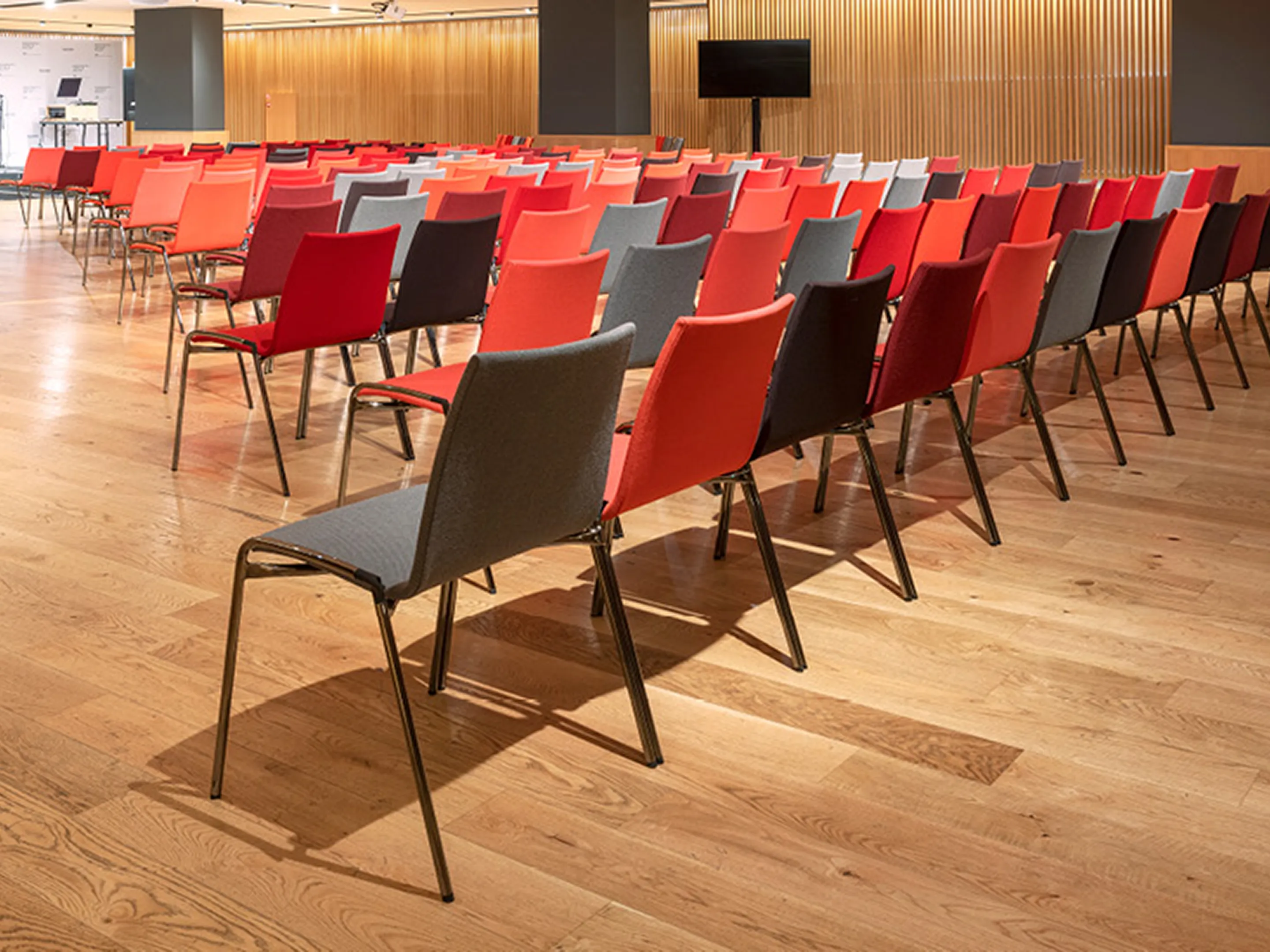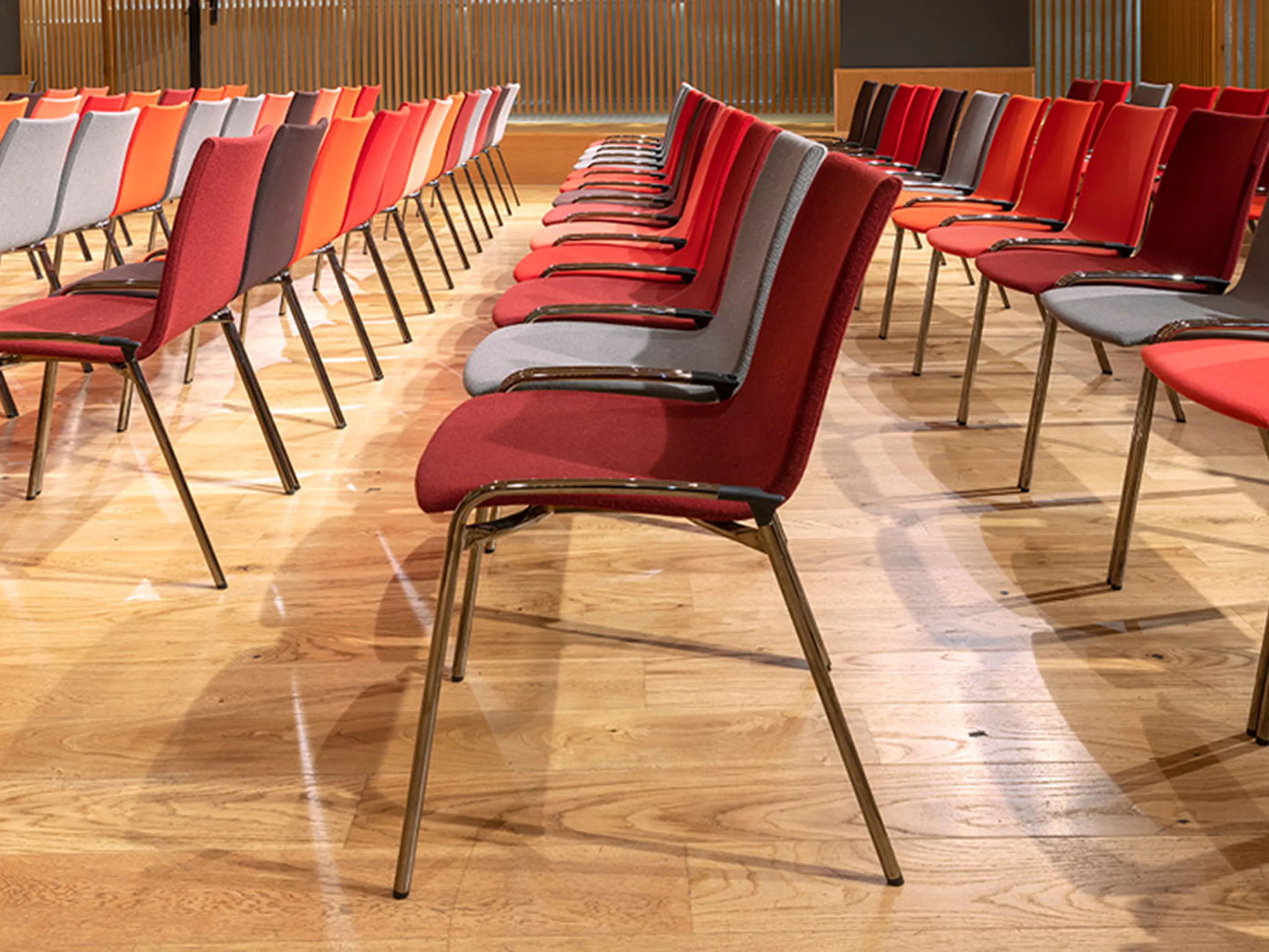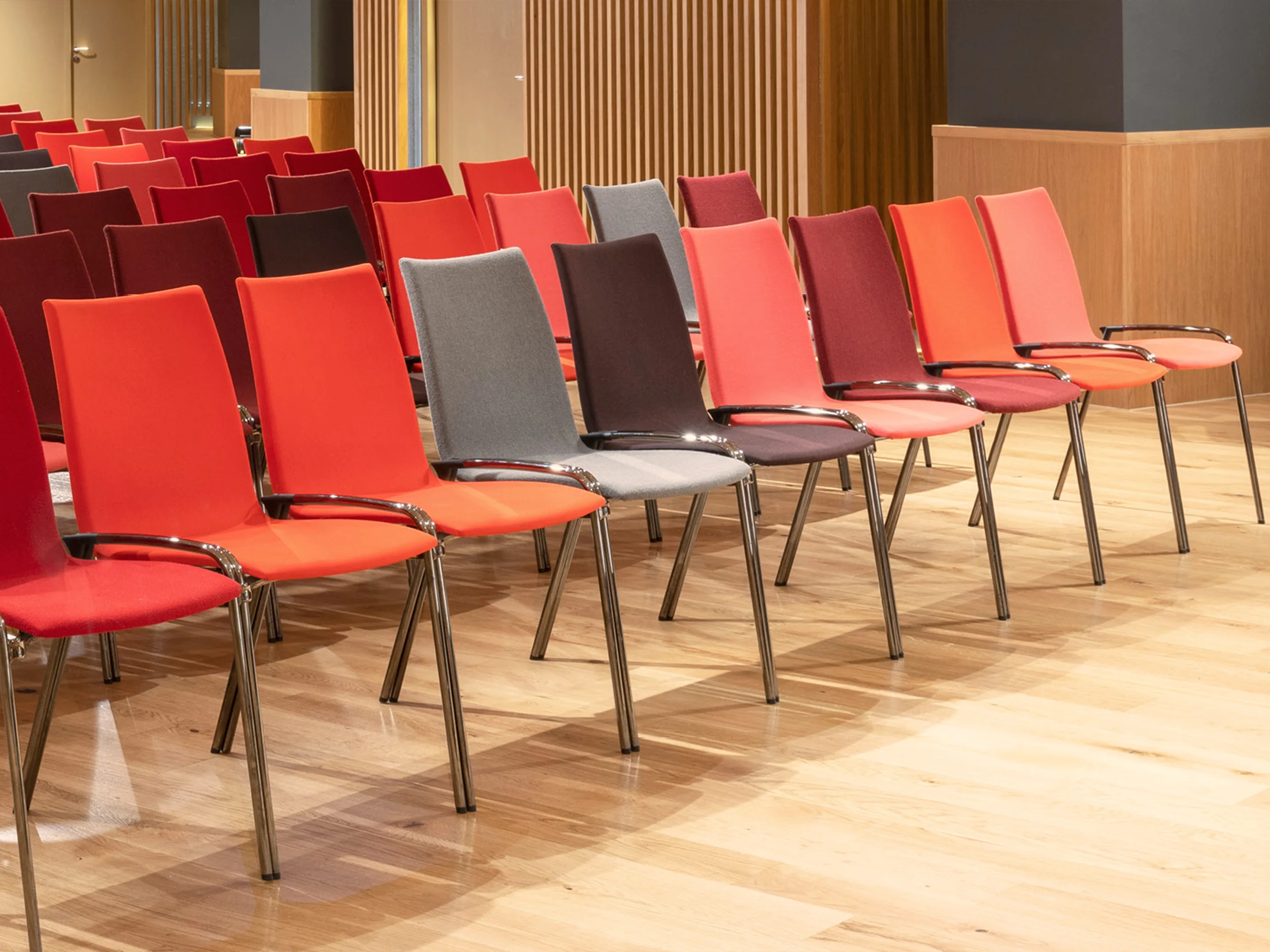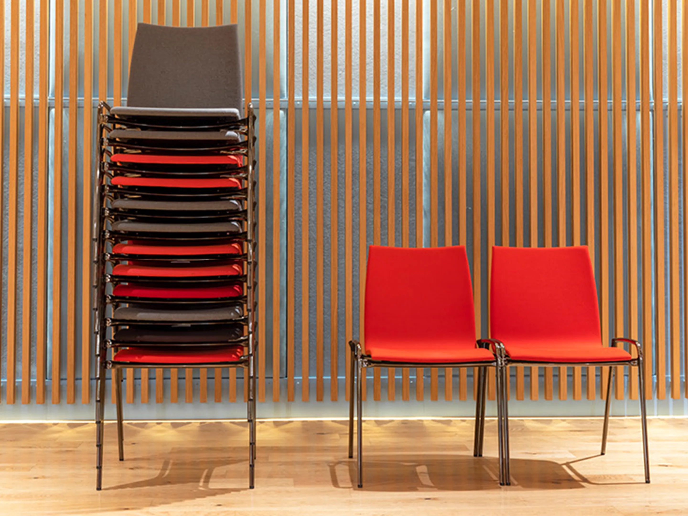 4-poots koppelbaar frame op kunststof glijders met een houten kuip met zitting opdekstoffering. Inclusief armleggers. Stapelbaar tot 12 stuks op transportwagen (verticaal stapelbaar) en 6 stuks vrijstaand.