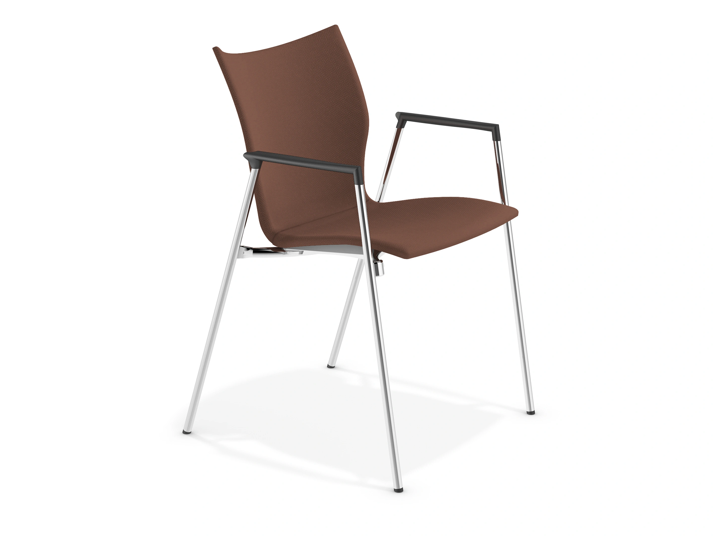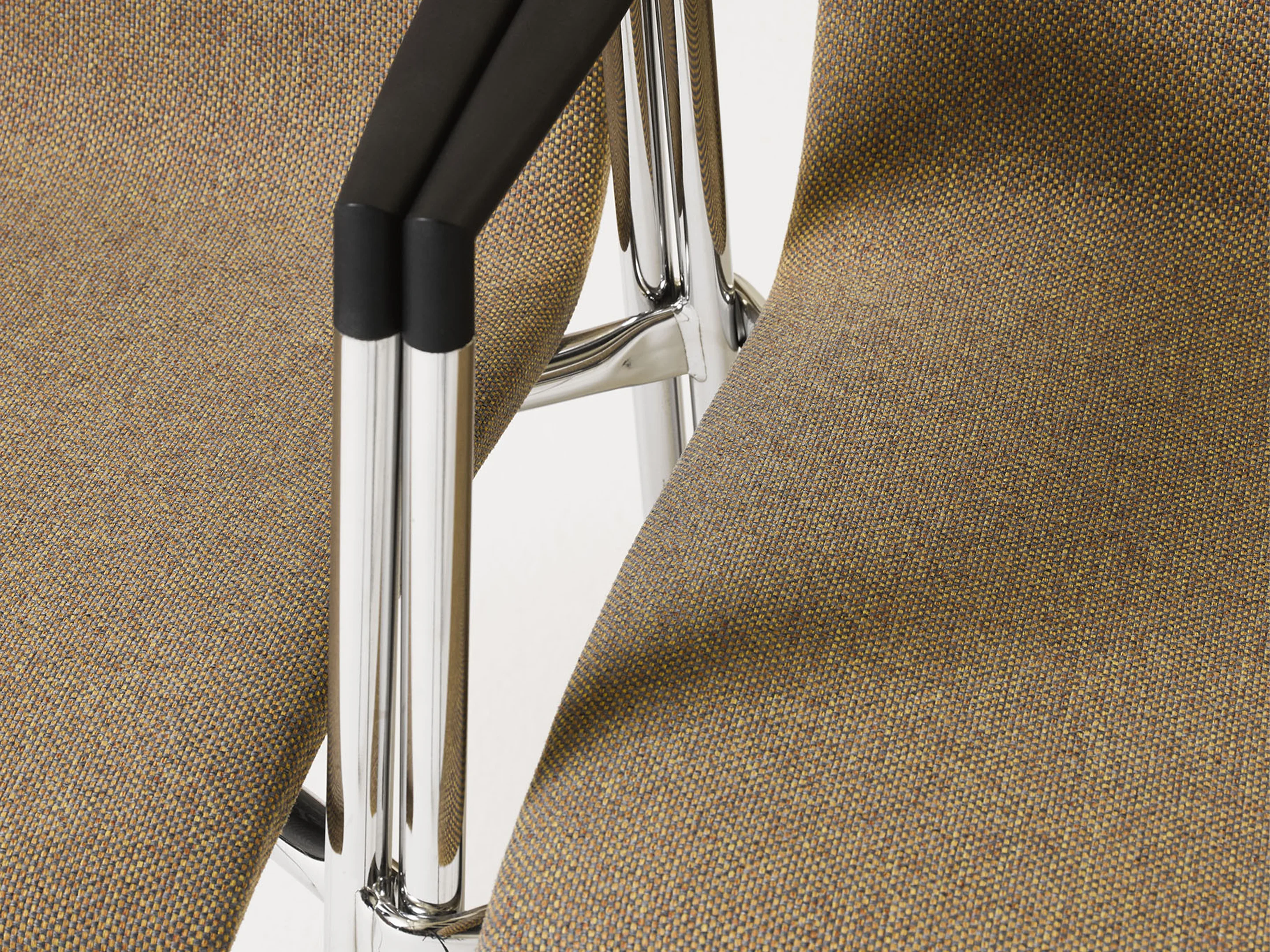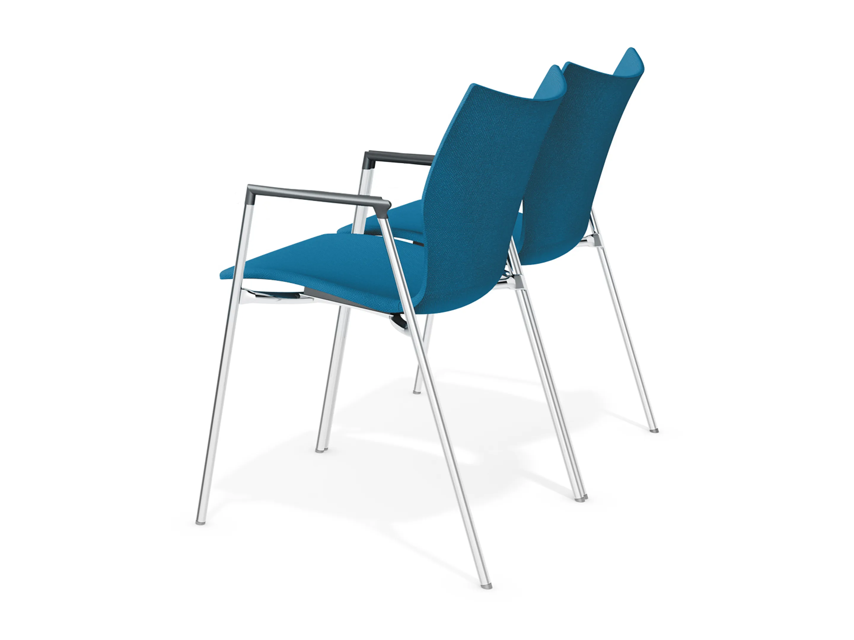 4-poots koppelbaar frame op kunststof glijders met een volledig gestoffeerde kuip. Inclusief armleggers. Stapelbaar tot 12 stuks op transportwagen (verticaal stapelbaar) en 6 stuks vrijstaand.