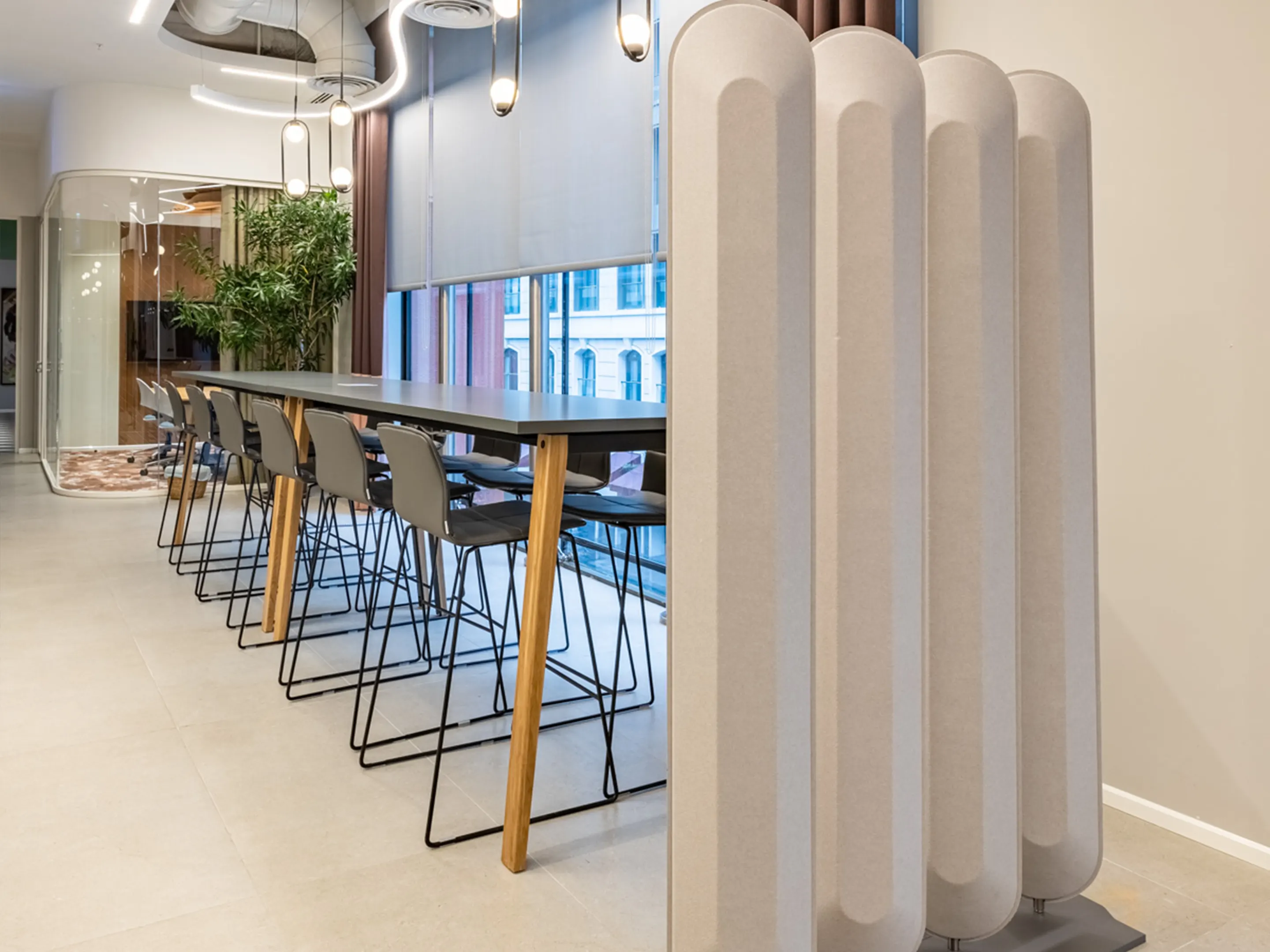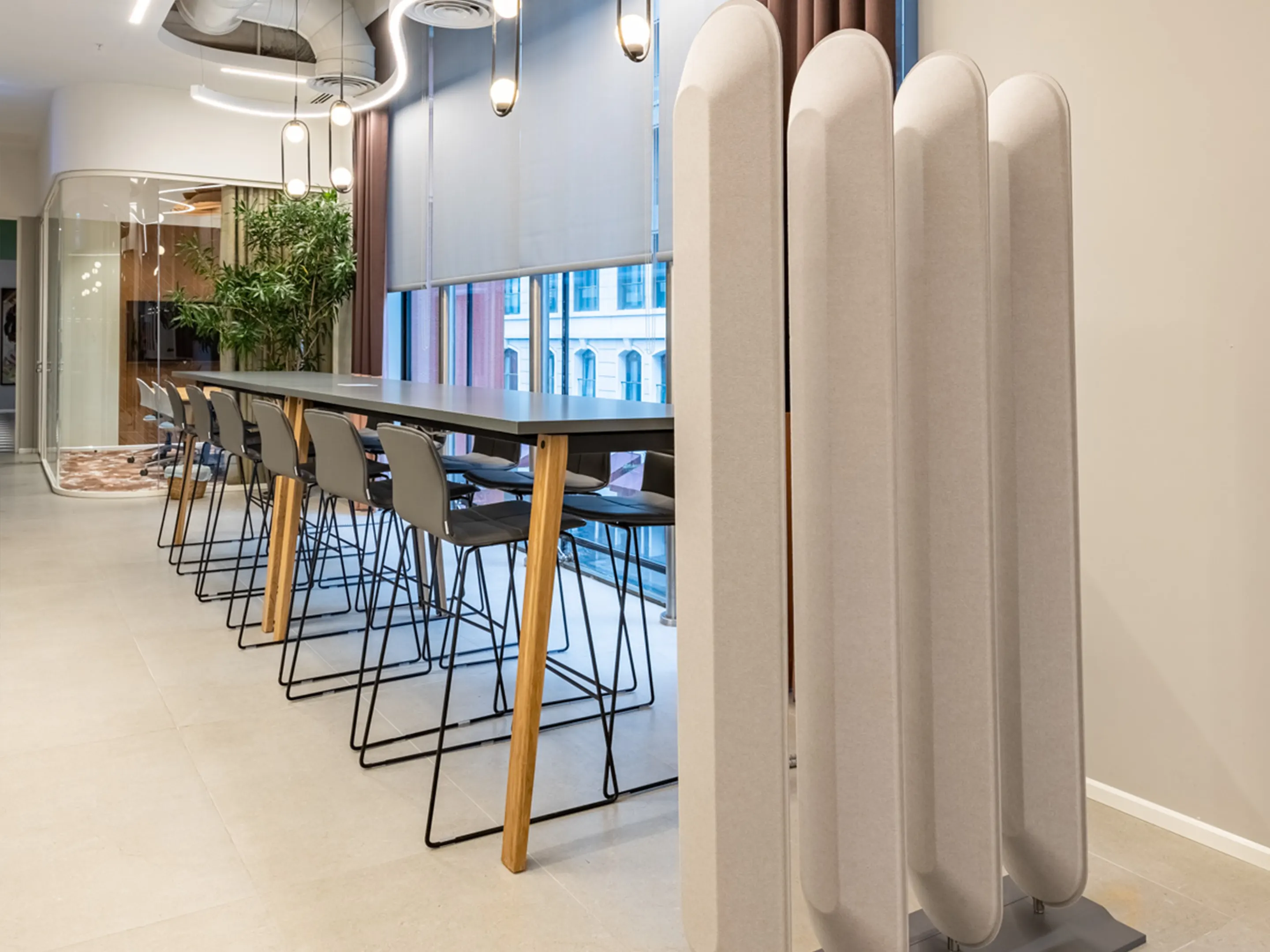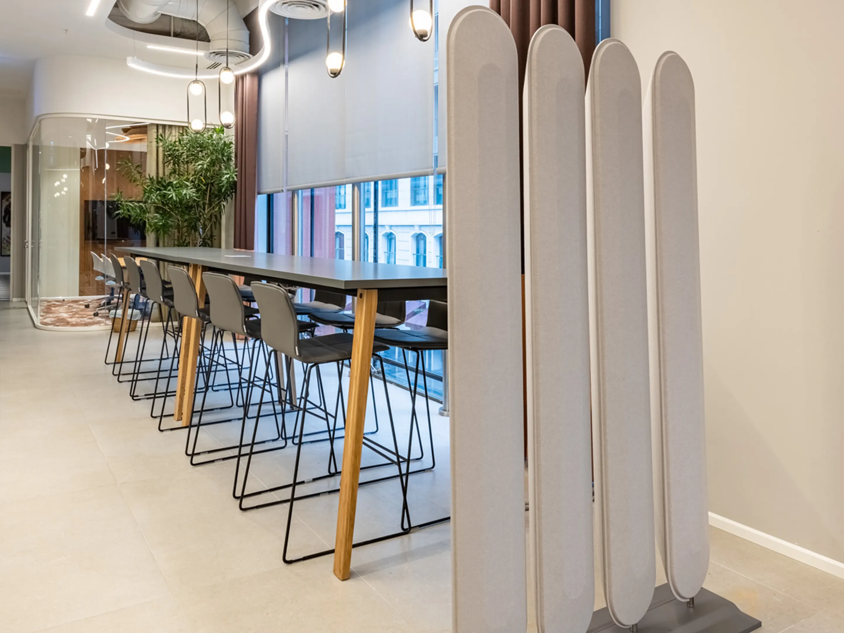 Vrijstaande akoestische panelen met een drievoudig systeem op een voetplaat van 81x31,5cm (bxd) en een NRC Waarde van 0,78.