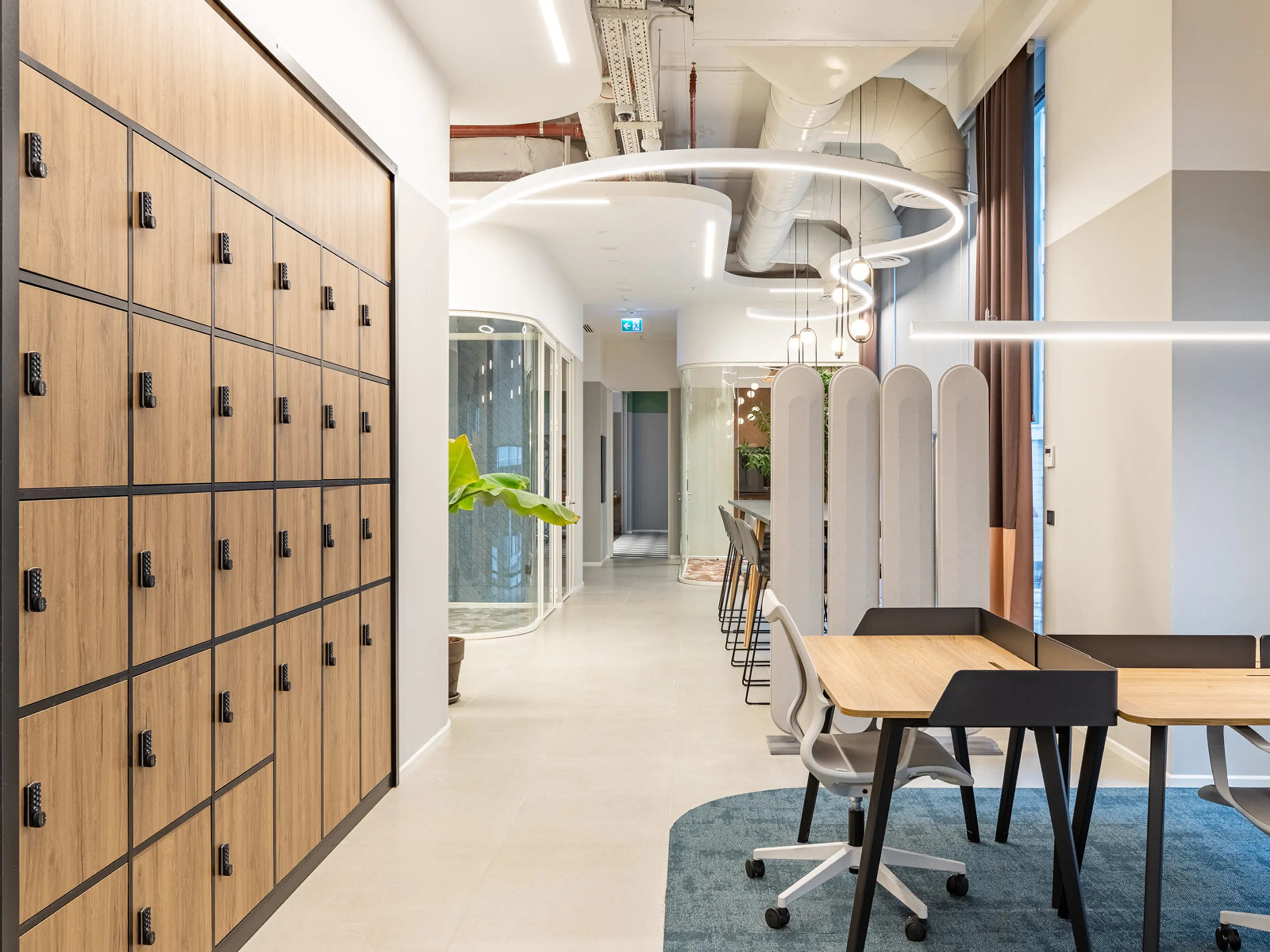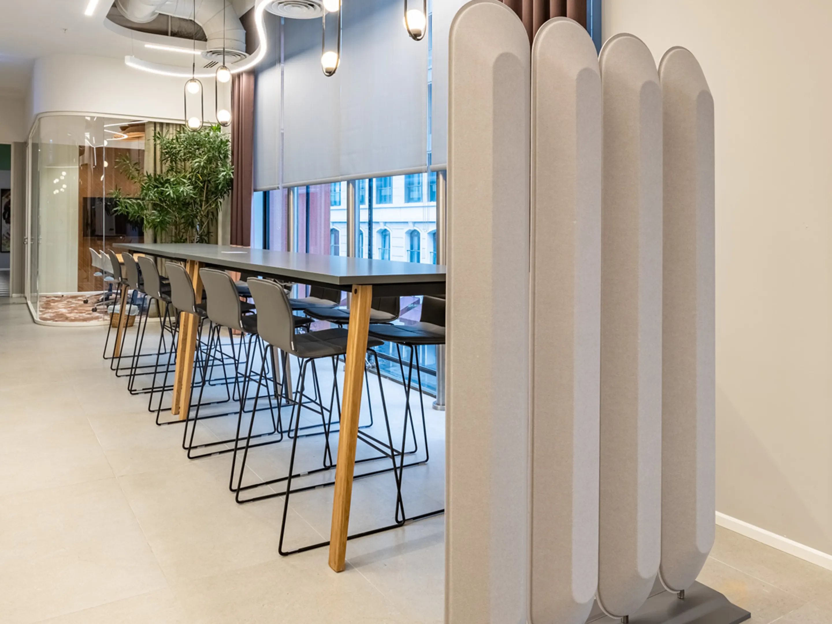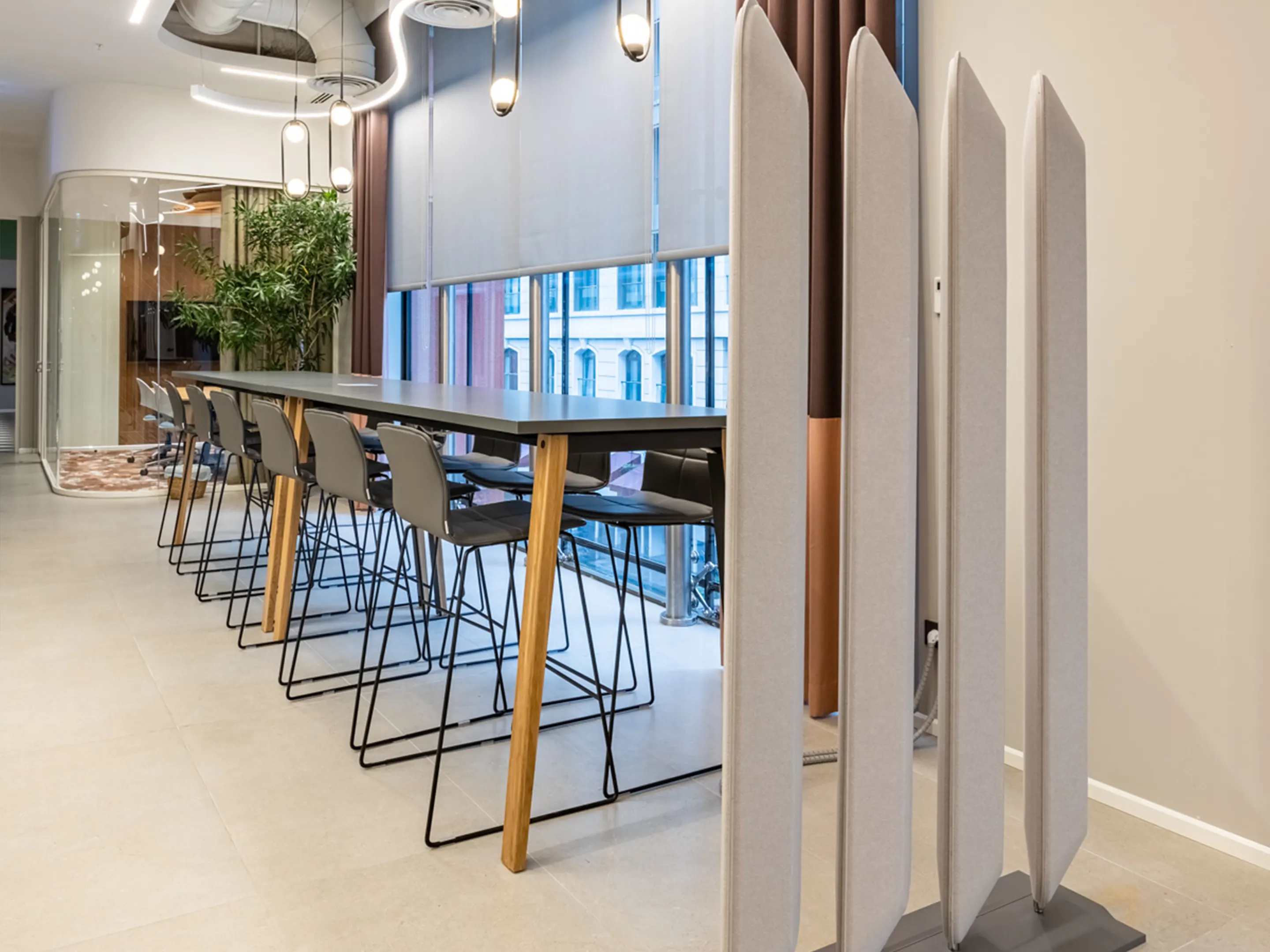 Vrijstaande akoestische panelen met een drievoudig systeem op een voetplaat van 81x31,5cm (bxd) en een NRC Waarde van 0,78.