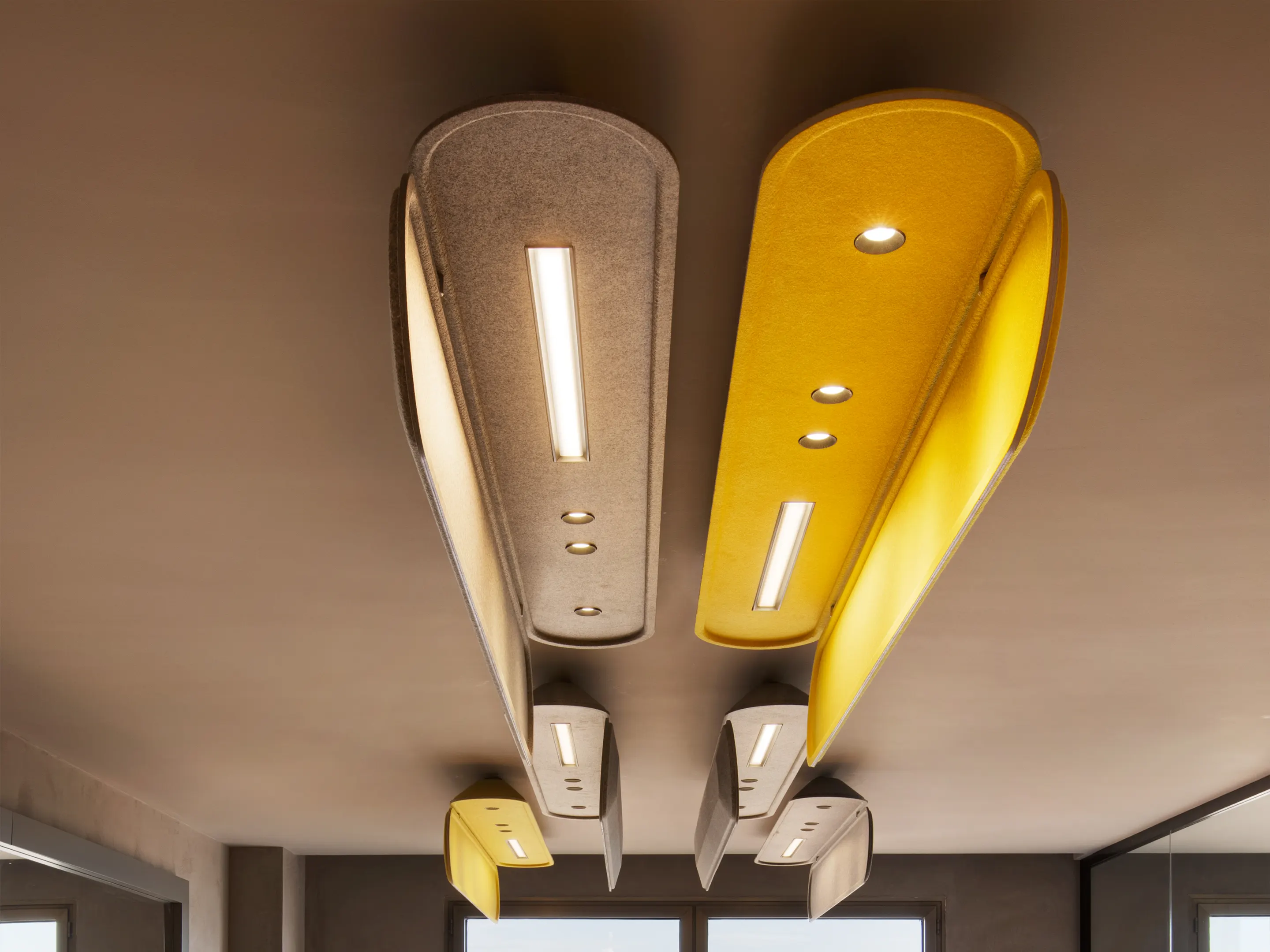 Akoestische hanglamp incl. 25W LED lijn- en spotverlichting. Incl. frame, ophangset en installatiehandleiding.