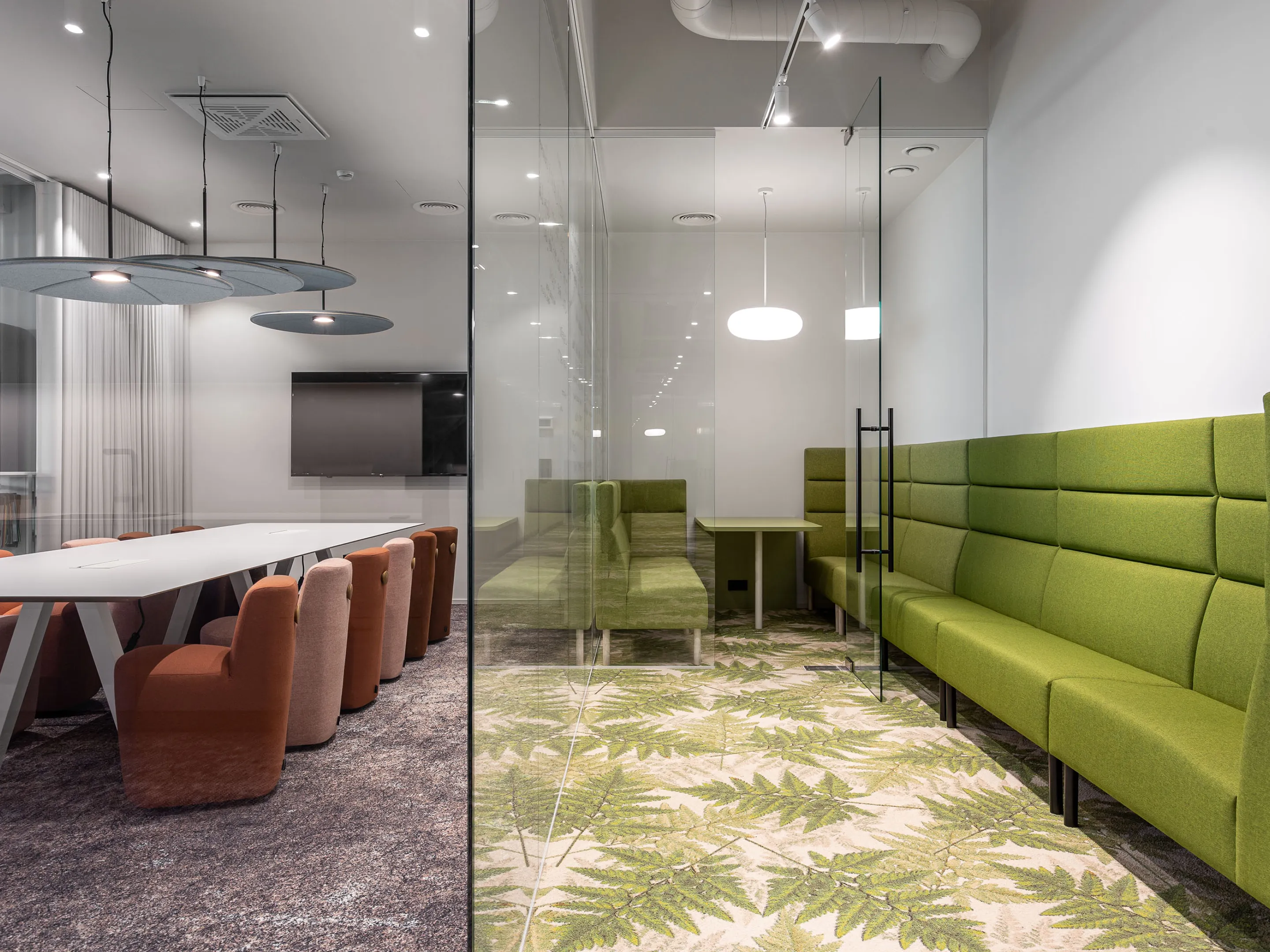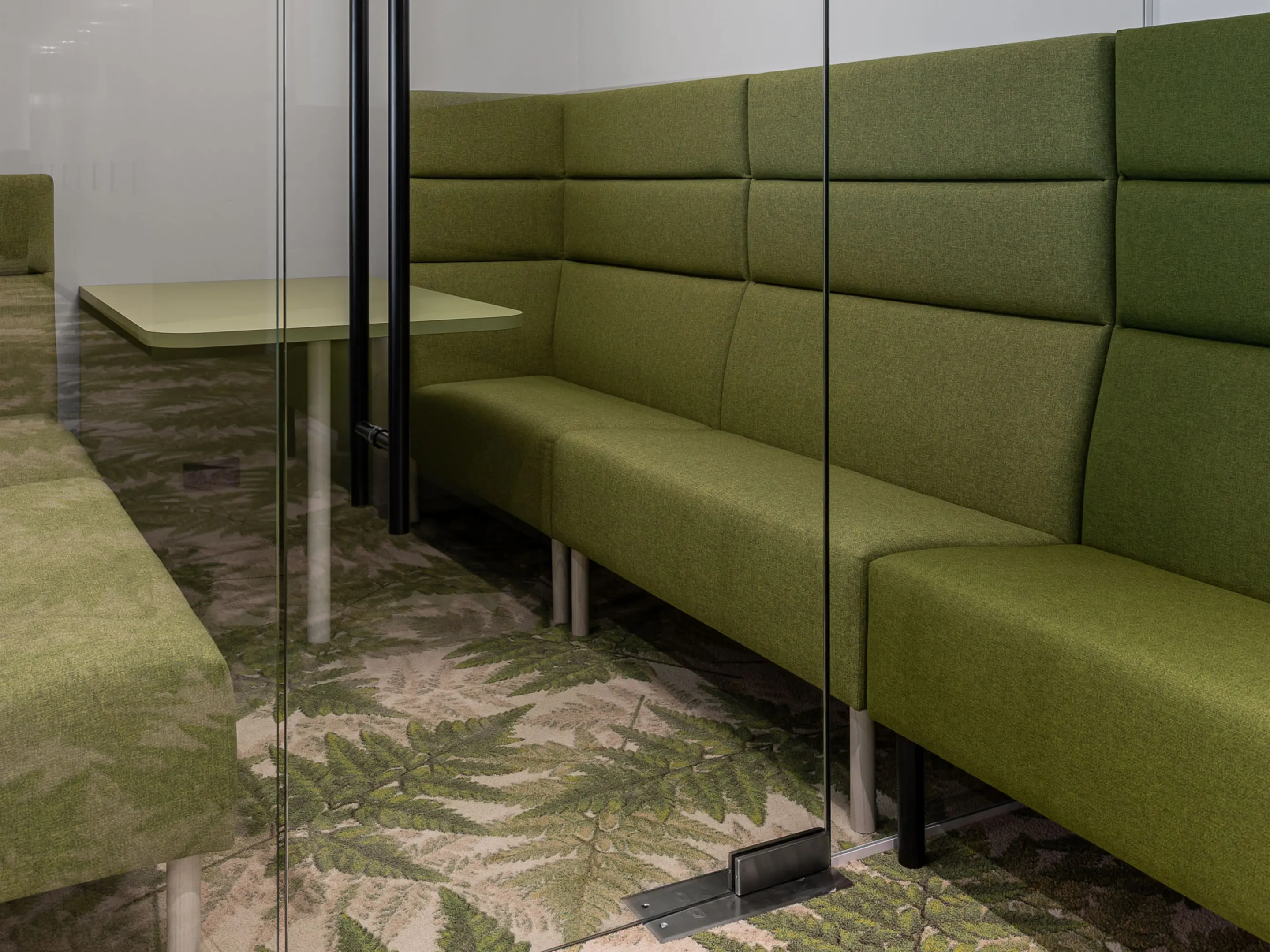 Volledig gestoffeerde POD met 2x 3-zits bank tegenover elkaar met extra hoge ombouw aan de zijkanten en achterkant op een 8-poots onderstel. 2150 x 1950 x 1280 mm (B x D x H). Excl. tafel. Deze moet los worden bijbesteld.