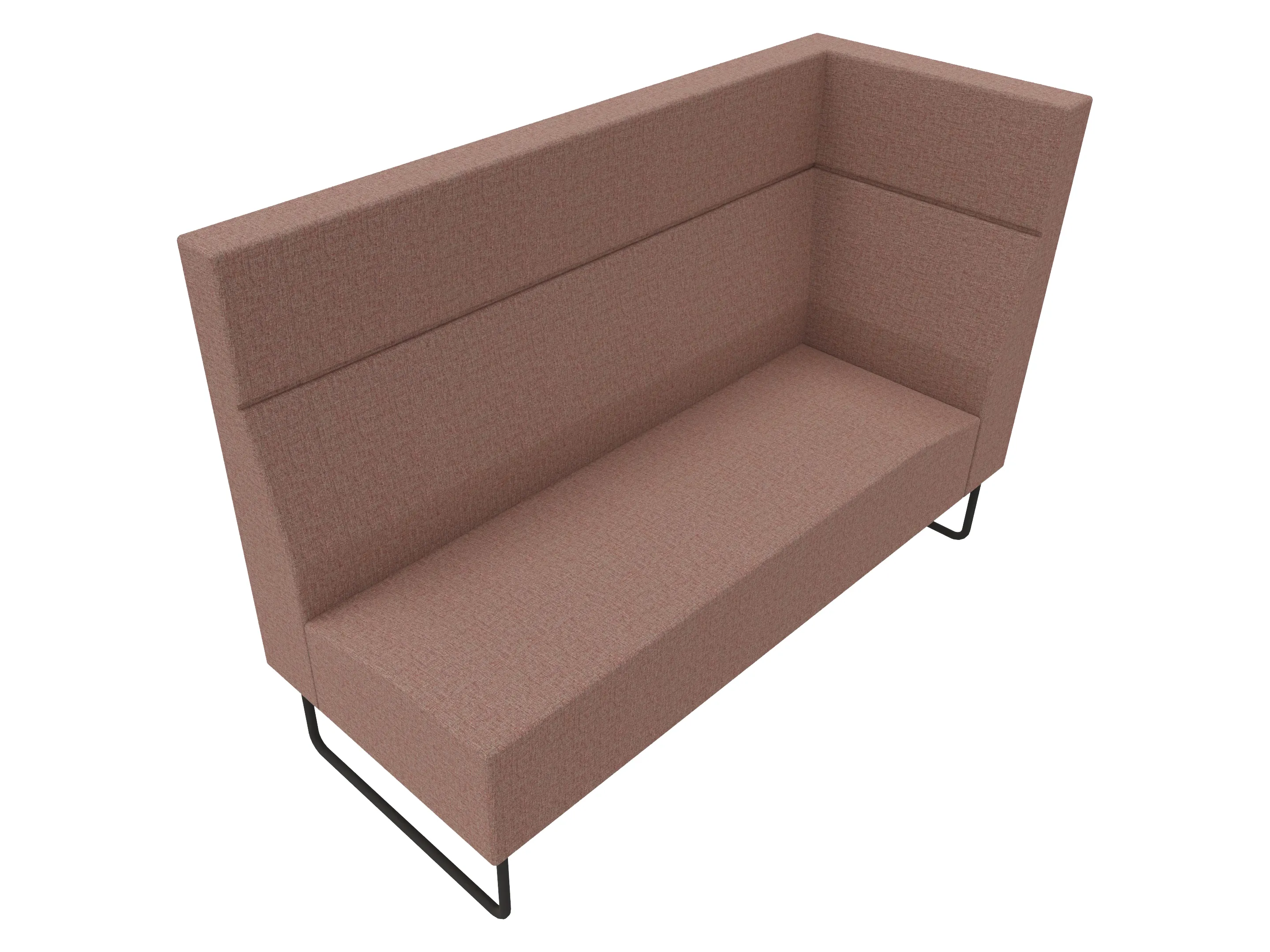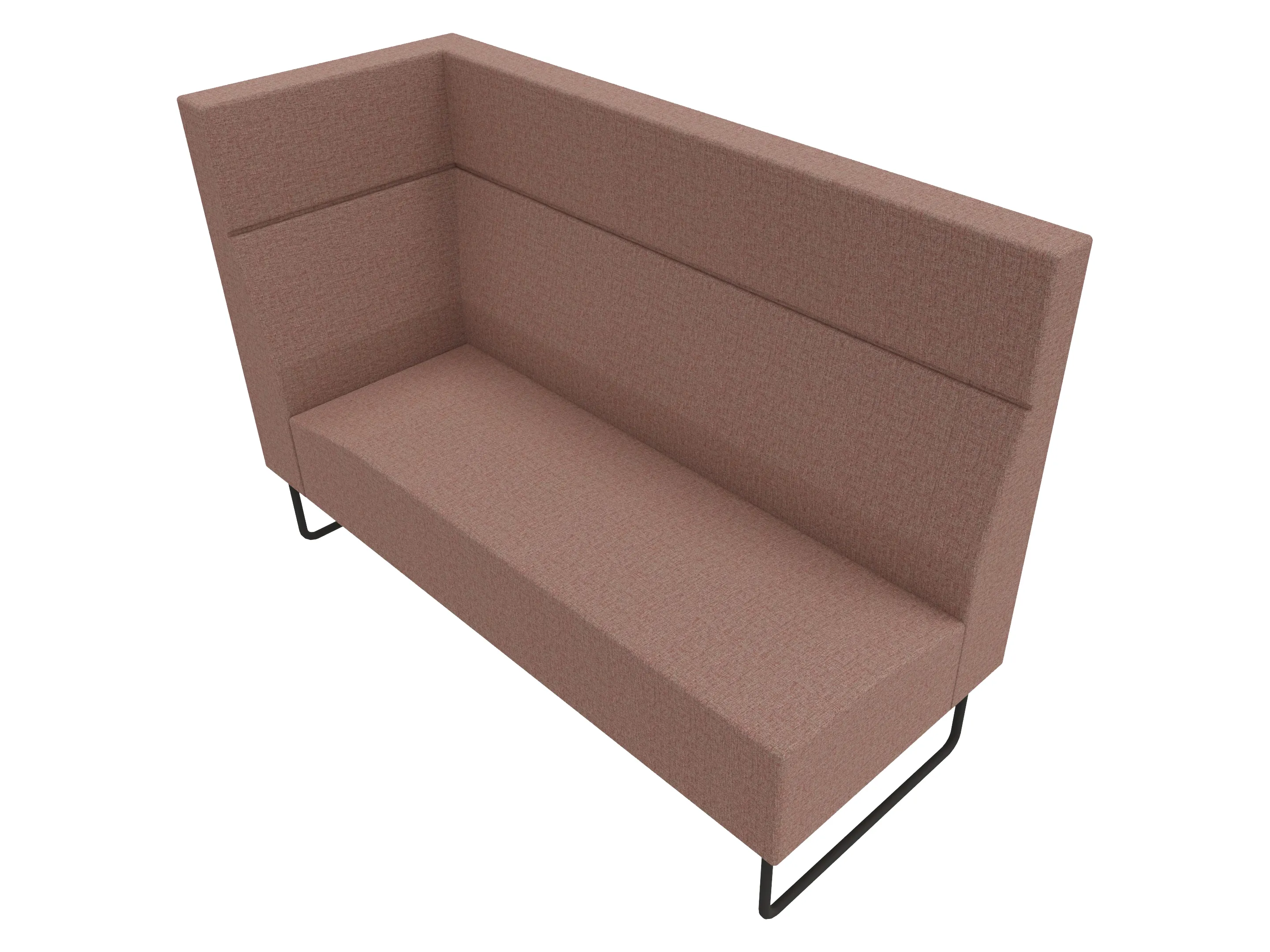 Volledige gestoffeerde bank van 620mm breed, hoekstuk, armleuning rechts voorstaand gezien, extra hoge rug (1280mm totale hoogte) op een sledeframe.