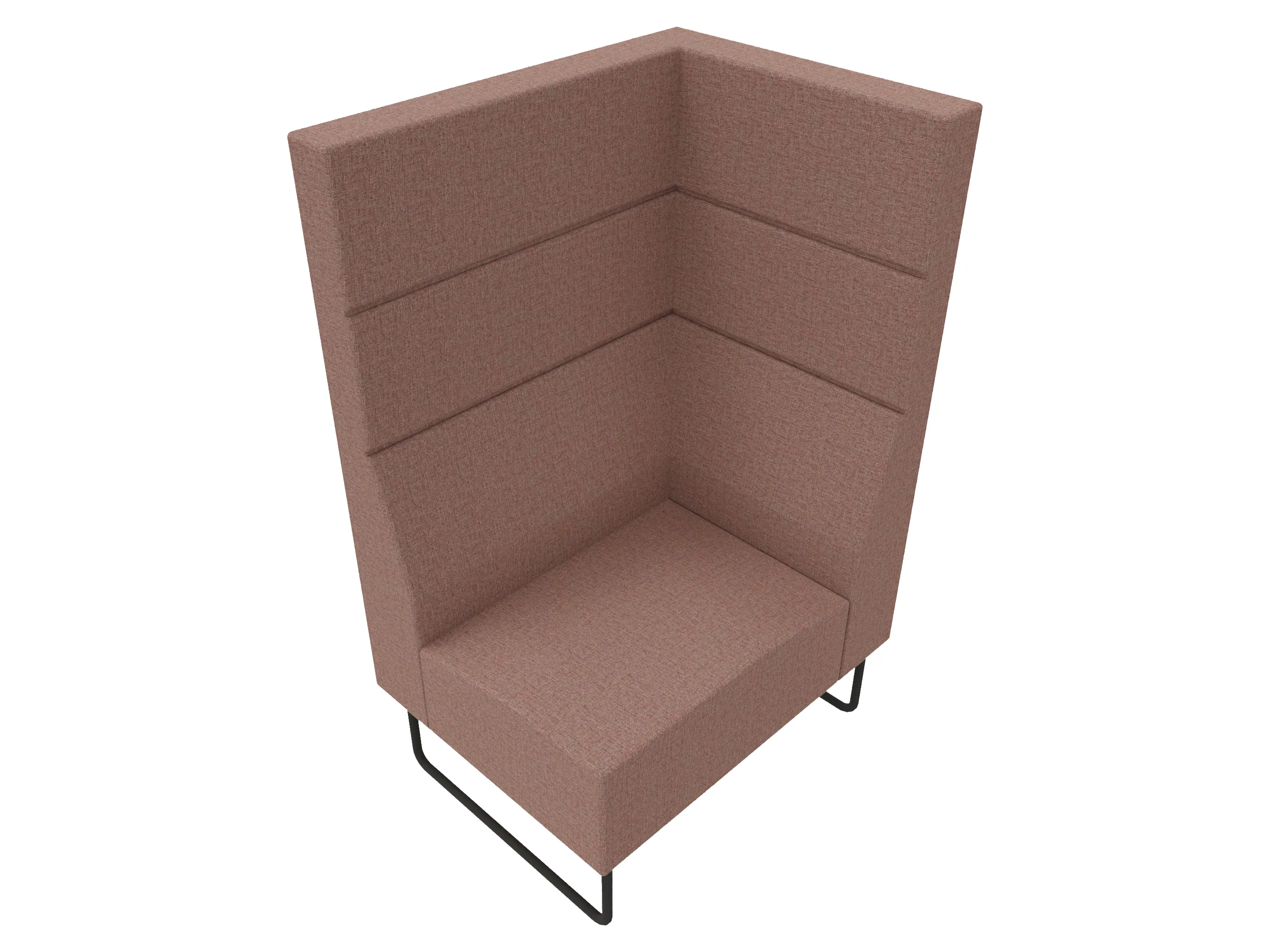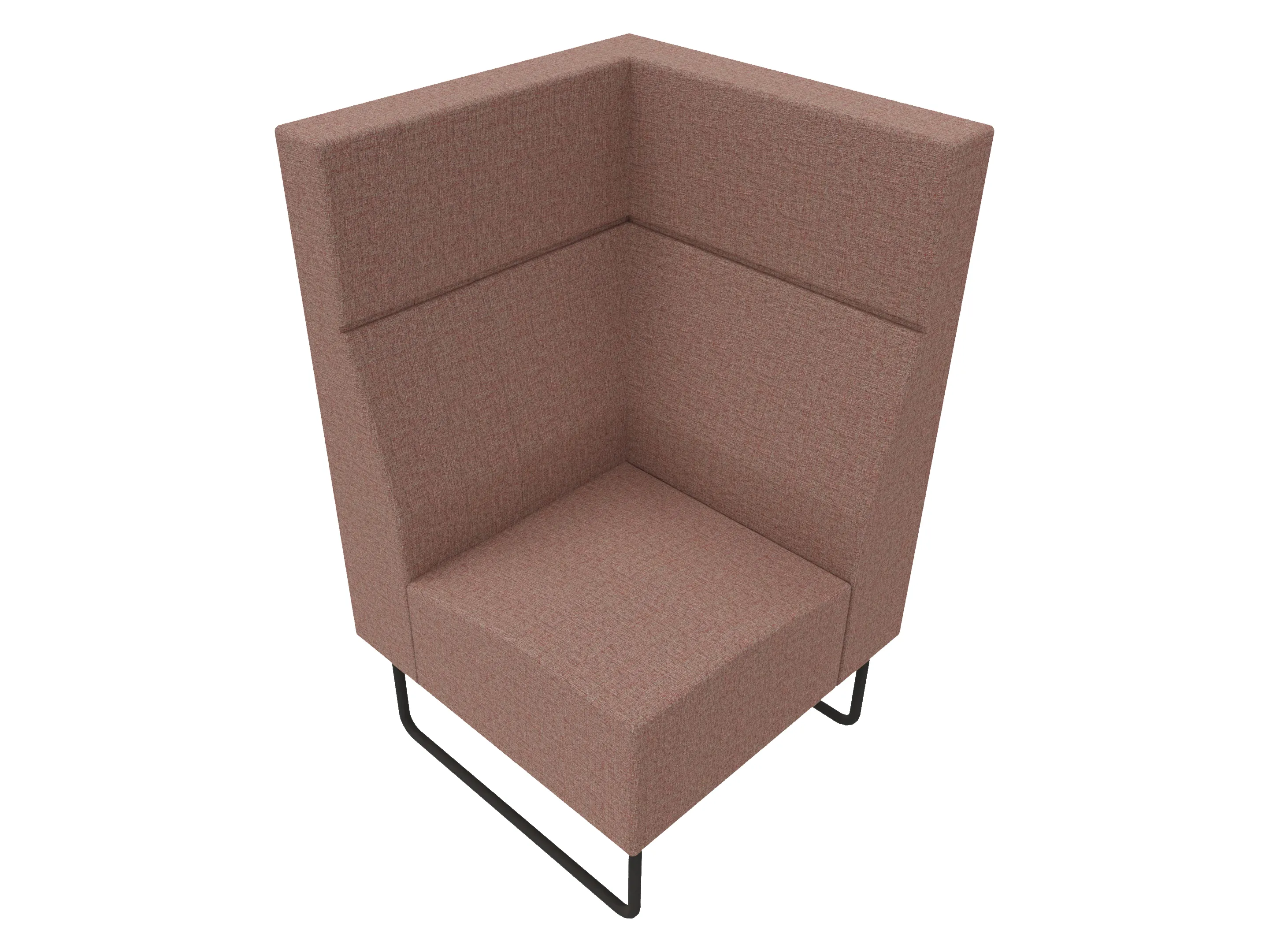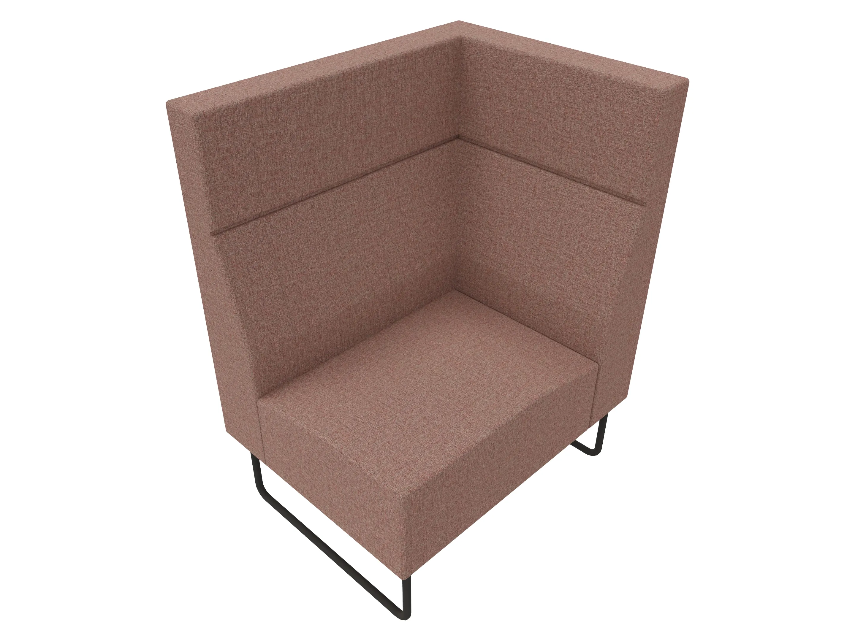 Volledige gestoffeerde bank van 1000mm breed, hoekstuk, armleuning rechts voorstaand gezien, extra hoge rug (1280mm totale hoogte) op een sledeframe.
