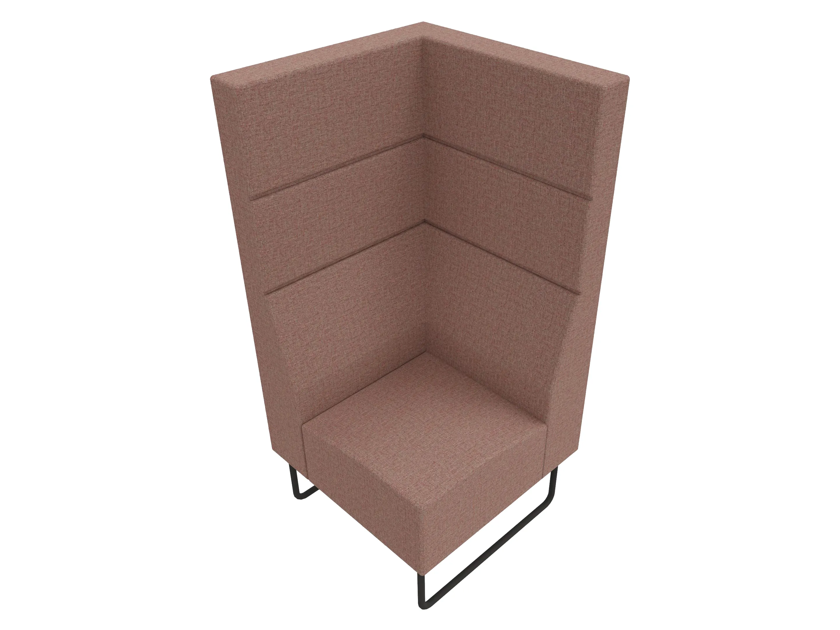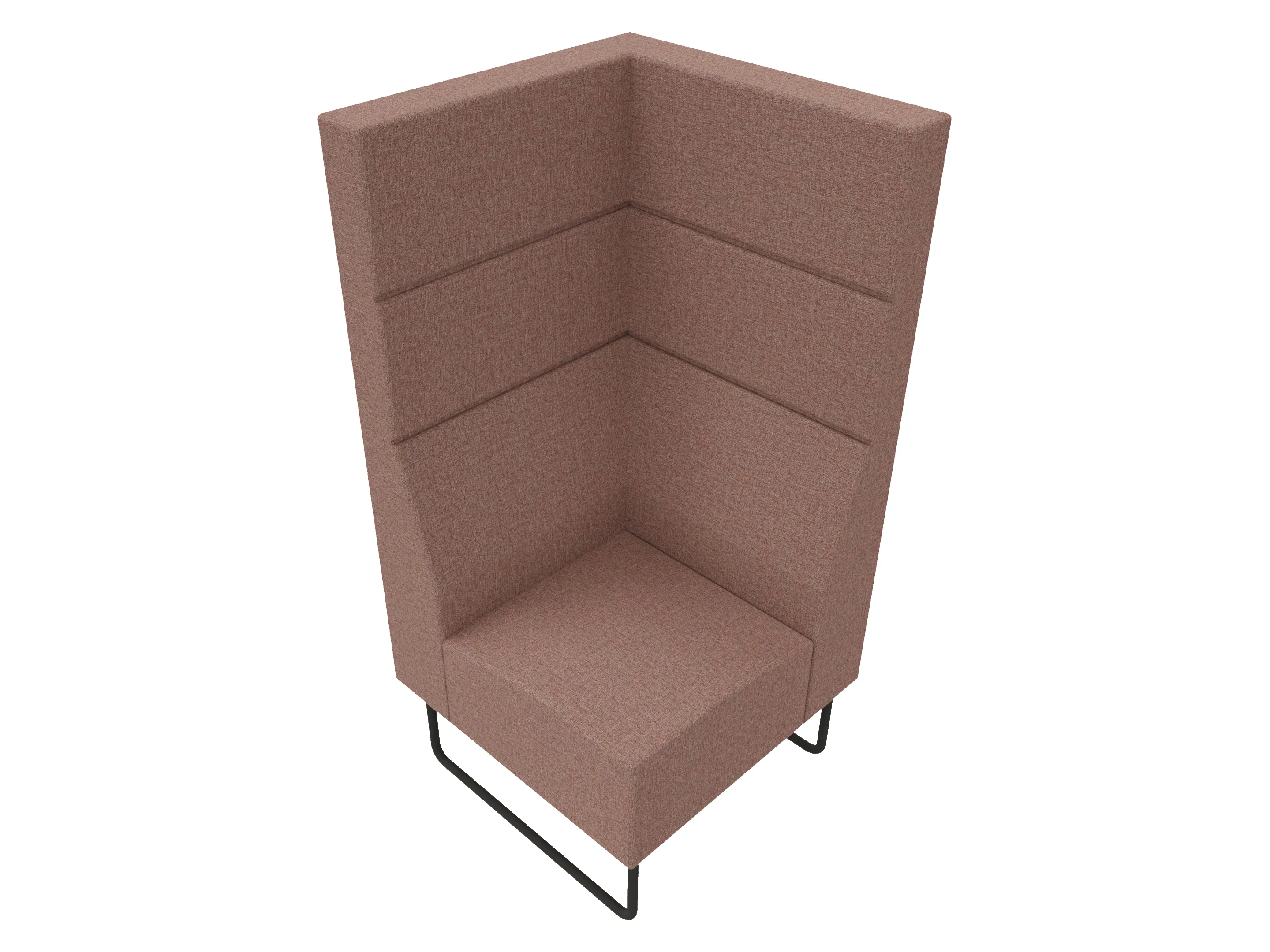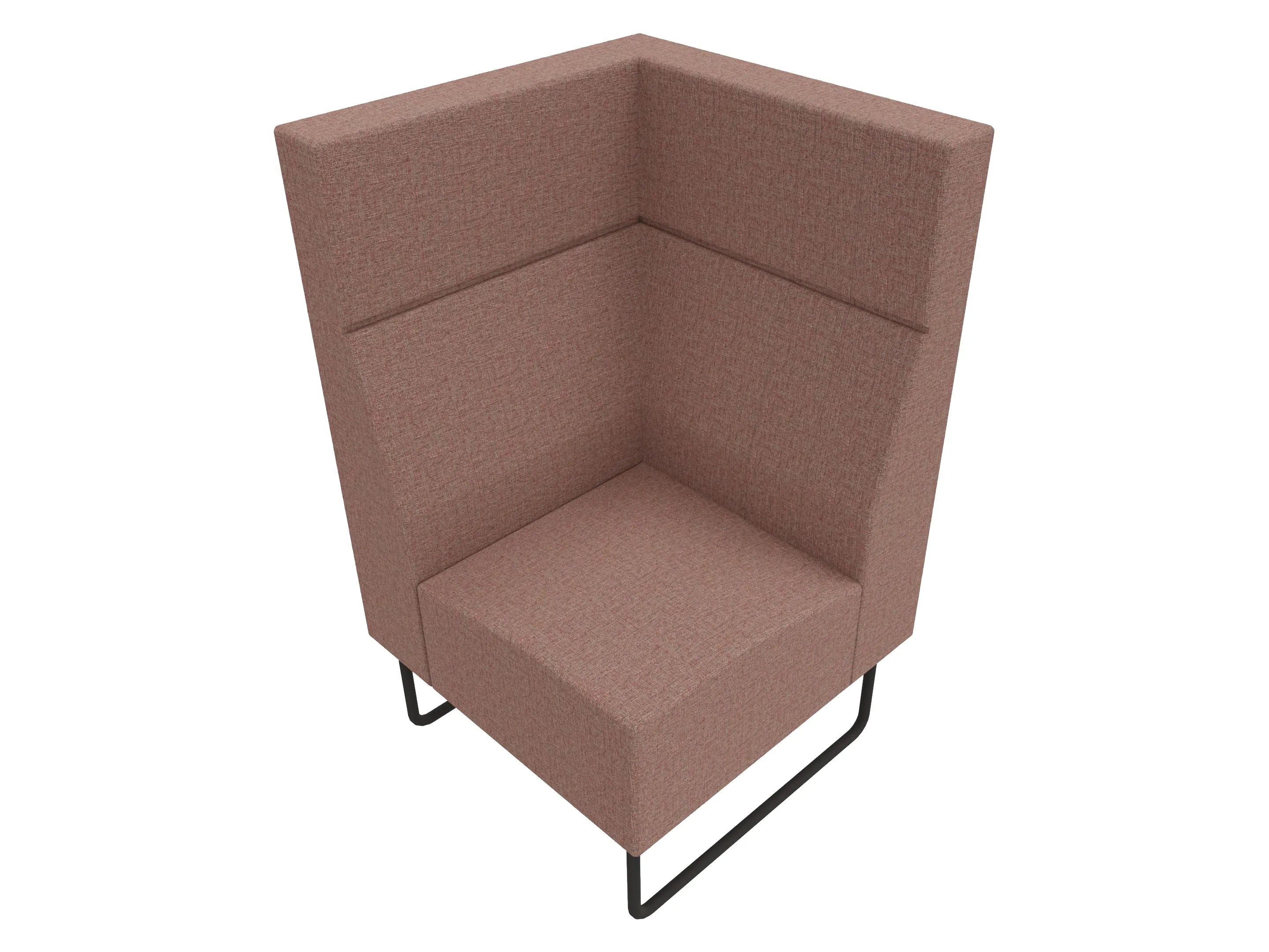 Volledige gestoffeerde bank van 1000mm breed, hoekstuk, armleuning rechts voorstaand gezien, extra hoge rug (1280mm totale hoogte) op een sledeframe.