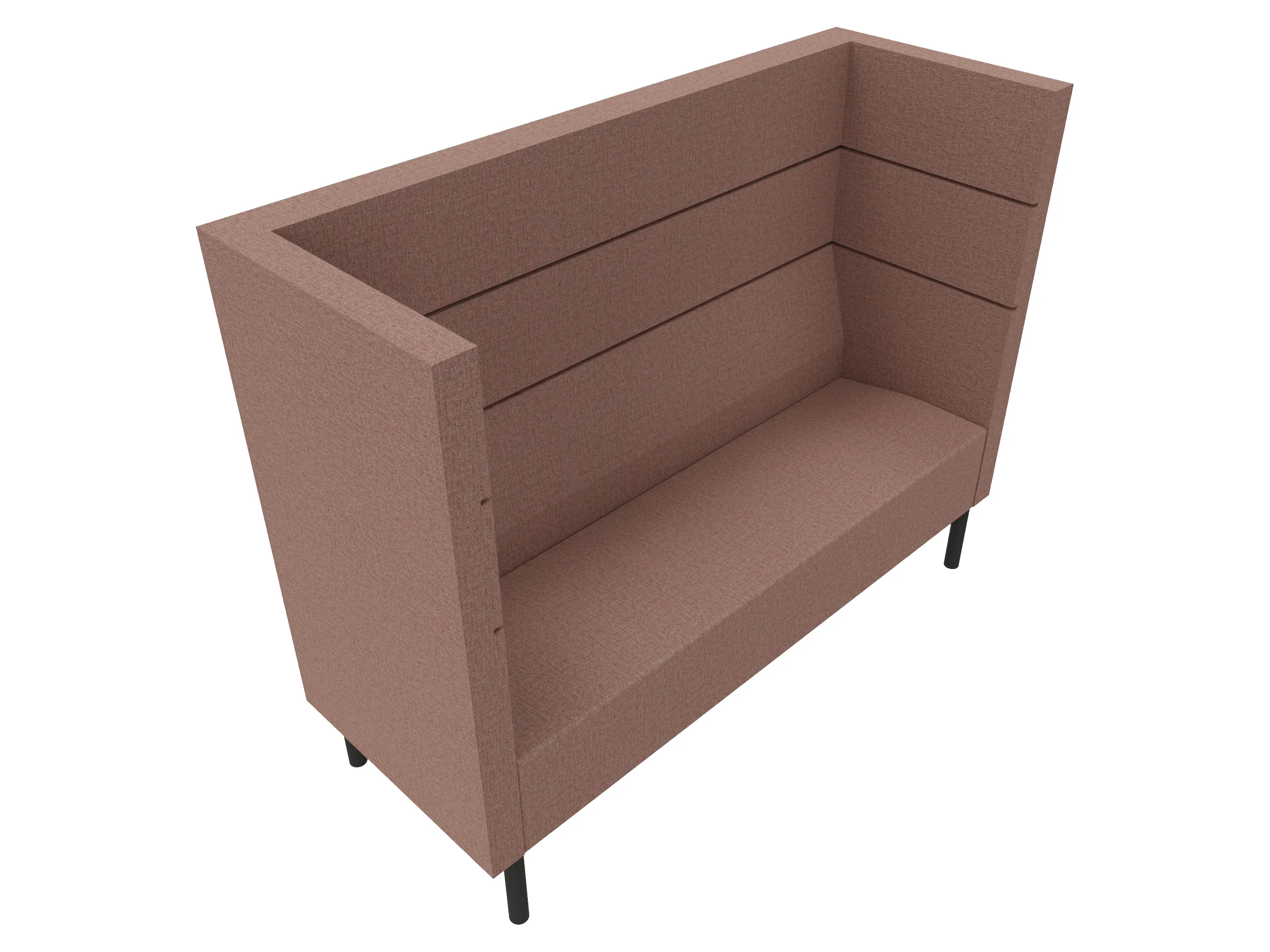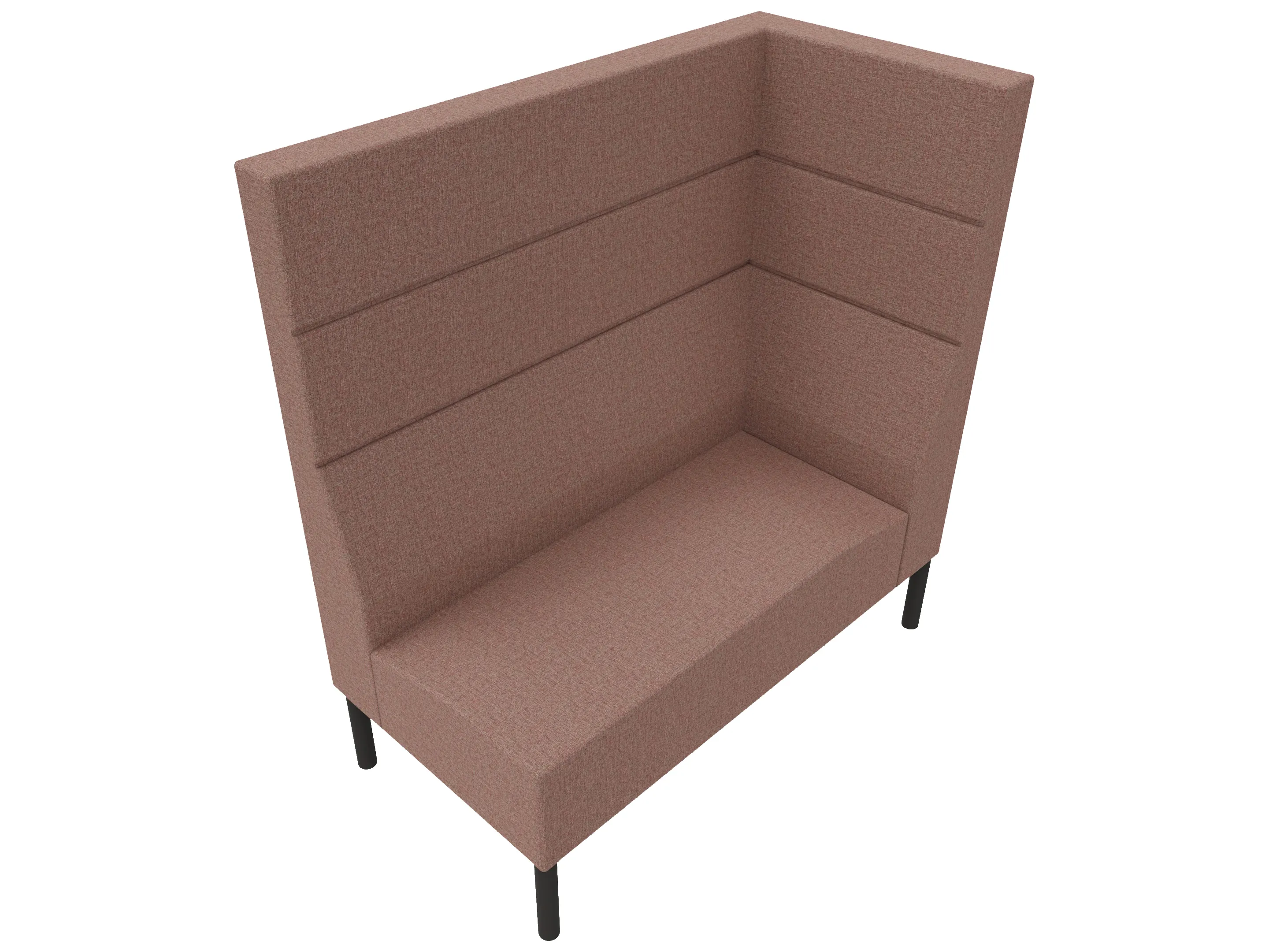 Volledig gestoffeerde 2-zits bank met extra hoge ombouw aan de zijkanten en achterkant op een 4-poots frame. 1650 x 620 x 1280mm (B x D x H).