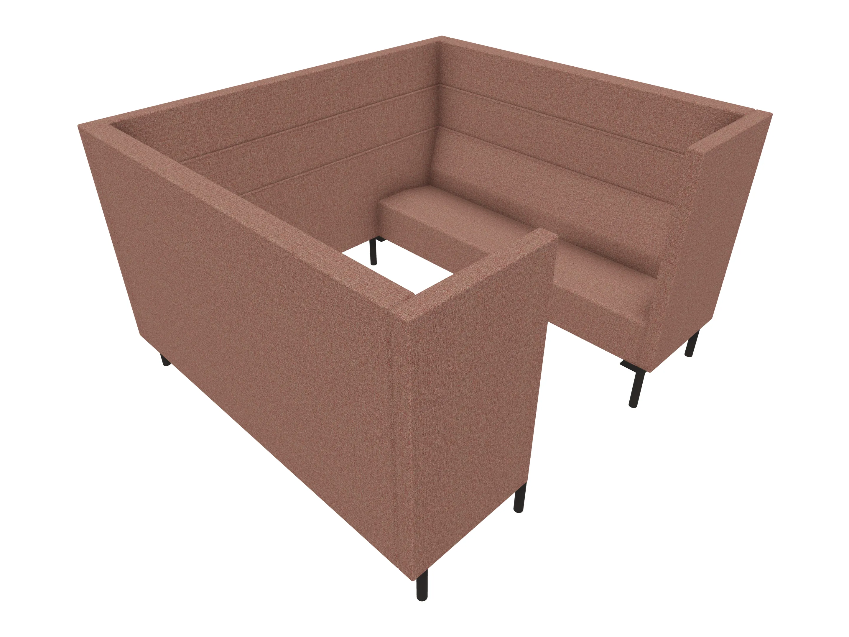 Volledig gestoffeerde POD met 2x 2-zits bank tegenover elkaar met extra hoge ombouw aan de zijkanten en achterkant op een 8-poots onderstel. 2150 x 1650 x 1280 mm (B x D x H). Excl. tafel. Deze moet los worden bijbesteld.