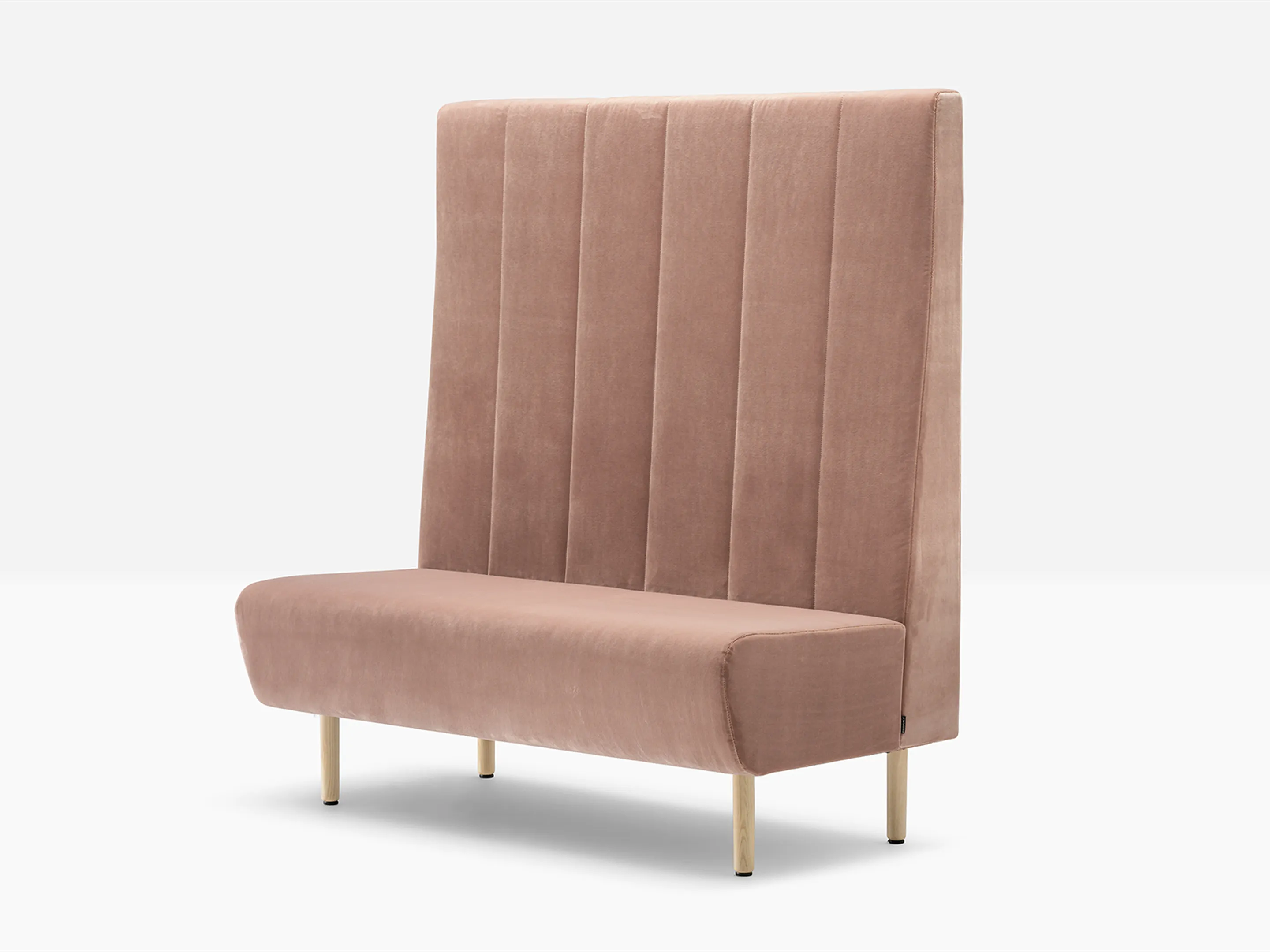 Treinbank volledig gestoffeerd, gemonteerd op ronde houten poten. Standaard vlak gestoffeerd. Afmeting: 1000 x 640 x 1400mm (BxDxH)