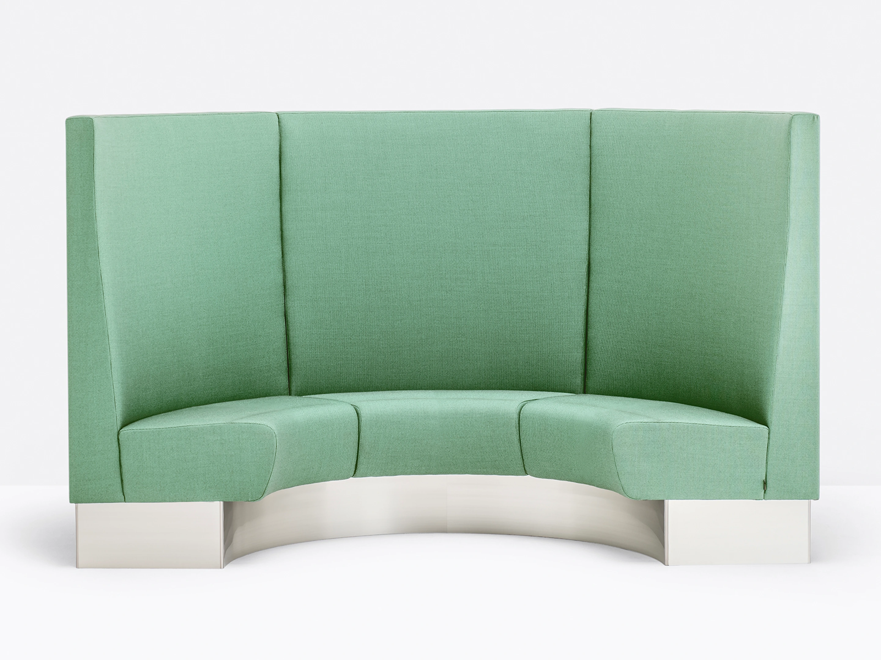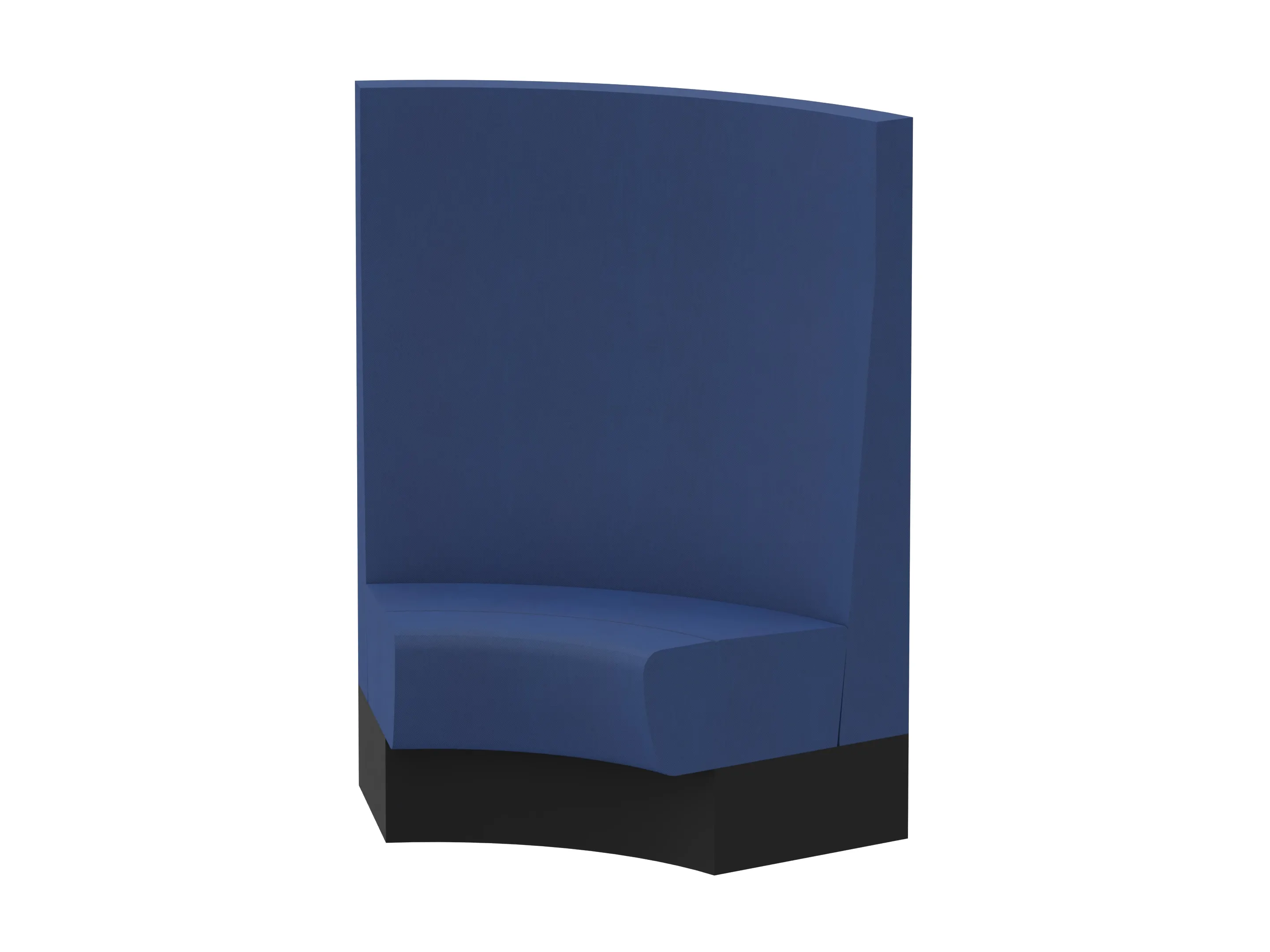 Treinbank in ronde opsteling, volledig gestoffeerd en voorzien van een aluminium plint (in kleur), Standaard vlak gestoffeerd. De installatiehoek is 60º en binnenradius 500mm, hoogte is 1400mm. Het element kan niet losstaand gebruikt worden!