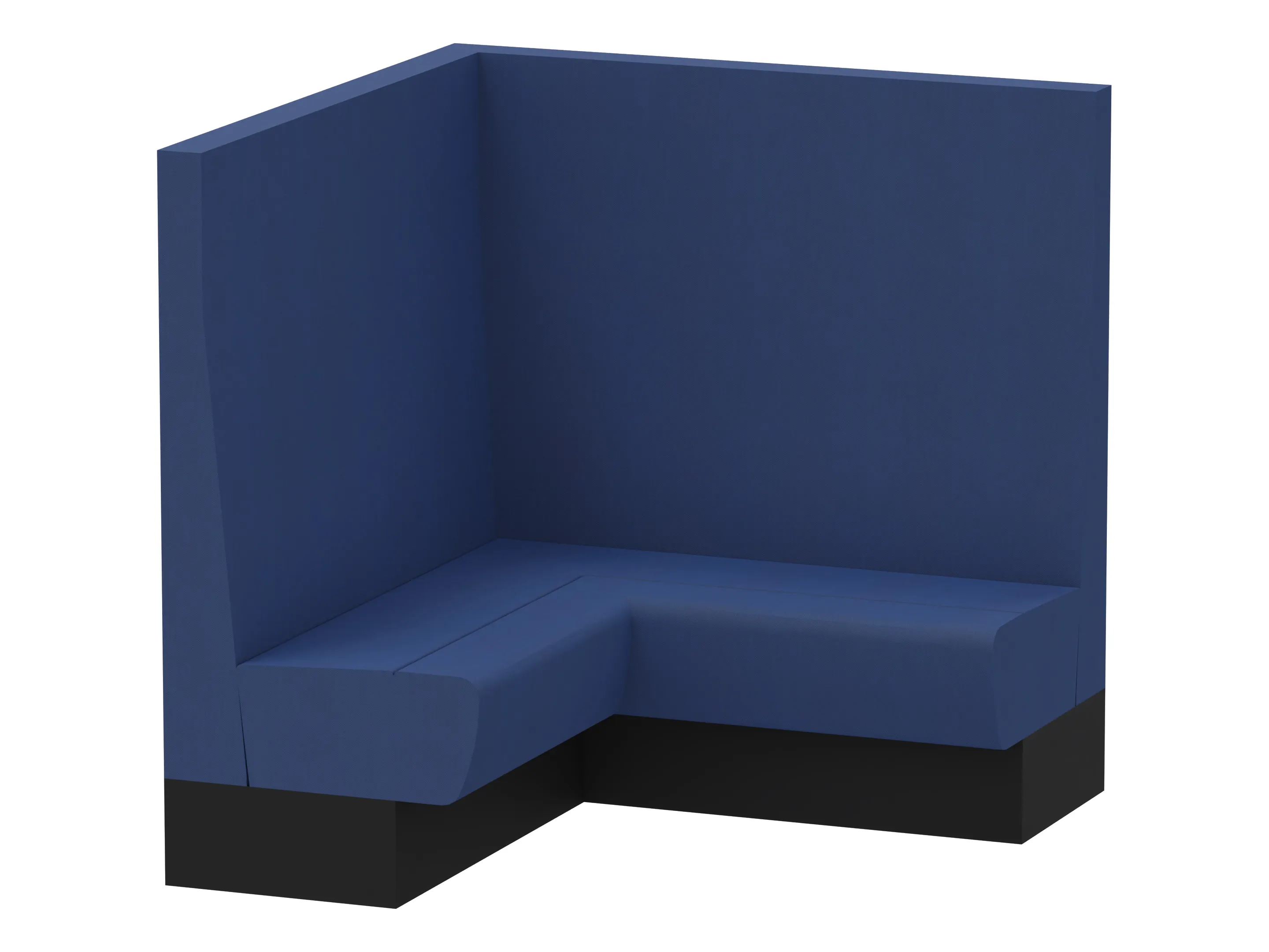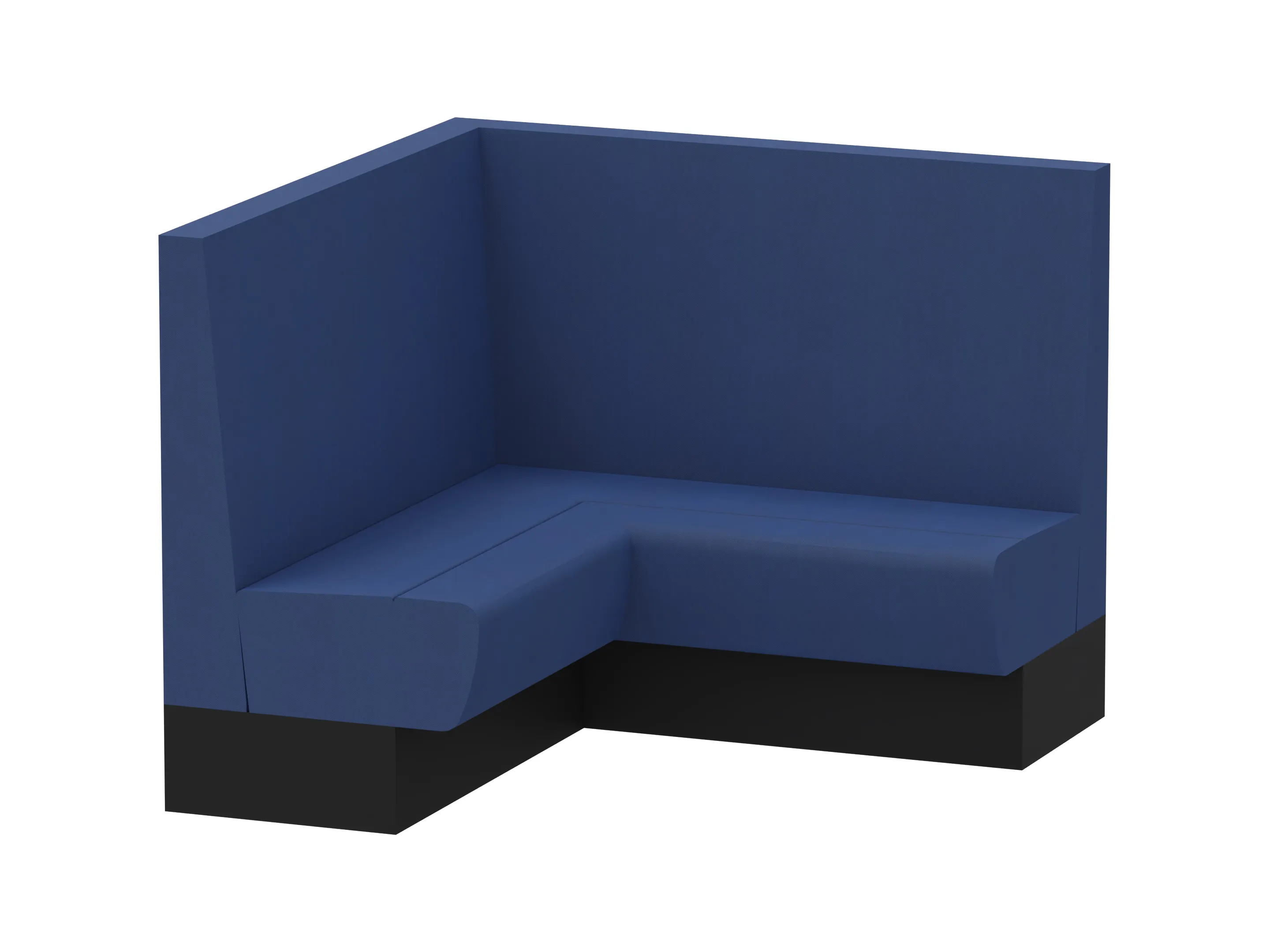 Treinbank in hoekopstelling, volledig gestoffeerd en voorzien van een aluminium plint (in kleur). Standaard vlak gestoffeerd. Afmeting: 1370 x 1370 x 1100mm (BxDxH)