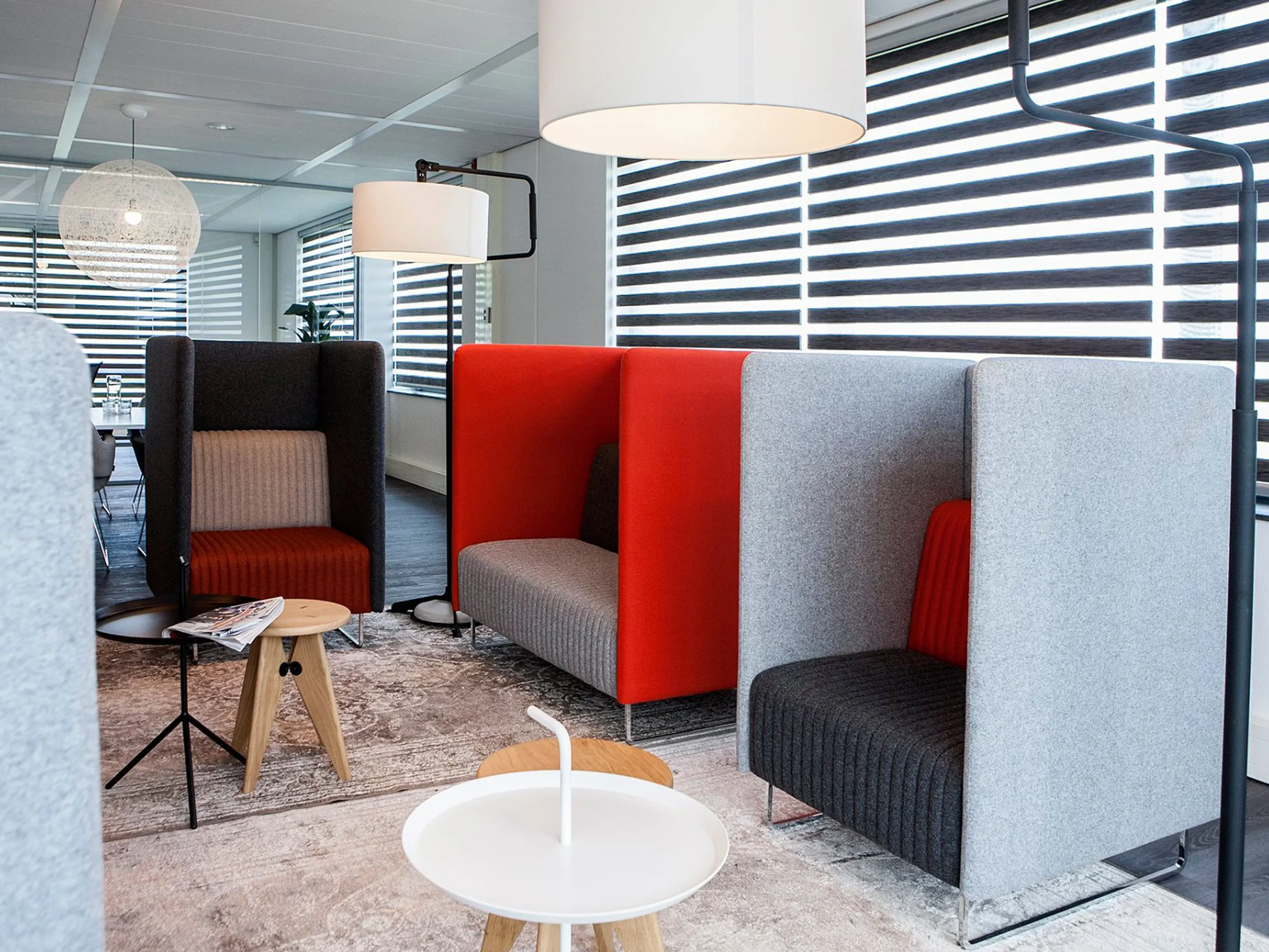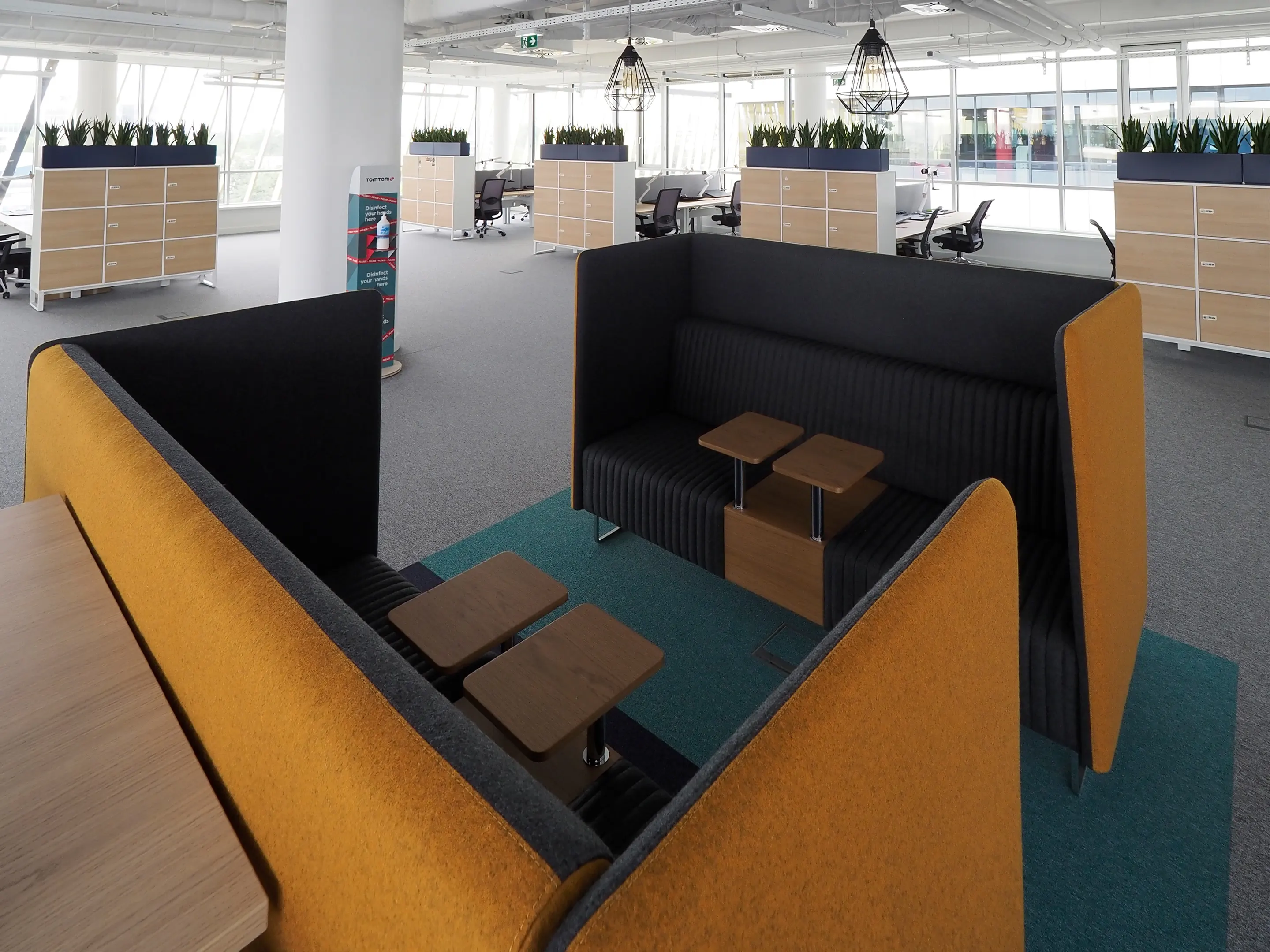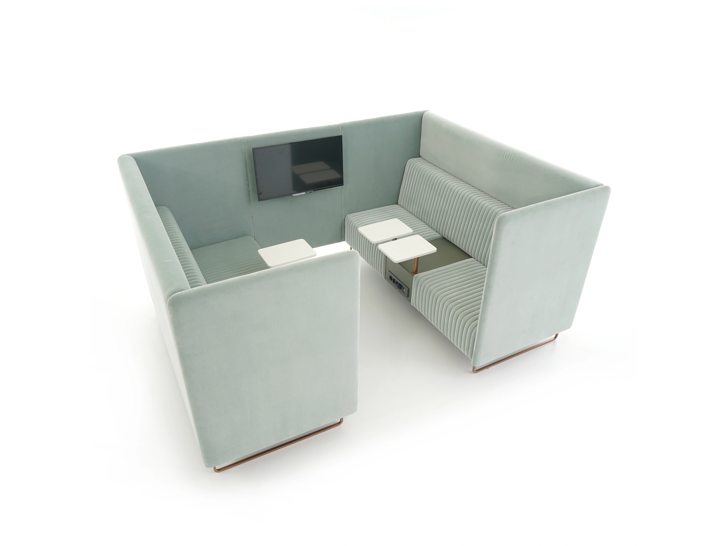 Hoge 3-zits bank met ombouw op sledeframe onderstel en 2 draaiende laptoptafels, volledig gestoffeerd. Afmeting: 192x90x124cm (BxDxH)