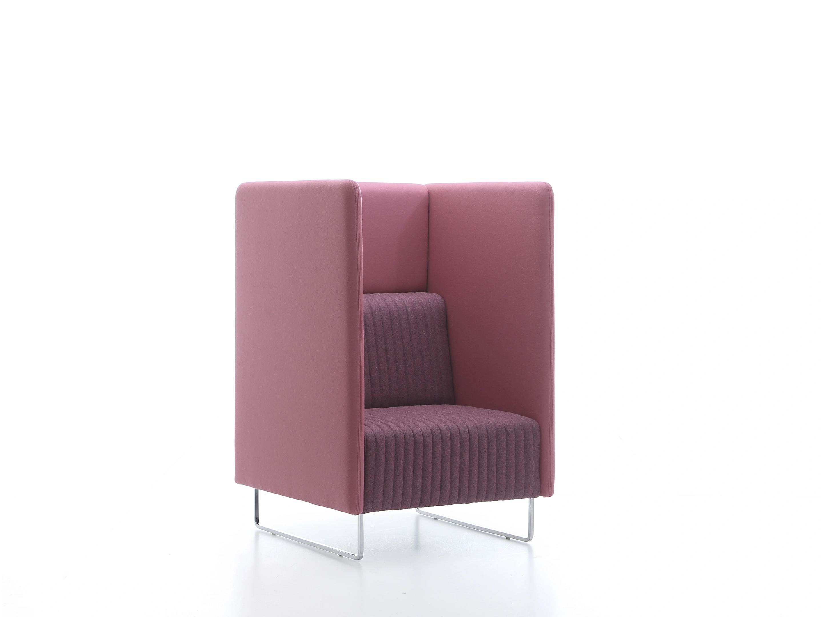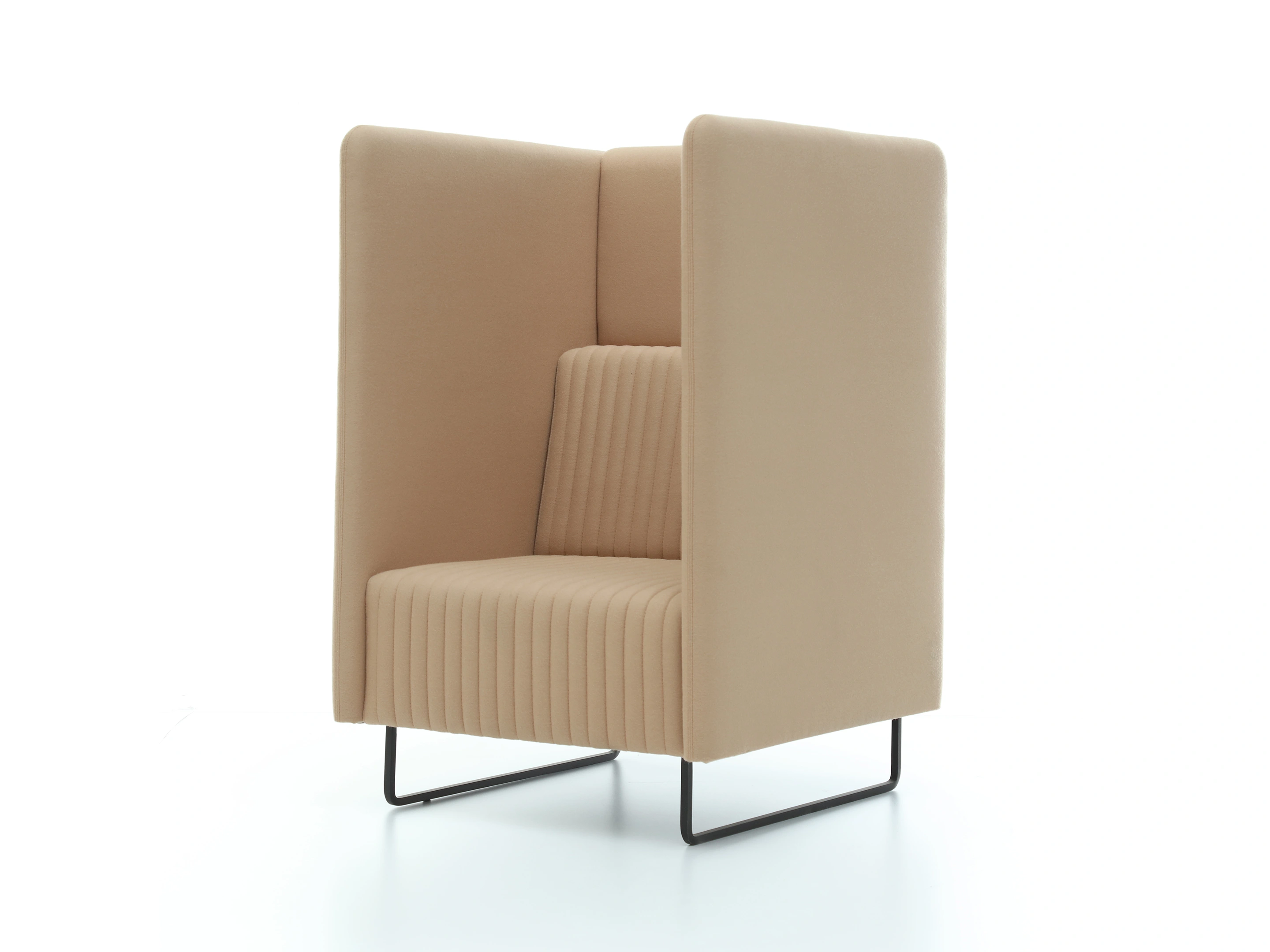 Hoge fauteuil met ombouw op sledeframe onderstel, volledig gestoffeerd. Afmeting: 80x90x124cm (BxDxH)