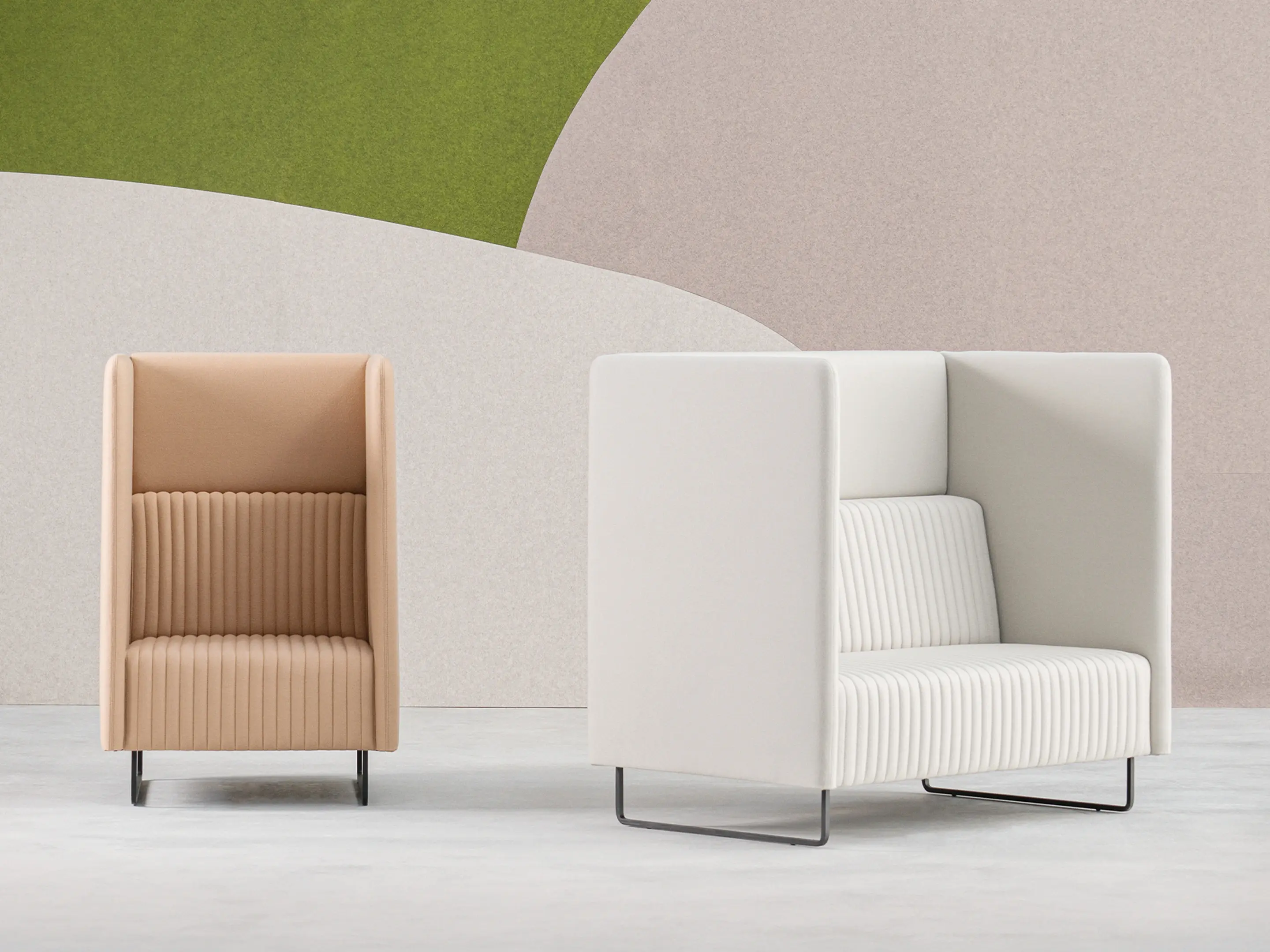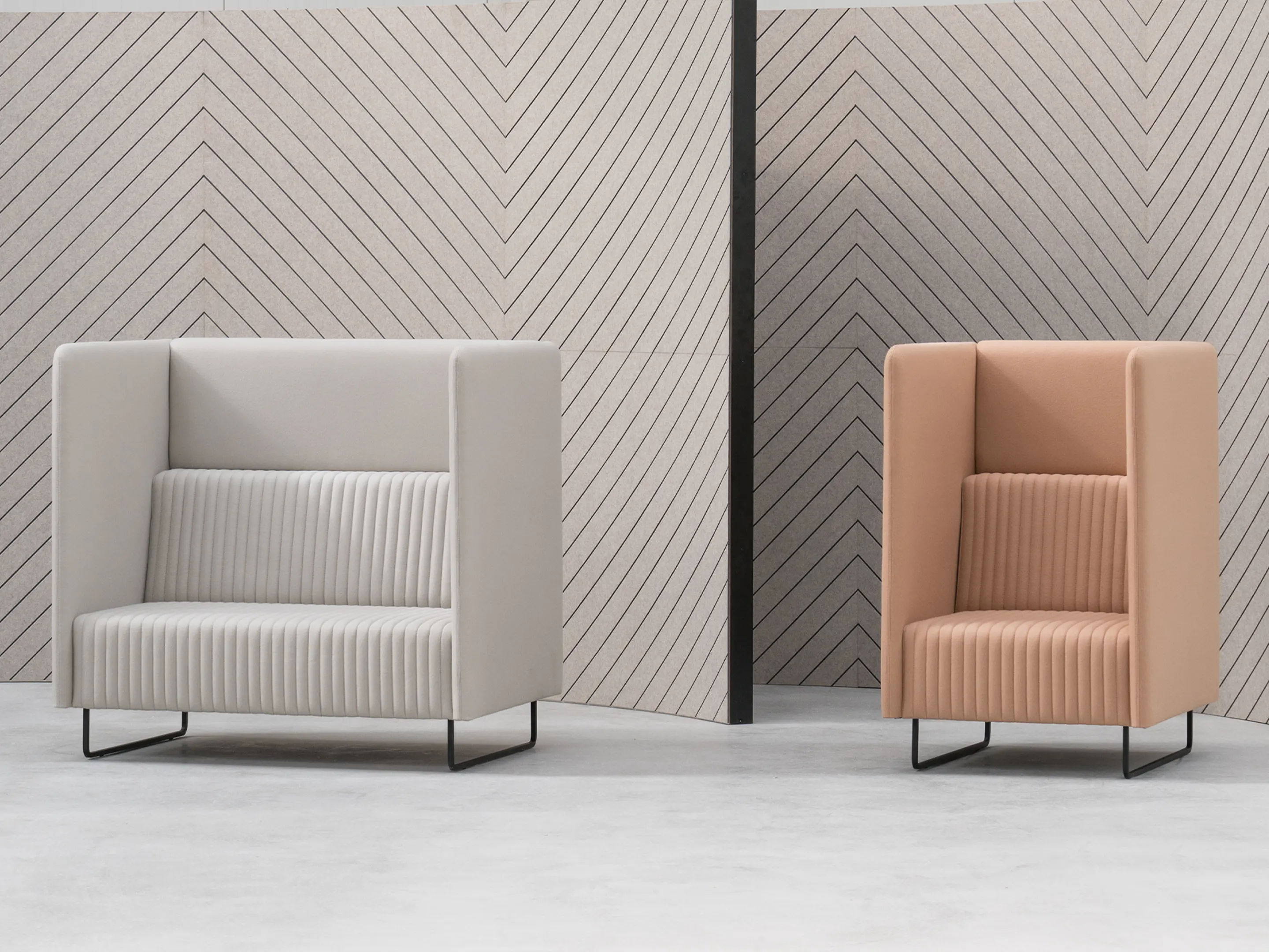 Hoge 2-zits bank met ombouw op sledeframe onderstel, volledig gestoffeerd. Afmeting: 132x90x124cm (BxDxH)