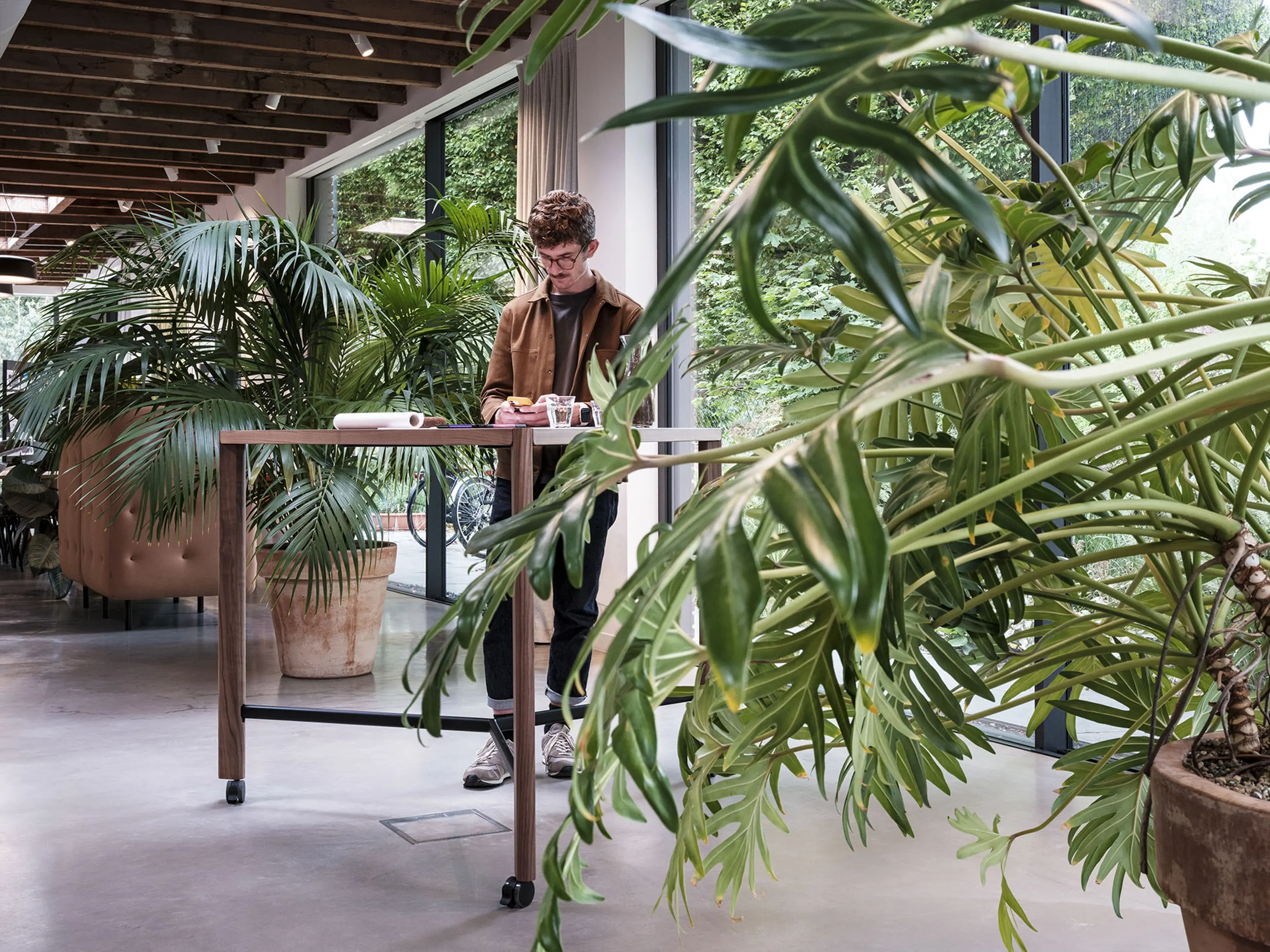 Statafel in driehoekige vorm met 3 poten met wielen. Afmeting: 1470 x 1280 x 1050mm (BxDxH).