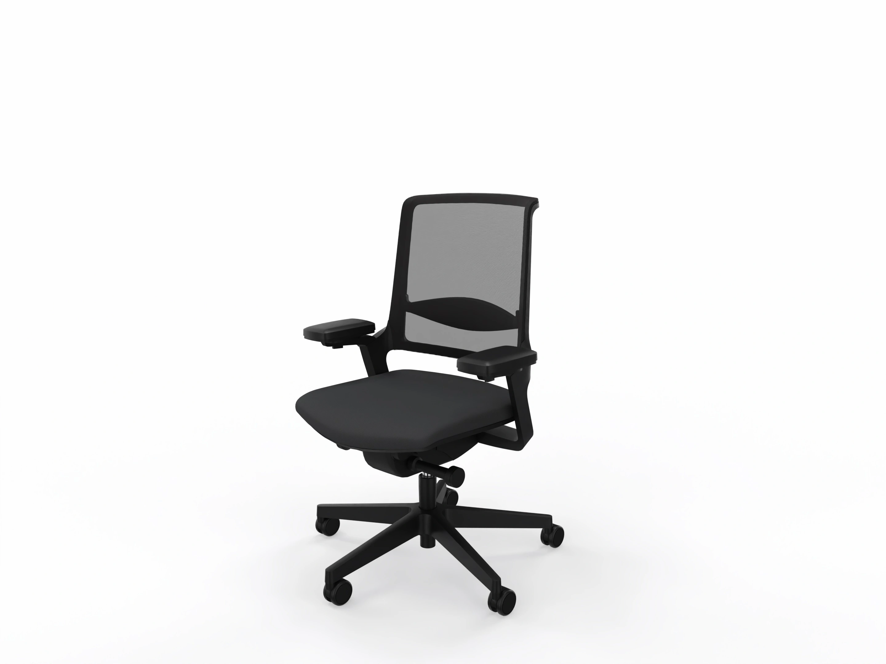 Standaard met: Body-Floatmechaniek met gewichtsregeling, NPR Armleggers, Zithoogte-, Zitdiepte- en Zitneigverstelling & Verstelbare lendensteun, Lage netbespannen rug. Volledig zwart