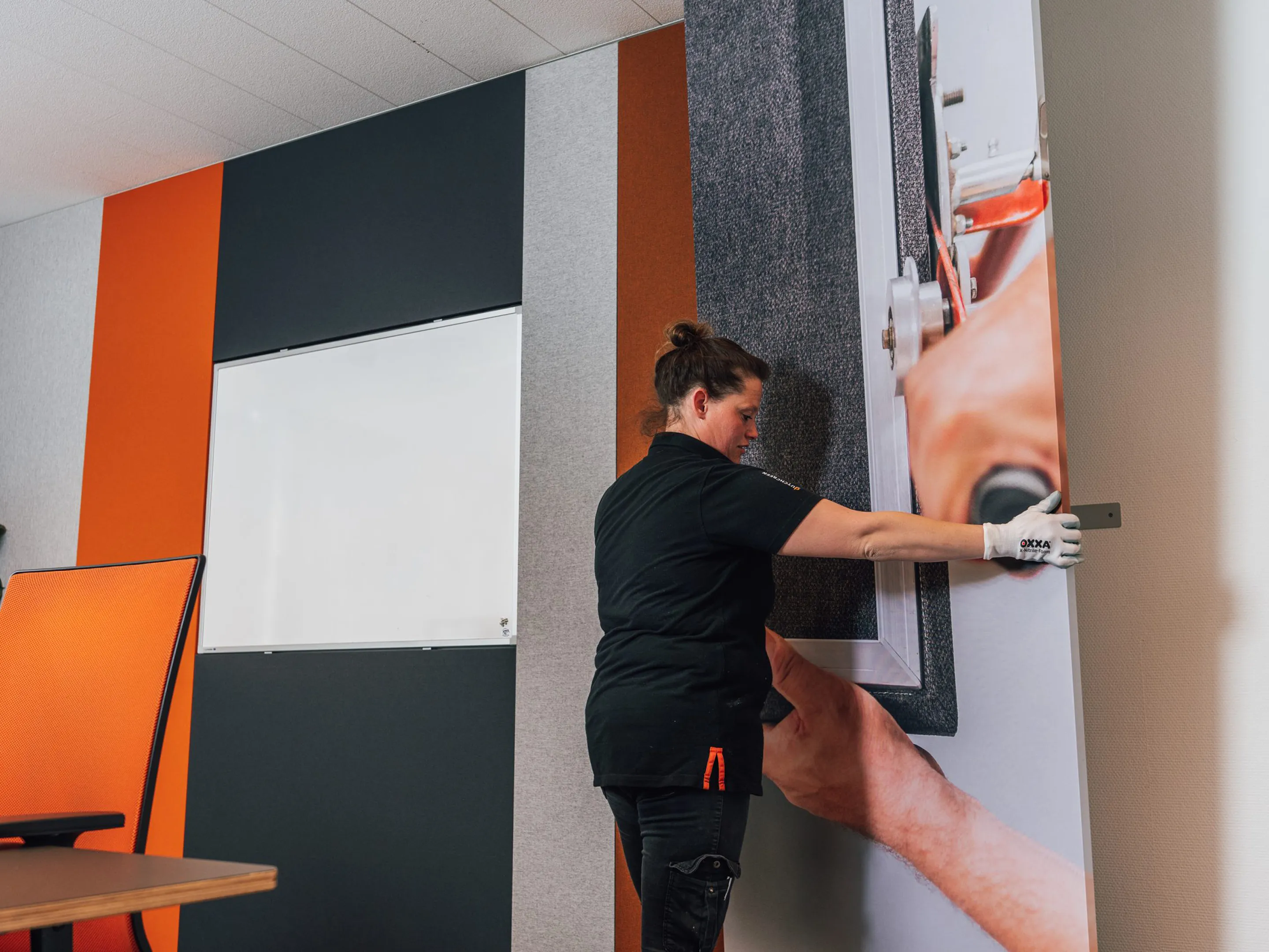 Akoestische vulling op basis van gerecycleerde textiel- vezel. Één zijdigd gestoffeerd, geschitk voor wand en plafond doeleinden. Frame is van aluminium.