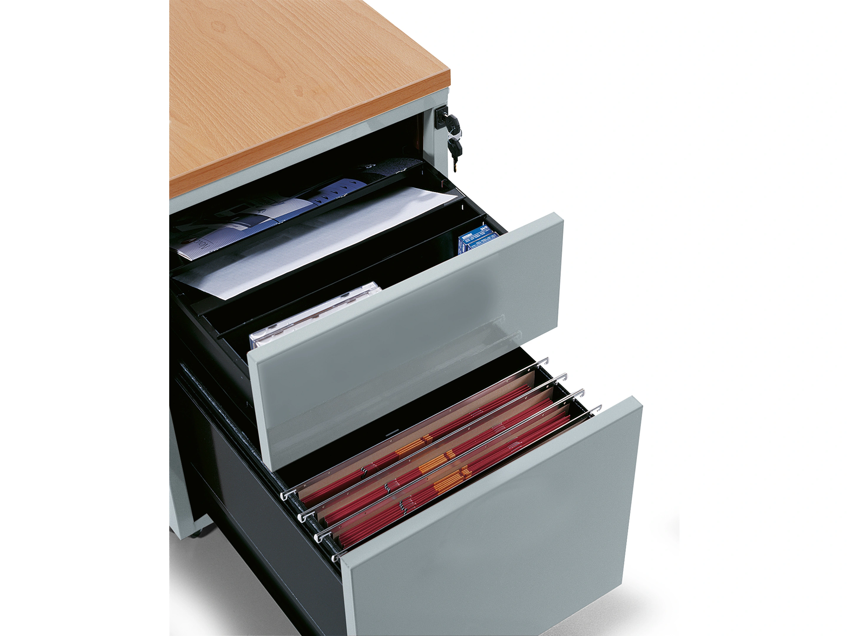 Verrijdbare ladeblok van 42x58x53,5cm (BxDxH), voorzien van een hangmaplade, lade en pennenlade. Losse dwarsstang inbegrepen.