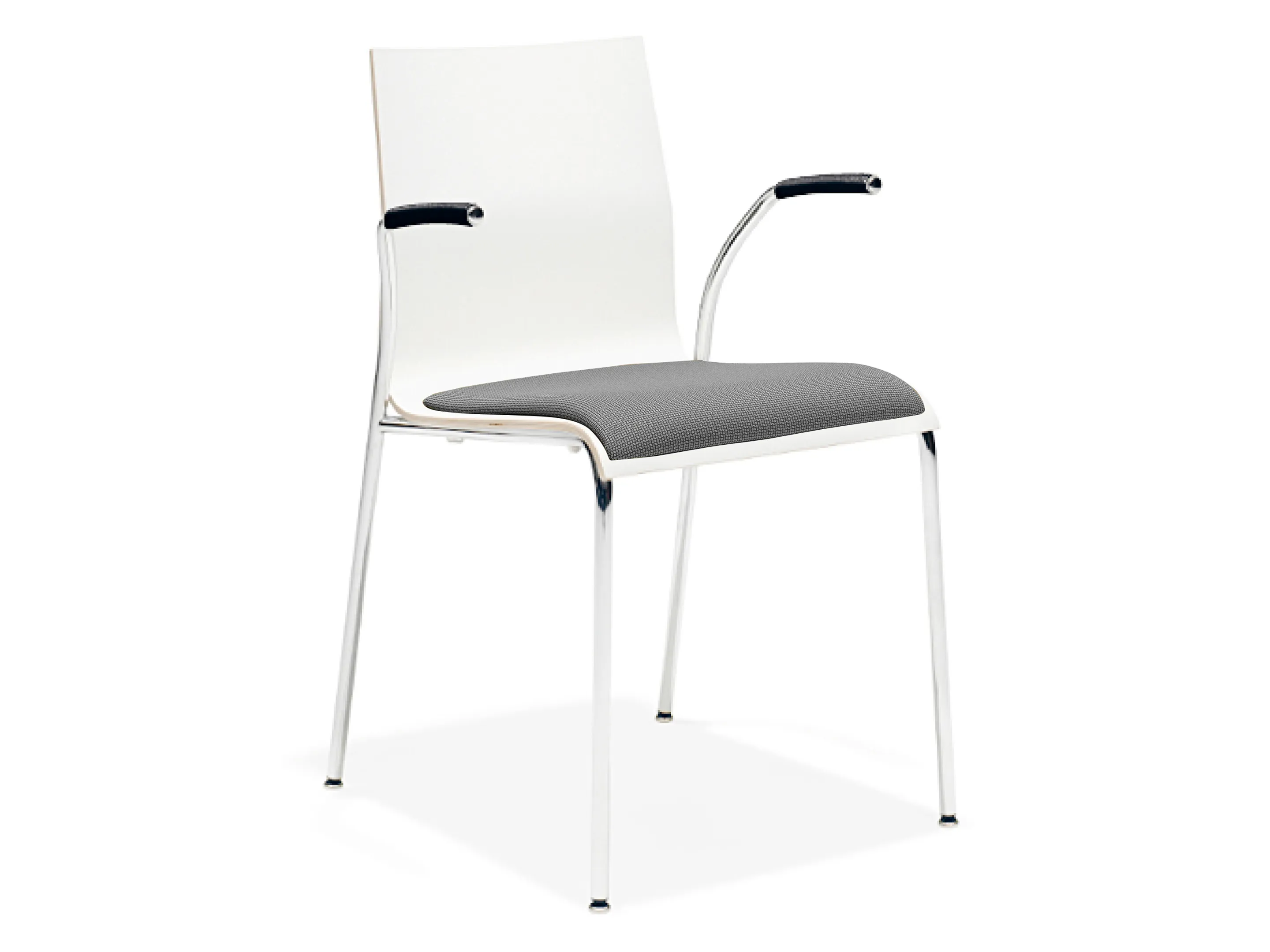4-poots frame op kunststof glijders met een melamine kuip met zitting opdekstoffering. Inclusief armleggers. Stapelbaar tot 12 stuks op transportwagen.