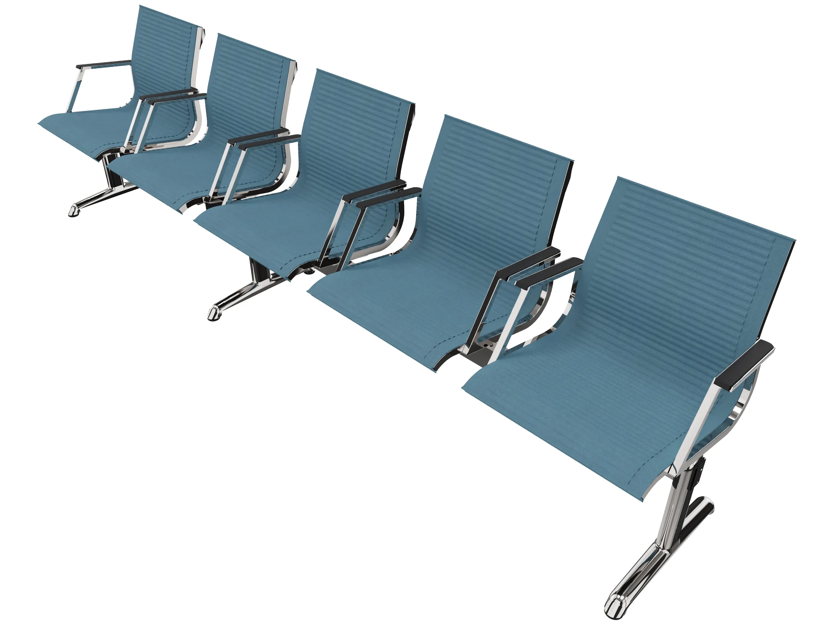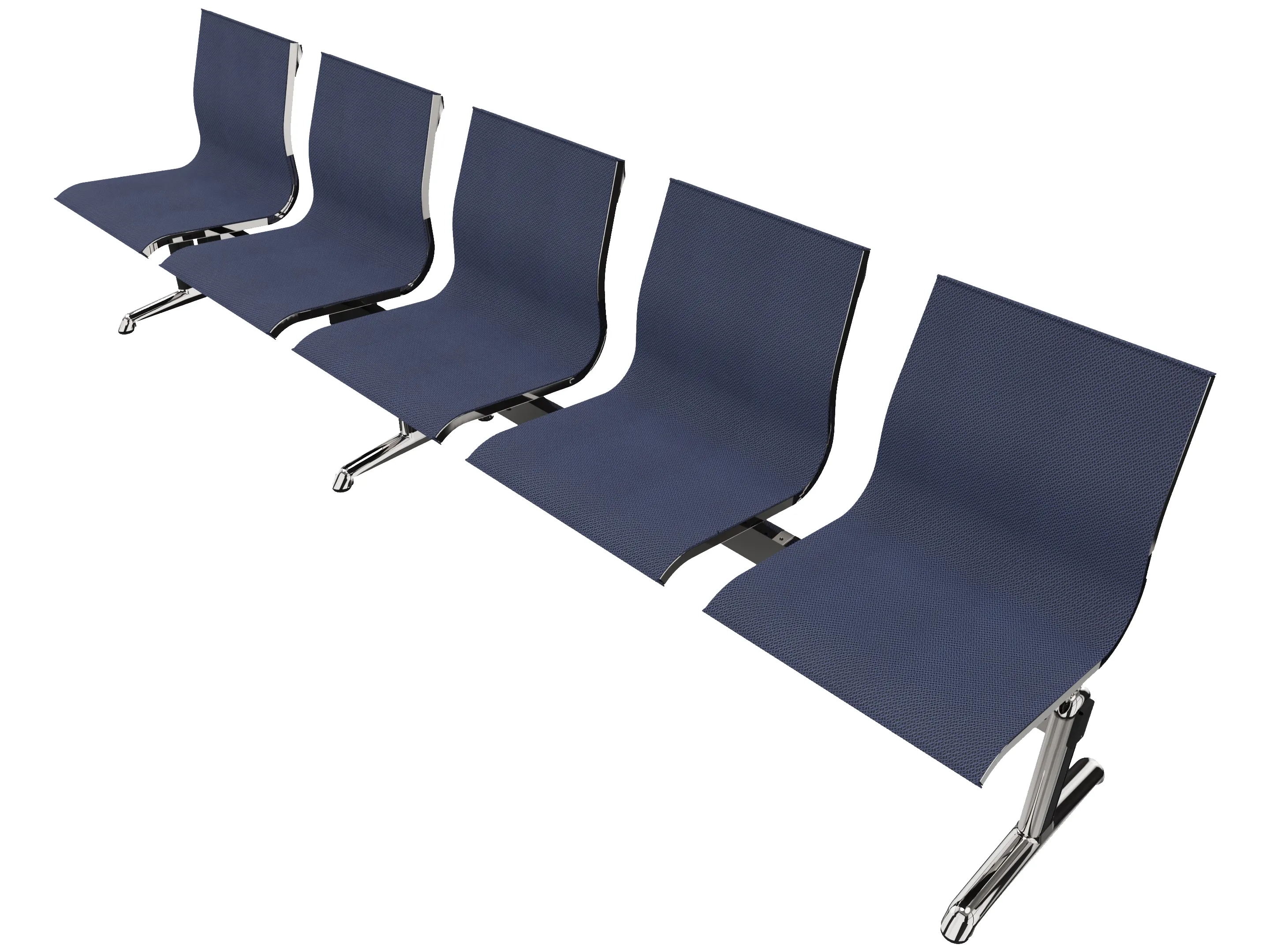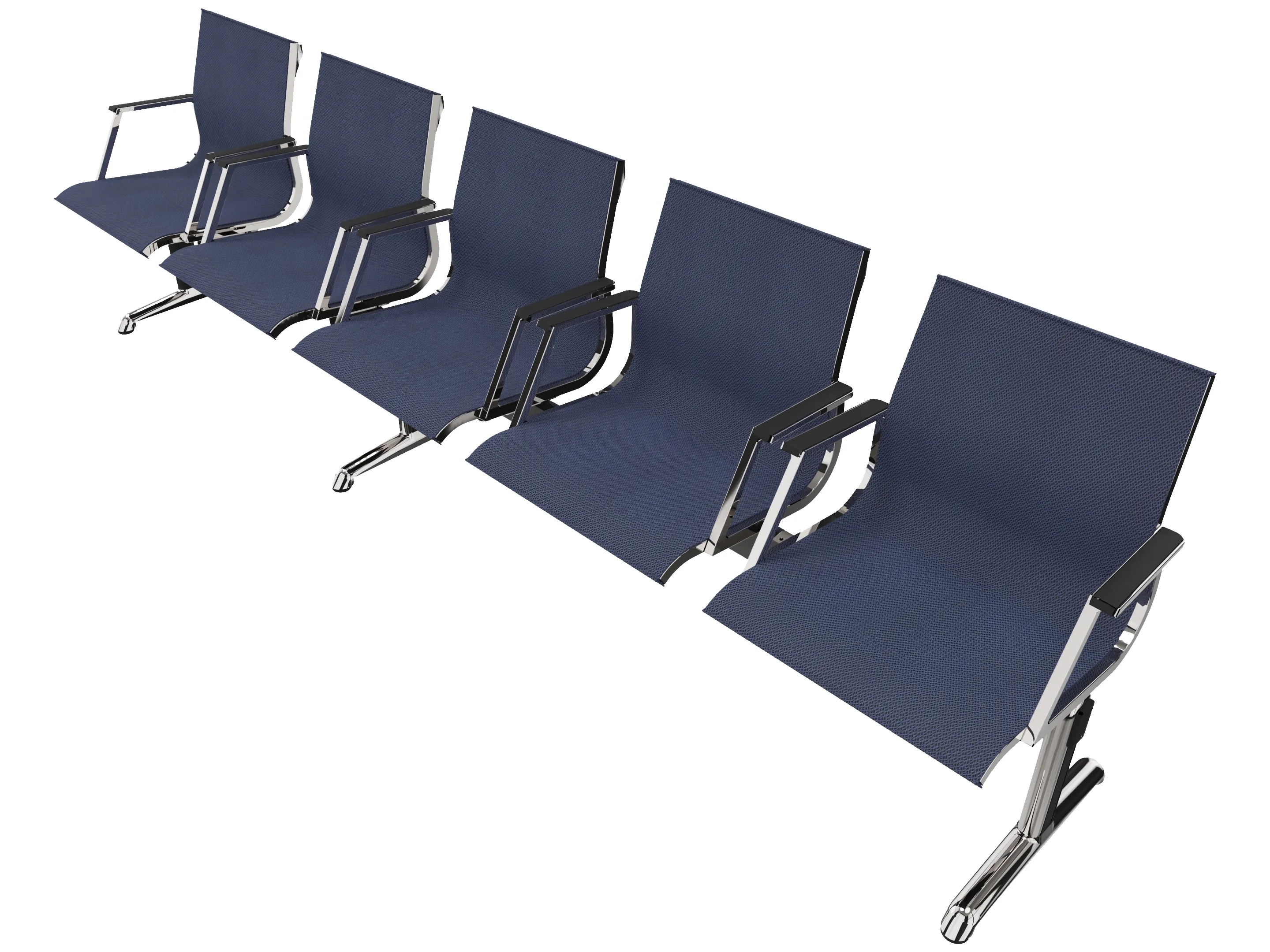 Wachtkamerbank in "mesh" 5-zits uitvoering "mesh", met 2 poten, en zonder armsteunen. Frame altijd verchroomd.