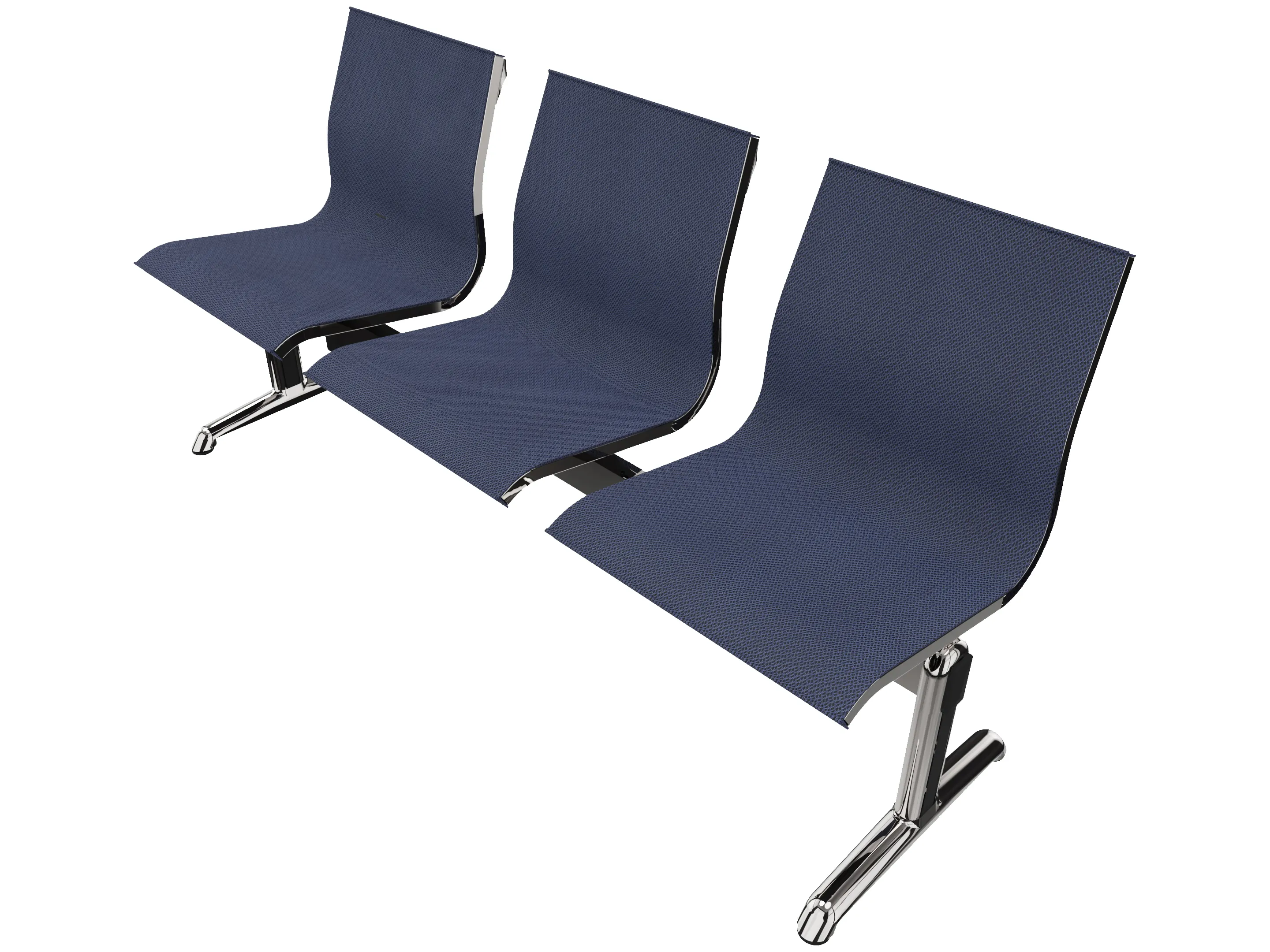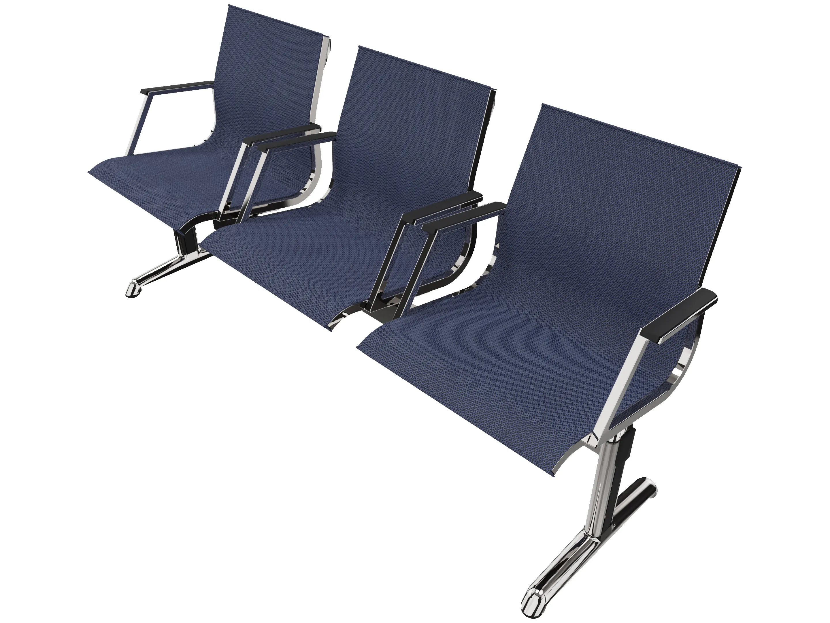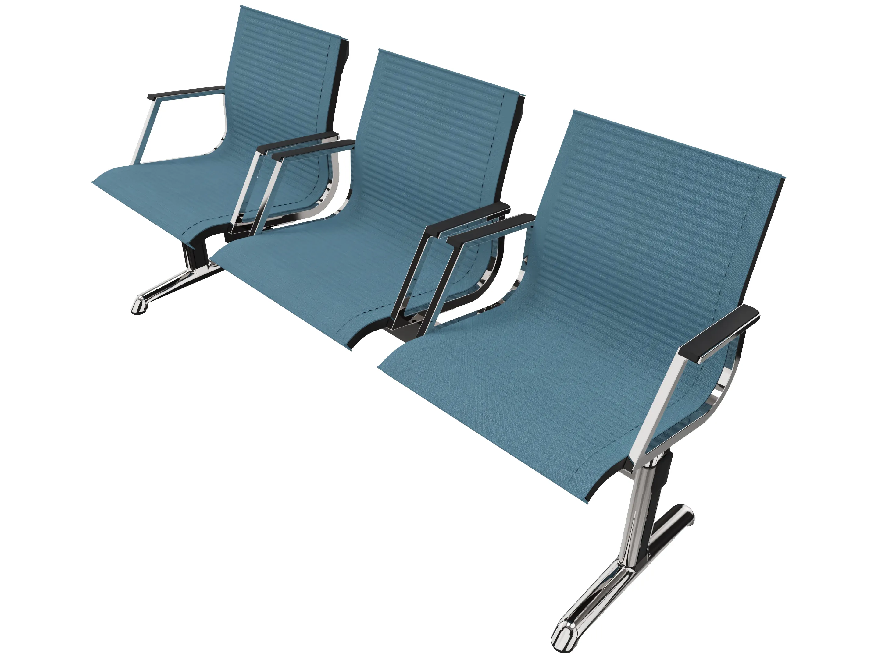 Wachtkamerbank in "mesh" 3-zits uitvoering "mesh", met 2 poten, en zonder armsteunen. Frame altijd verchroomd.