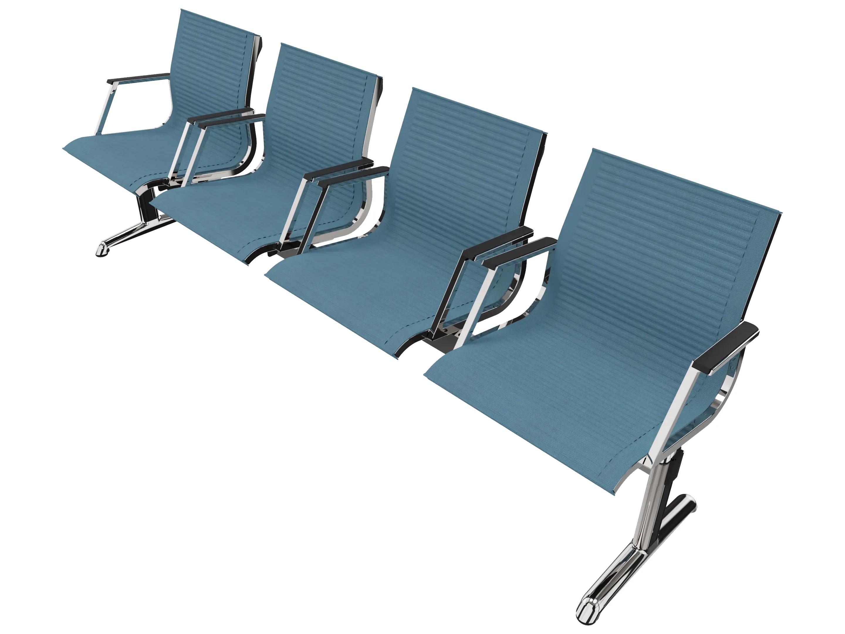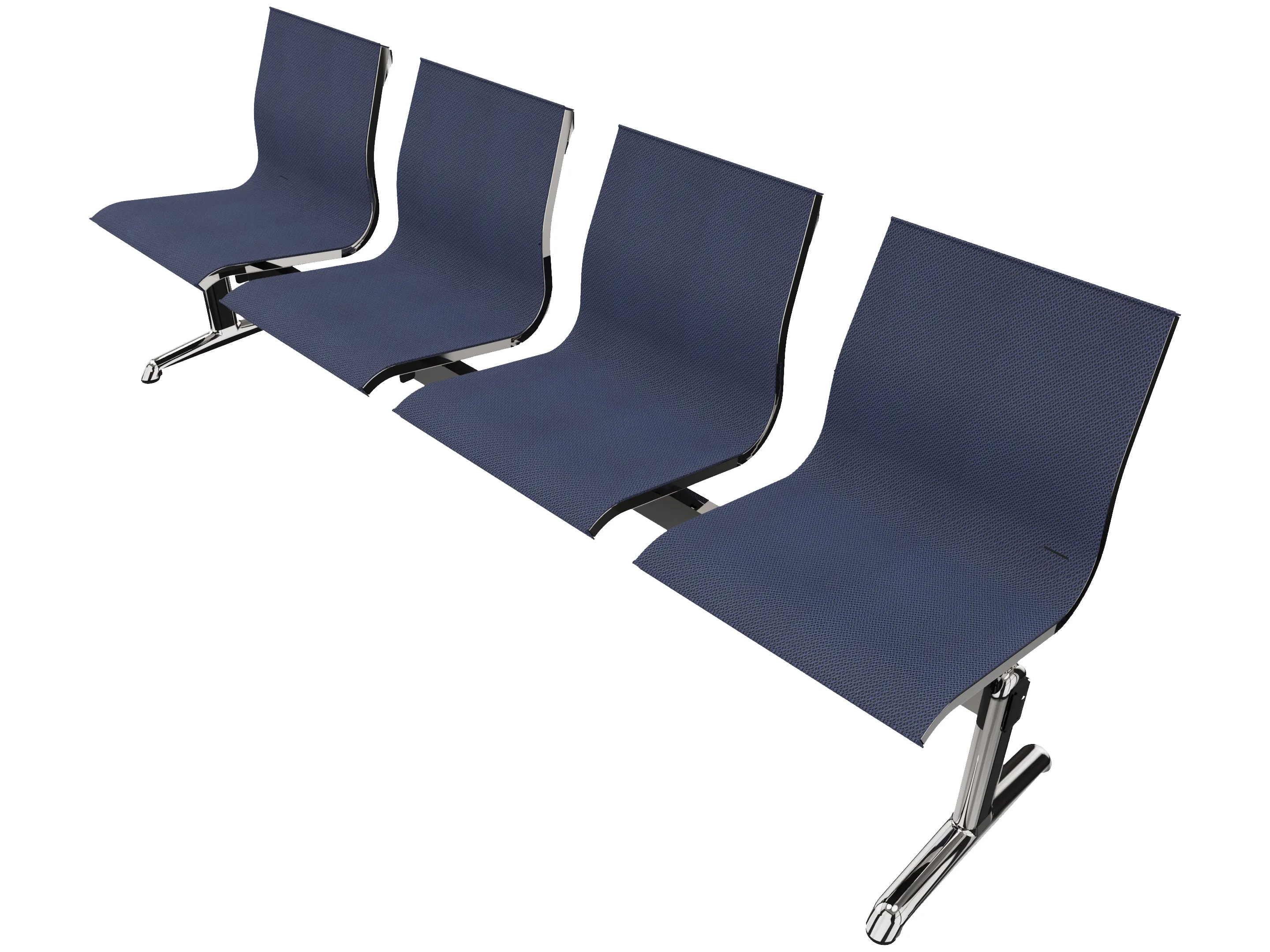 Wachtkamerbank in "mesh" 4-zits uitvoering "mesh", met 2 poten, en zonder armsteunen. Frame altijd verchroomd.