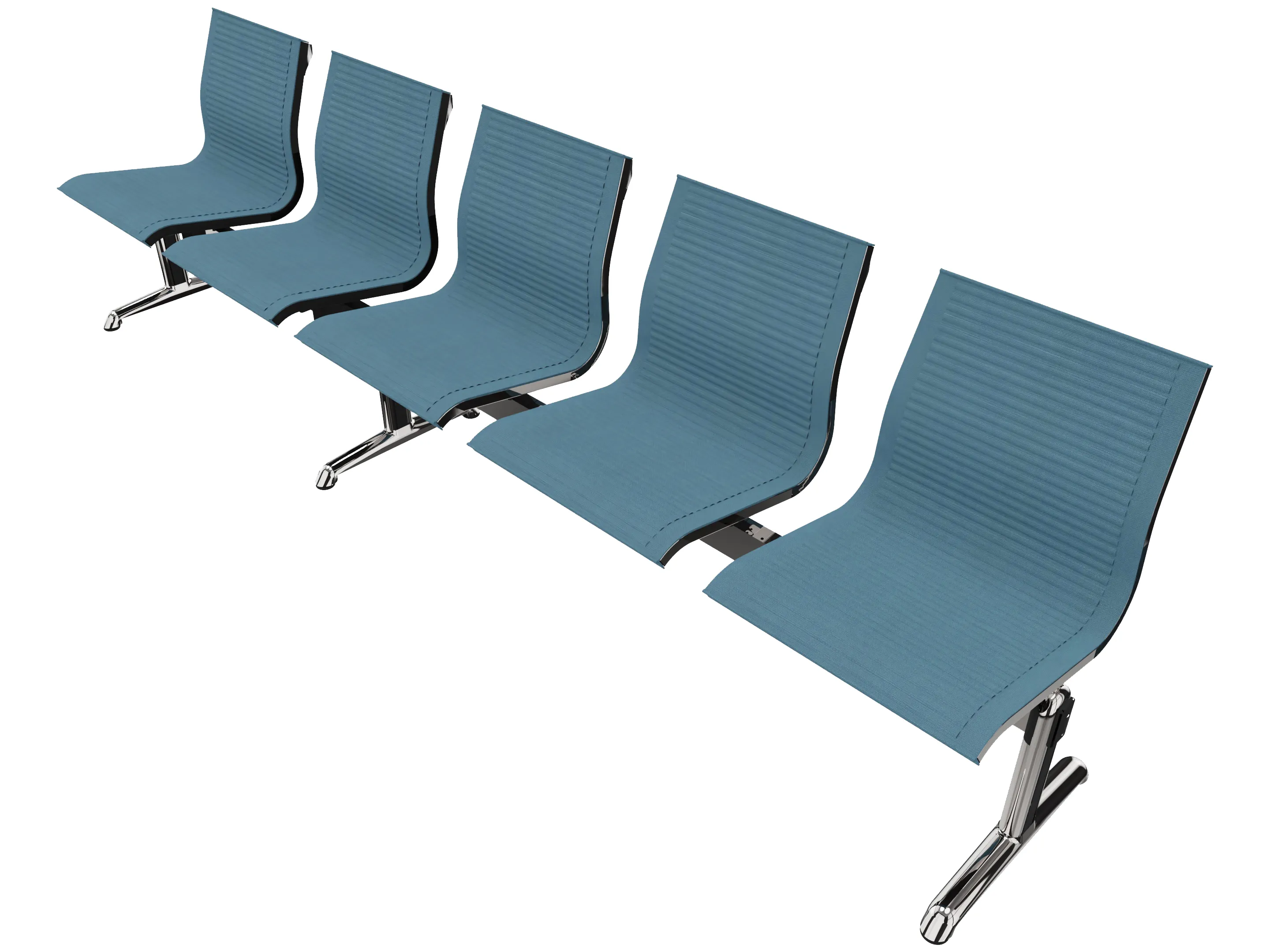 Wachtkamerbank in "ribbed" 5-zits uitvoering "ribbed", met 3 poten, en zonder armsteunen. Frame altijd verchroomd.