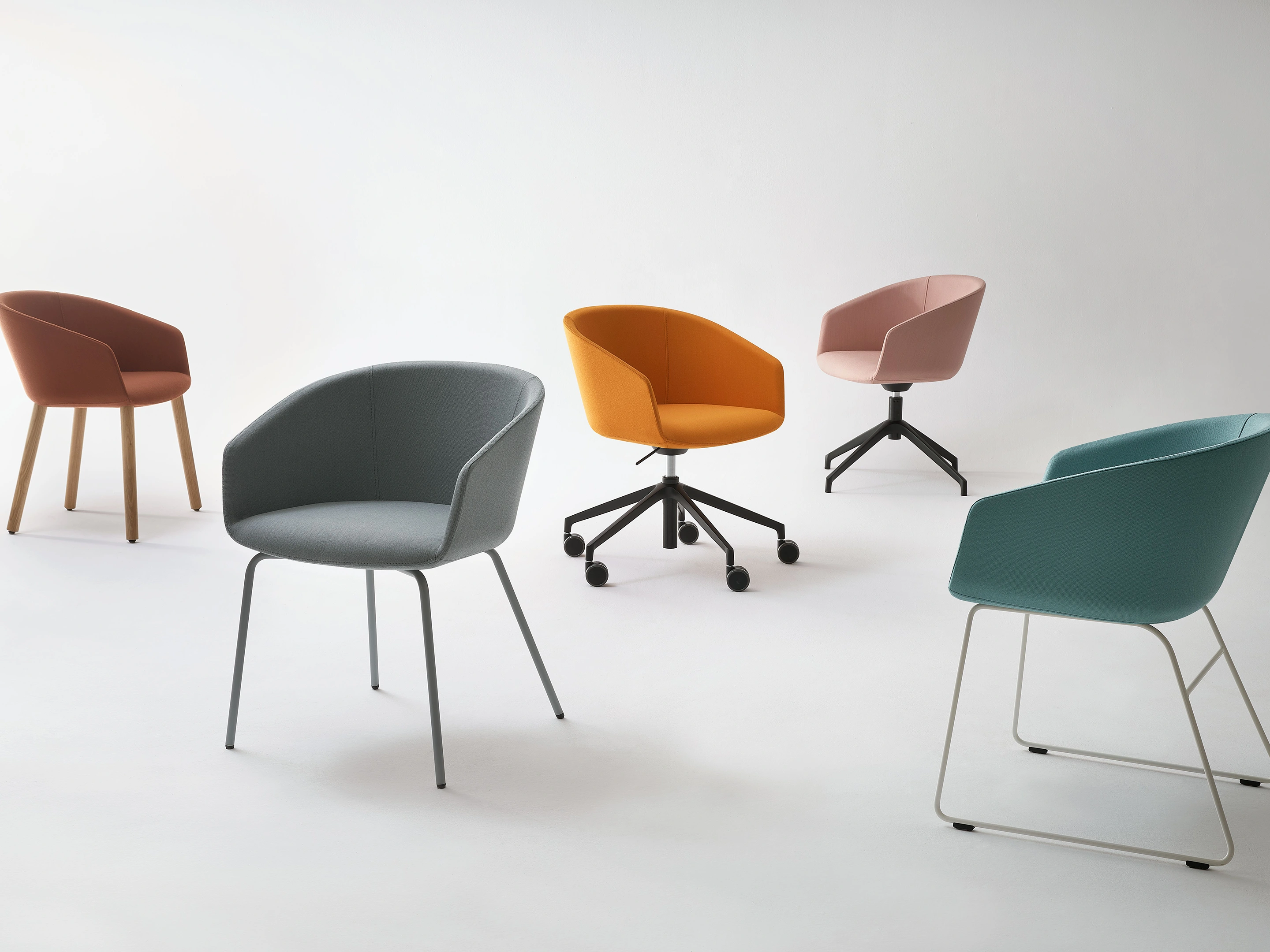 Volledig gestoffeerde, draaibare kuip met hoogteinstelling, 5-teens voetkruis met wielen