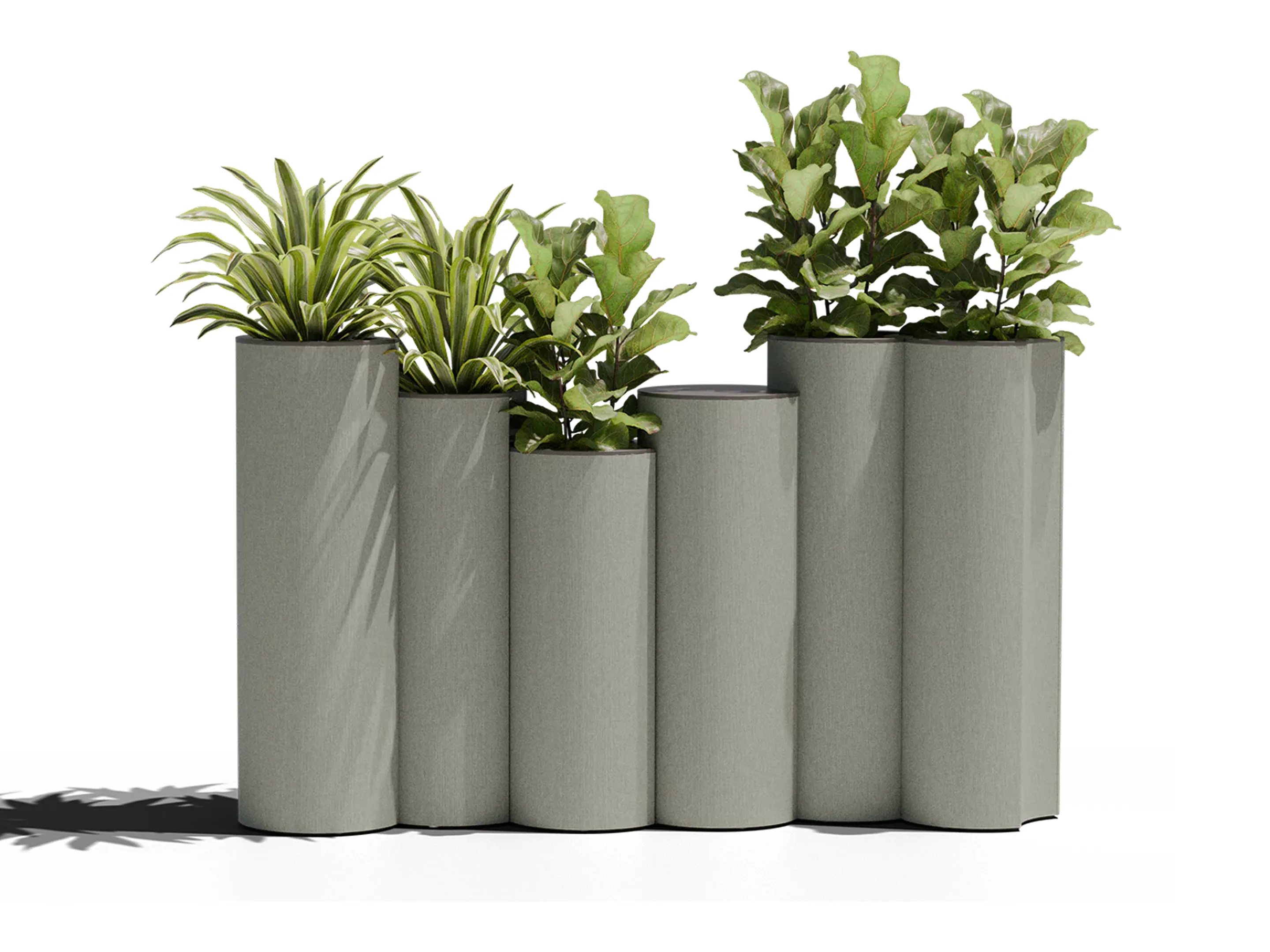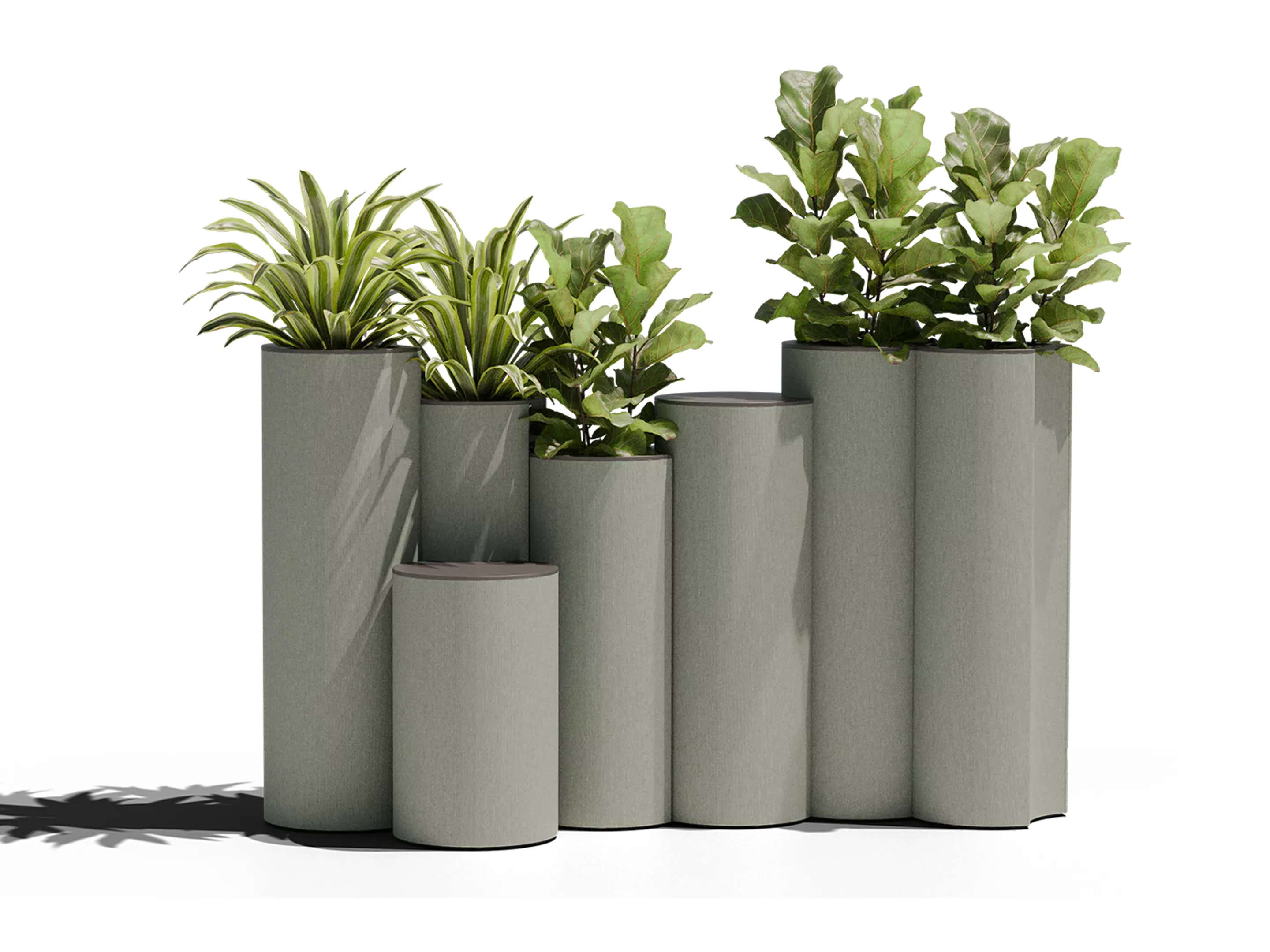 Volledig gestoffeerde en koppelbare akoestische module met plantenbak. Ø 310mm, hoogte 700mm.