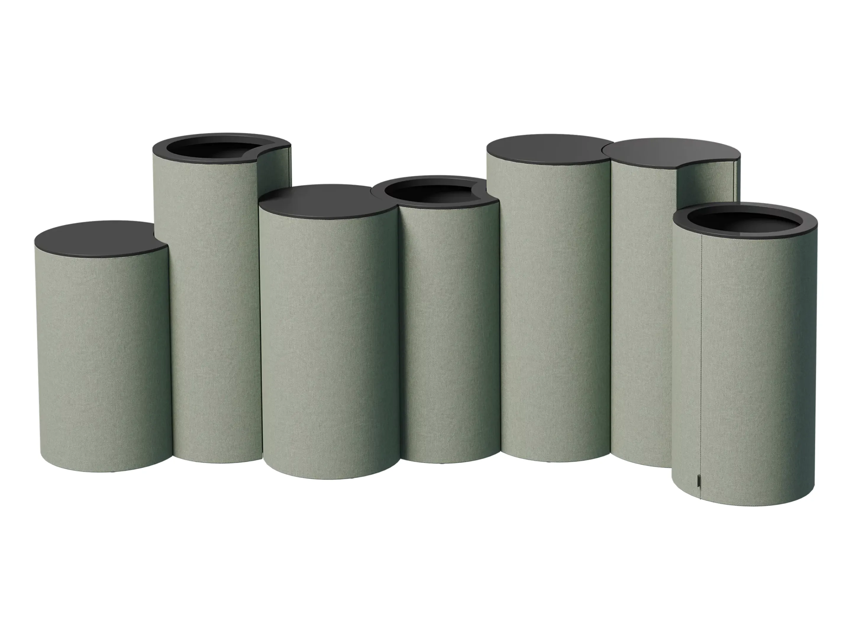 Volledig gestoffeerde en koppelbare akoestische module met plantenbak. Ø 310mm, hoogte 900mm.