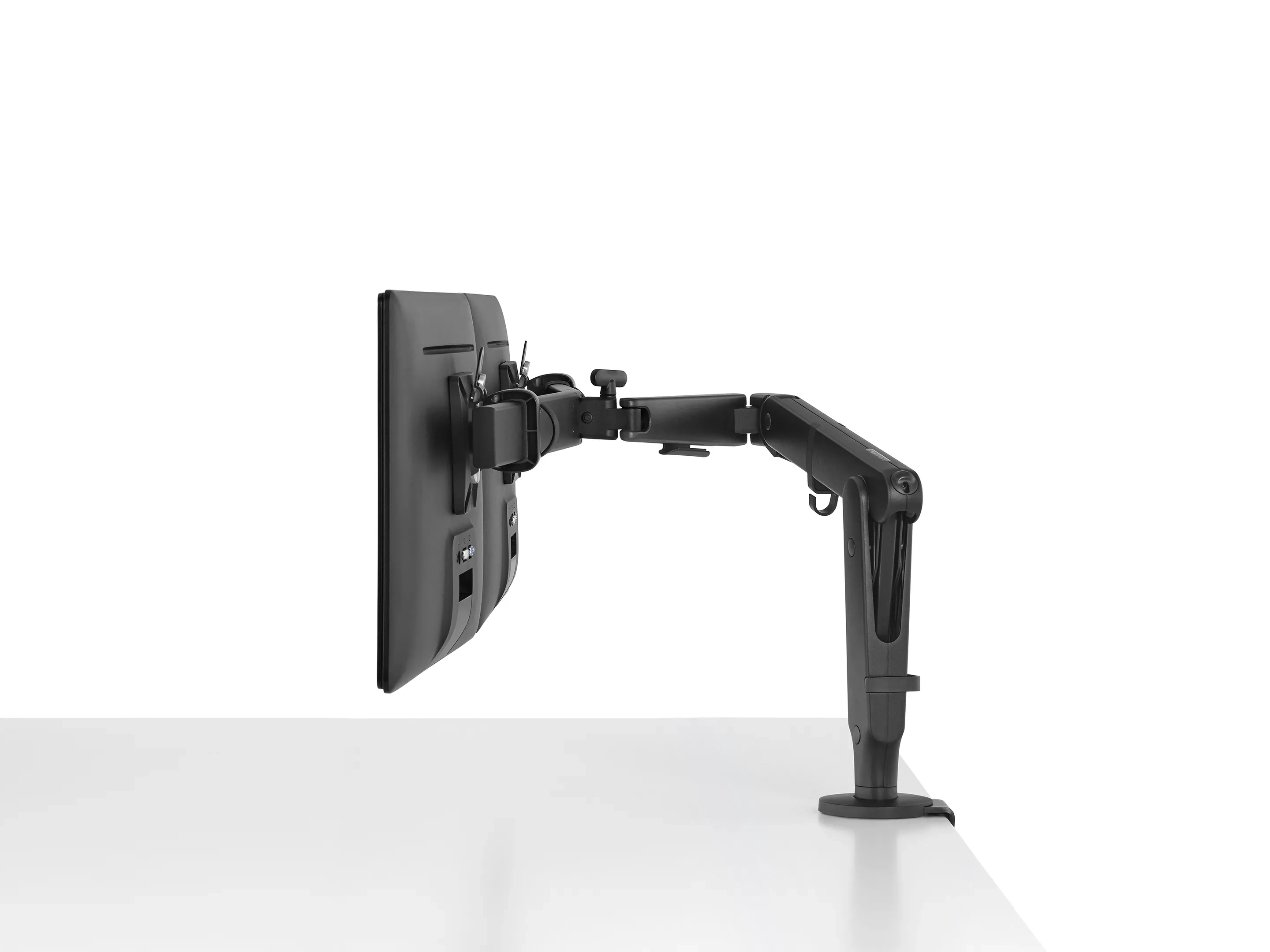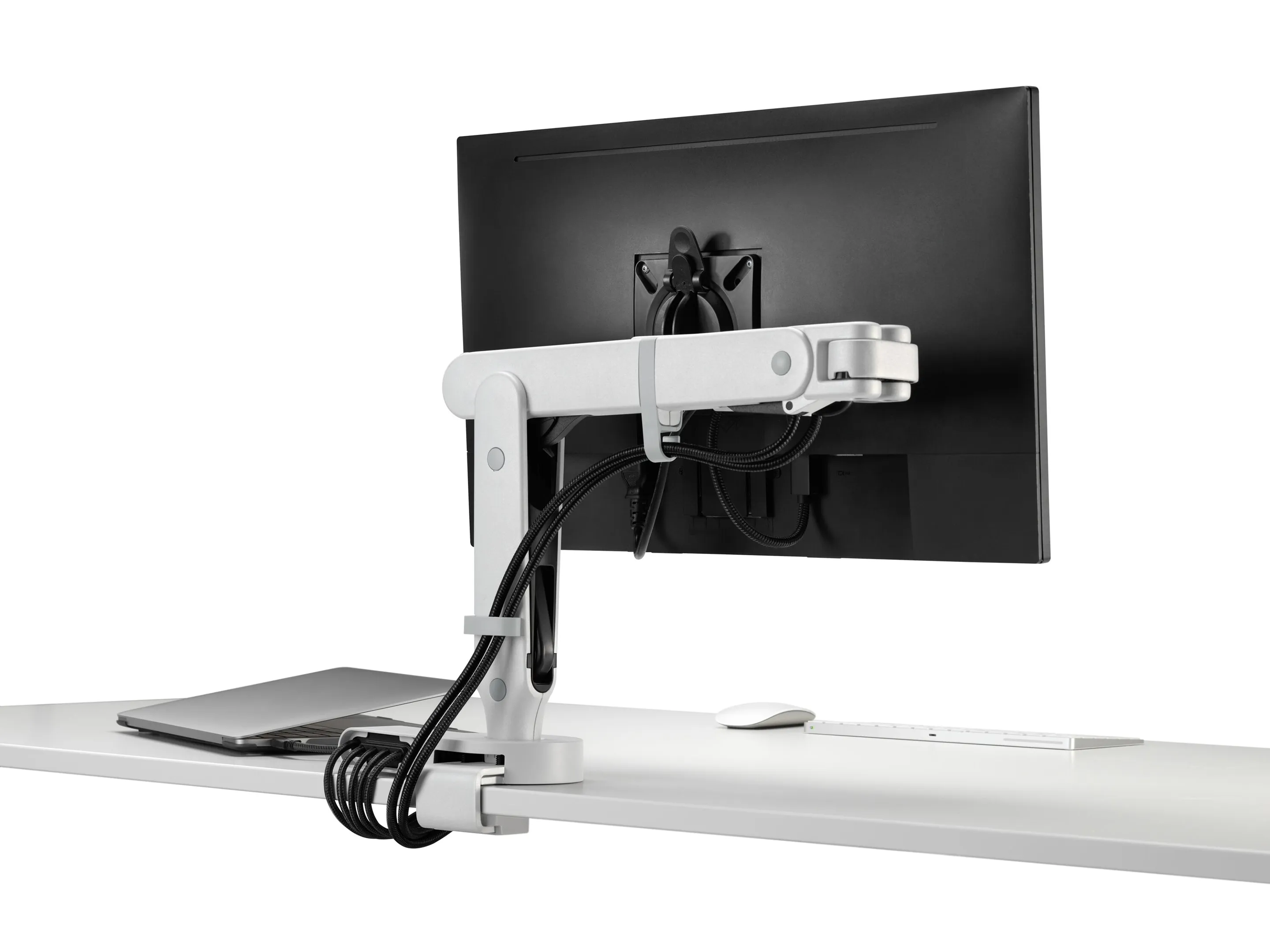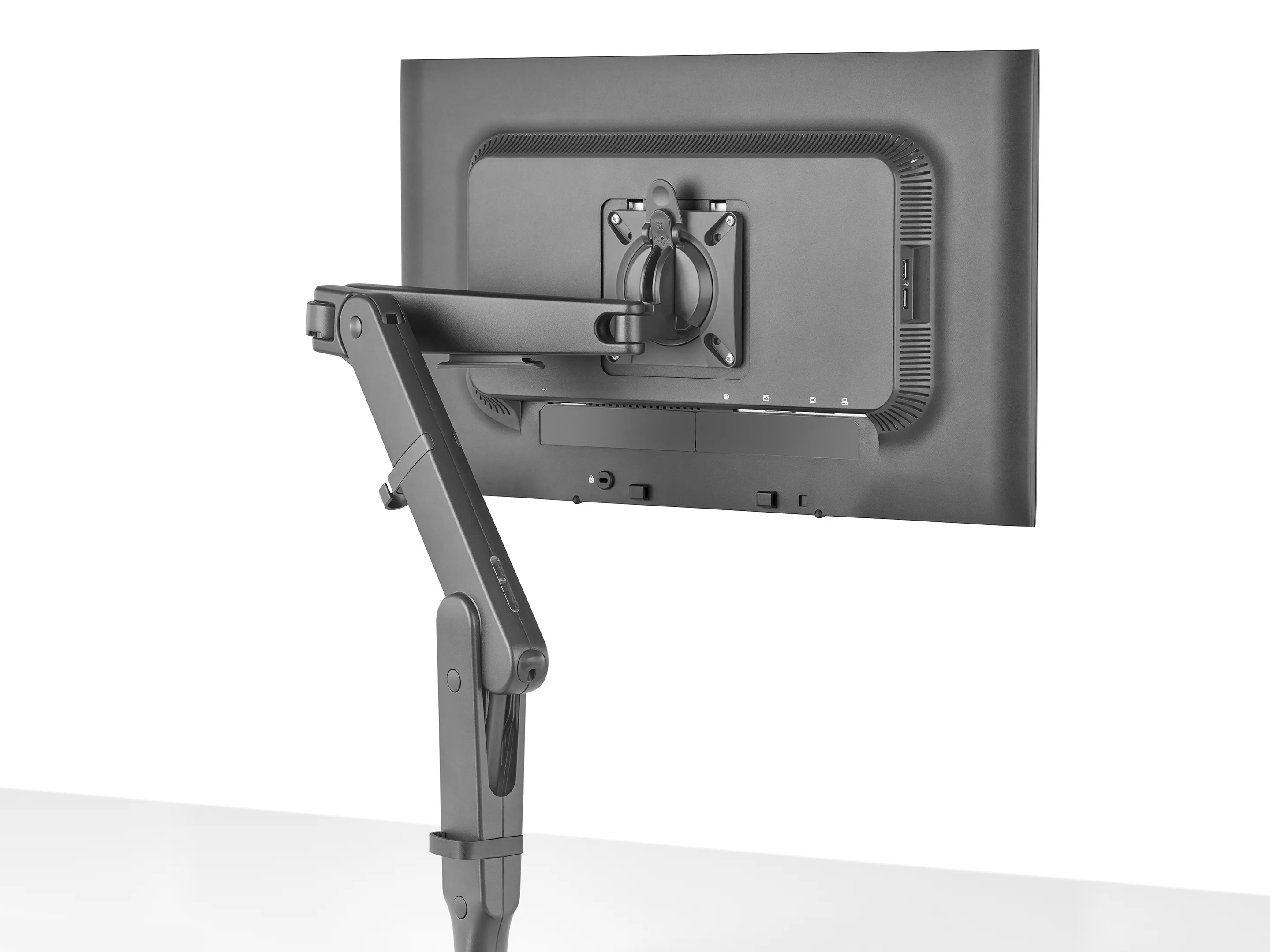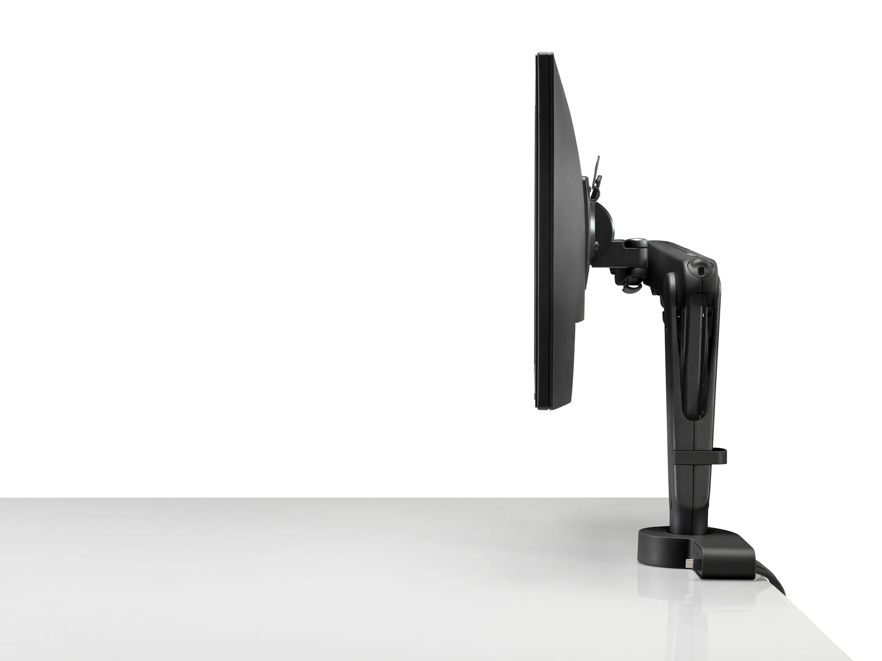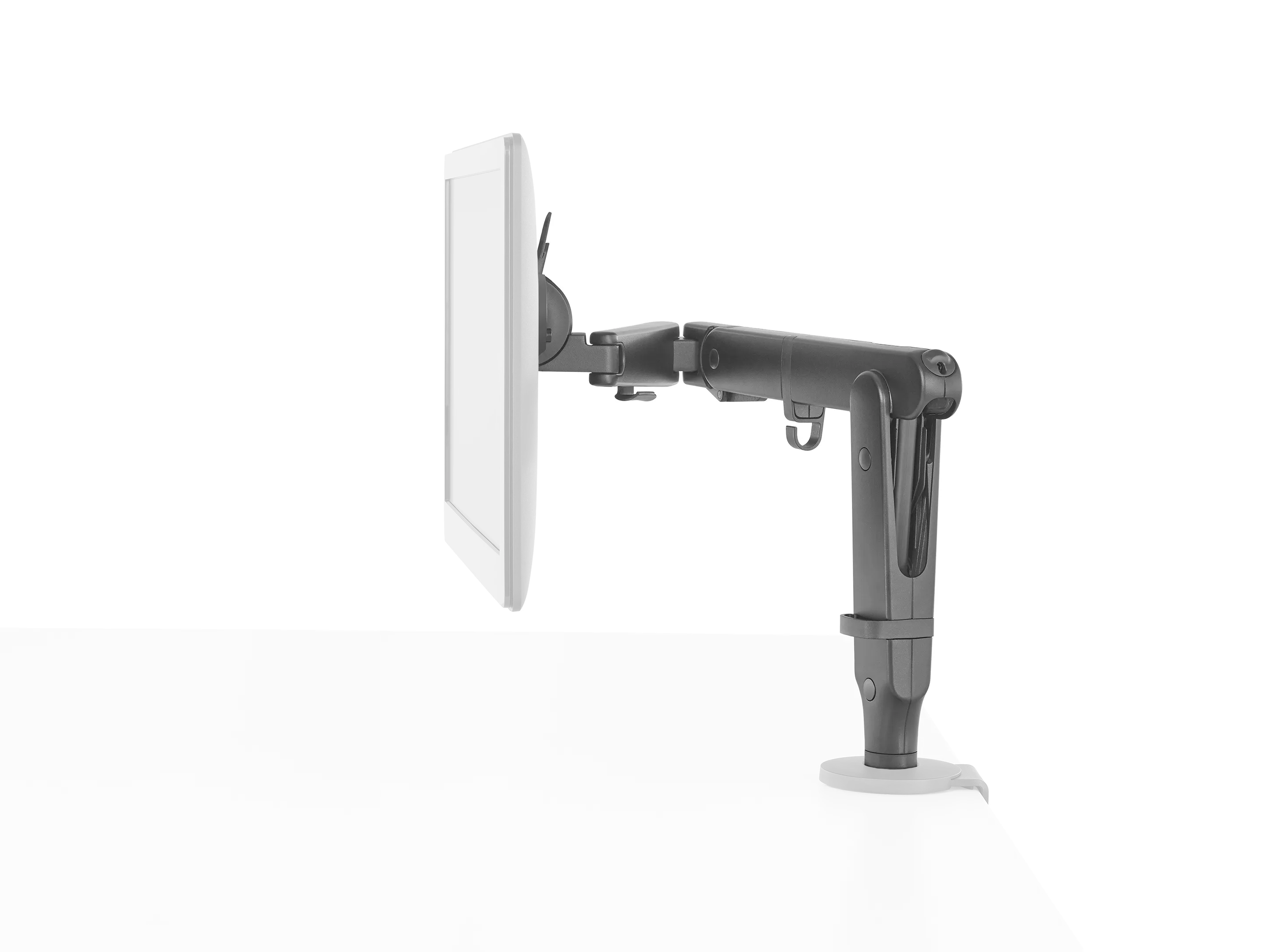 Gasveergestuurde, zeer dynamische monitorarm. Door een belastbaarheid tussen 0-9kg, zeer breed toepasbaar. Horzontaal bereik:674mm, Maximale hoogte: 508mm, Vertikaal bereik: 367mm.