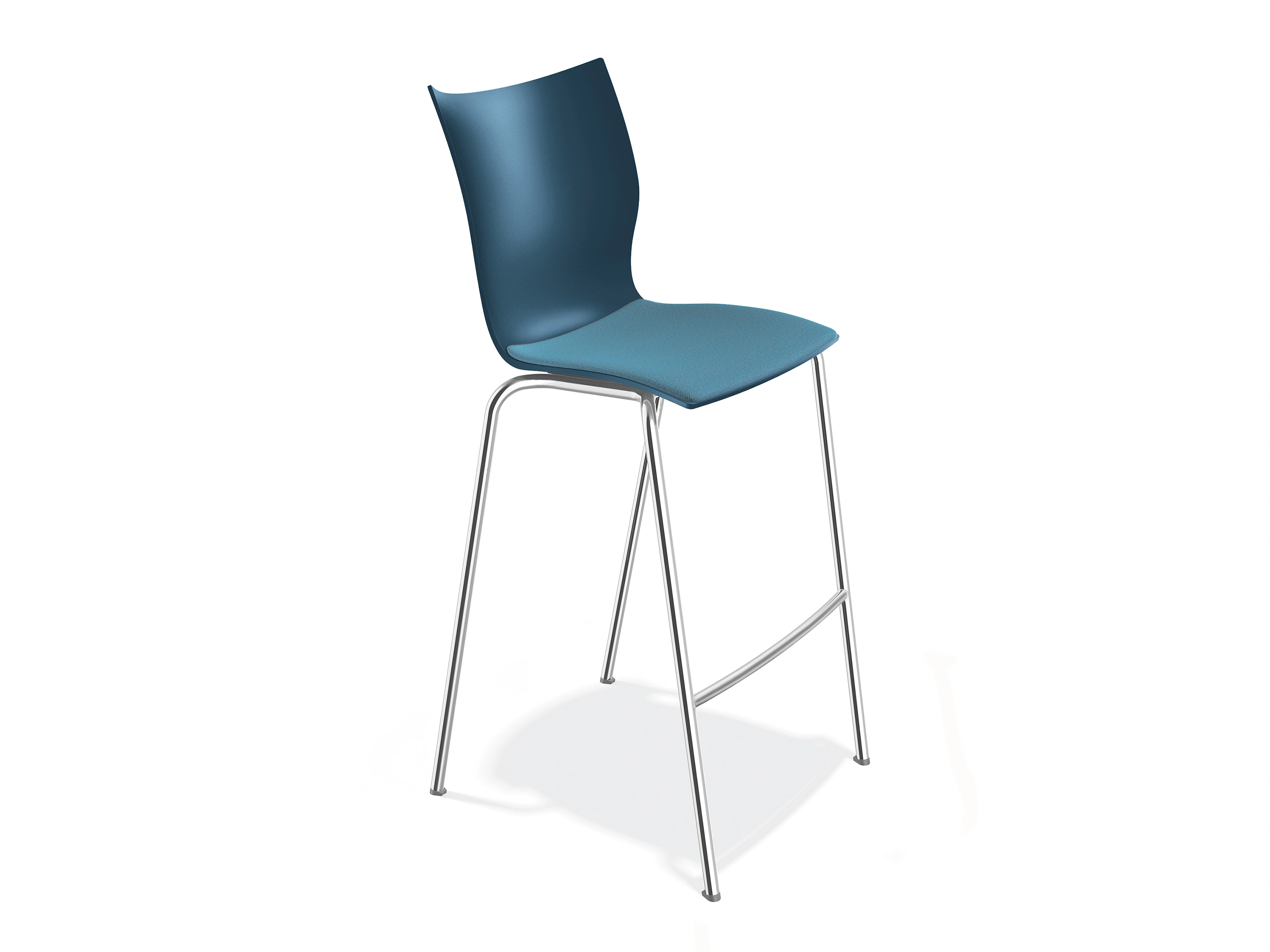 Barstoel met een 4-poots frame met zithoogte van 630mm en een kunststof polypropyleen kuip met zitting opdekstoffering. Stapelbaar tot 4 stuks.