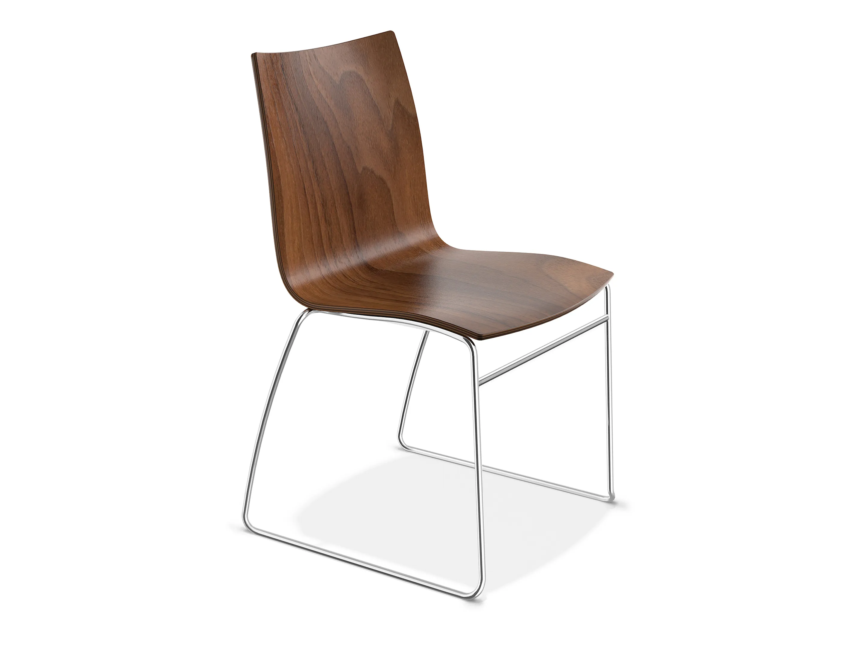 Sledeframe met een houten kuip met opdekstoffering zitting. Exclusief armleggers. Stapelbaar tot 15 stuks op transportwagen (verticaal stapelbaar) en 6 stuks vrijstaand.