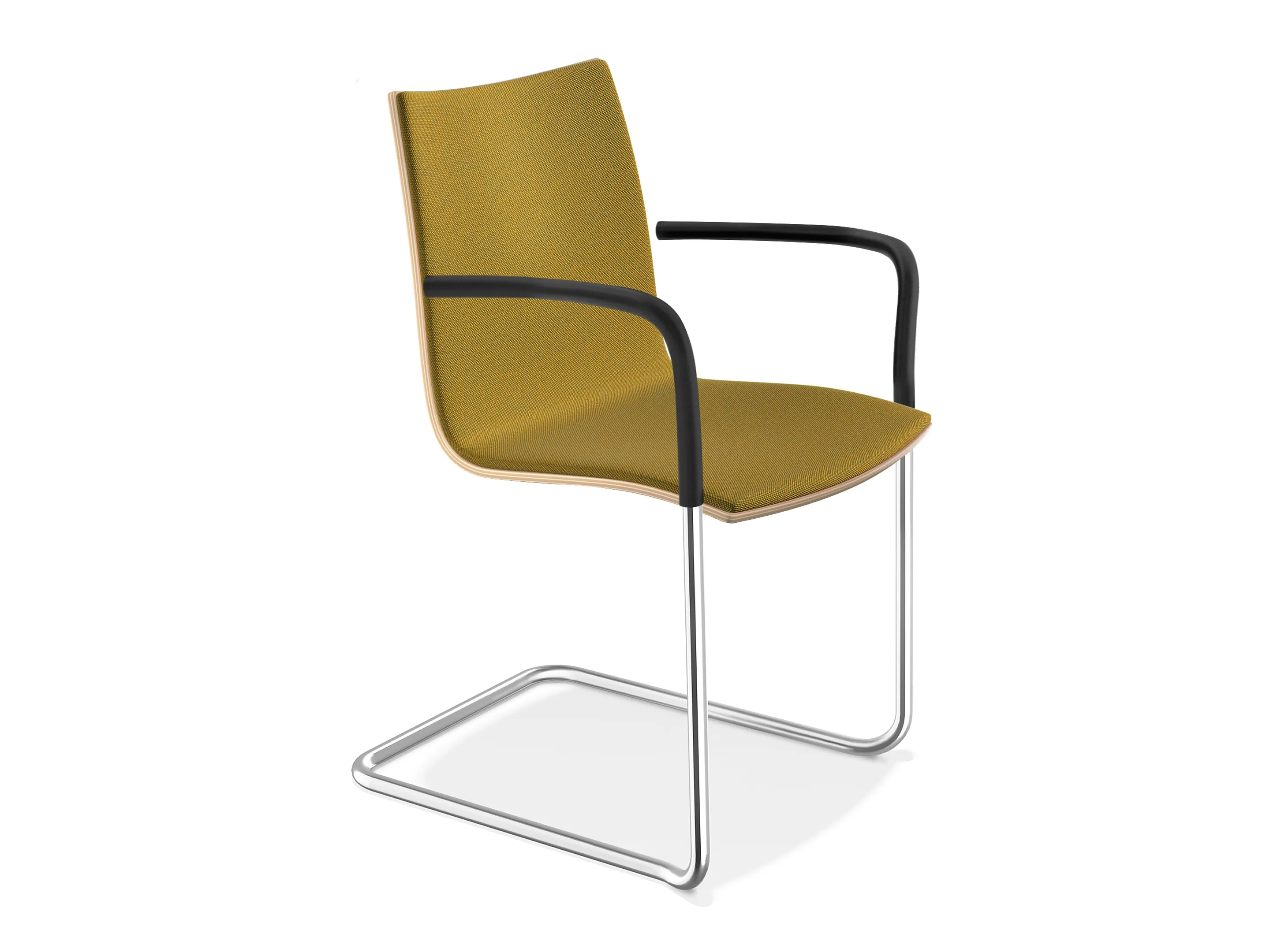 Sledeframe met een volledig gestoffeerde kuip. Inclusief armleggers. Stapelbaar tot 4 stuks vrijstaand.
