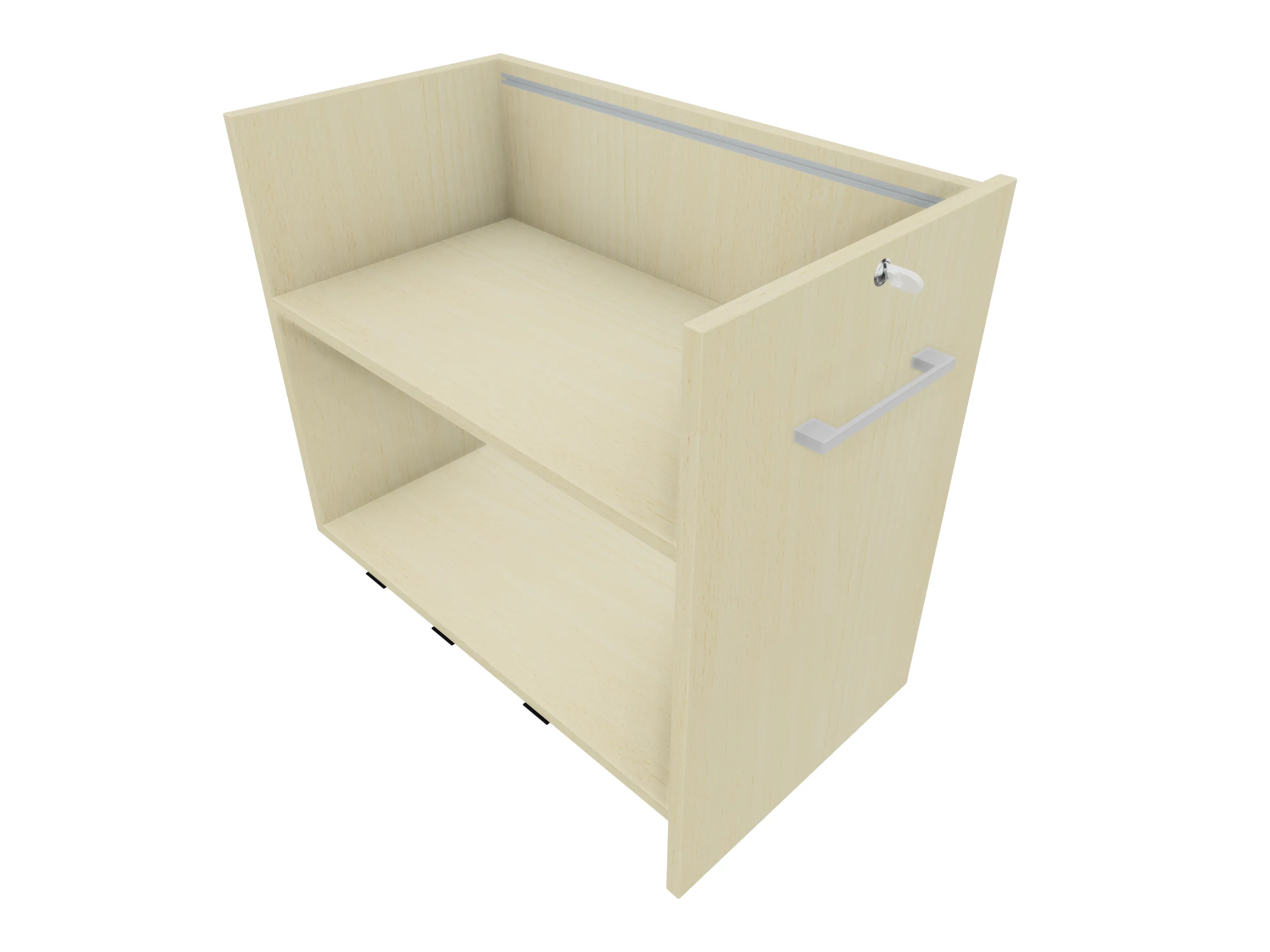 Uittrekbaar binnendeel, links geplaatst aan bureau, voorzien van 3 legplanken (totaal 3OH hoog), afgesloten met topblad, onderzijde kleine afsluitbare kluis, inclusief greep aan de voorzijde Afmeting: 435 x 1176 x 730mm (BxHxD)