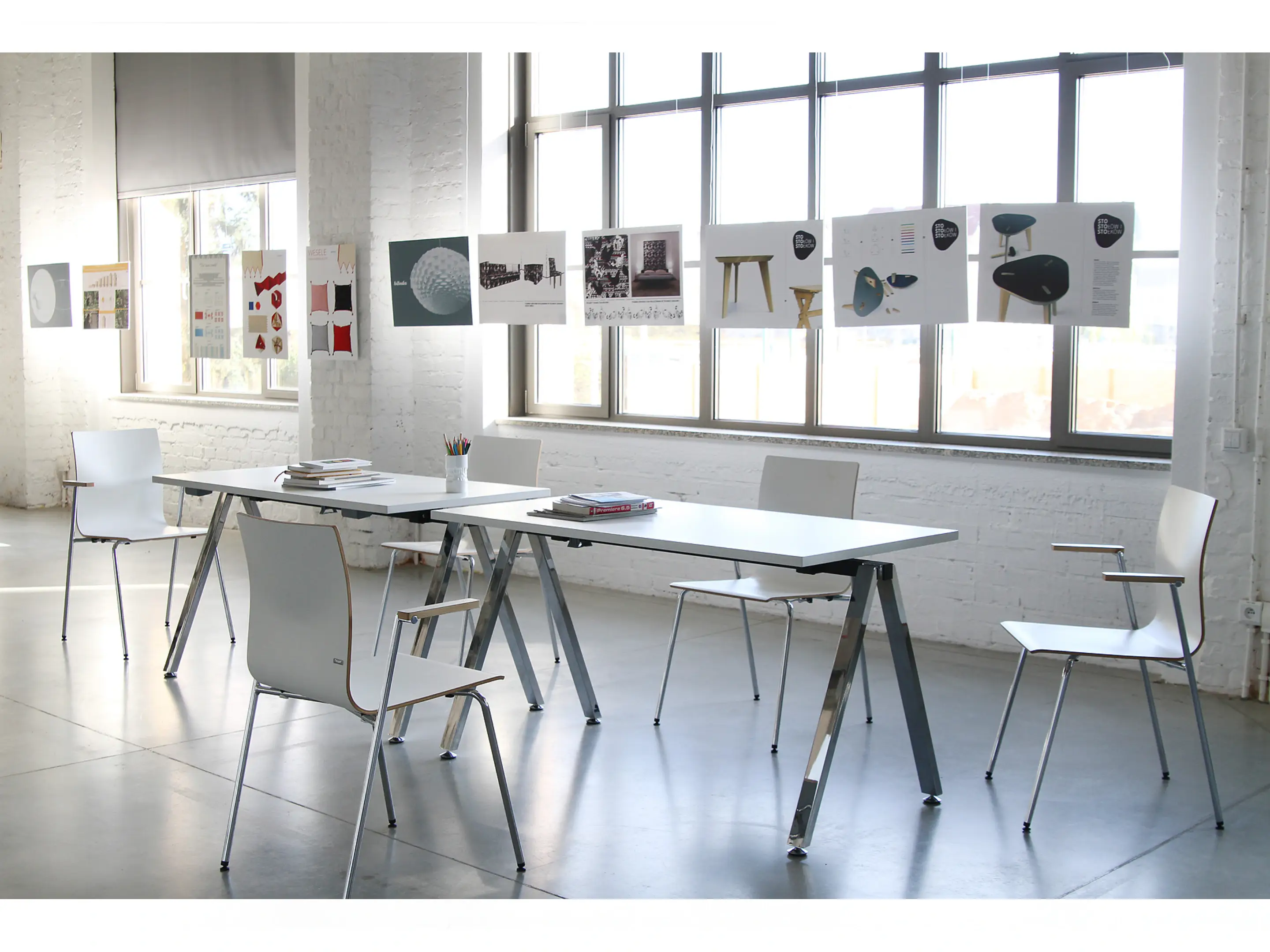 Stoel met volledig gestoffeerde kuip met horizontaal stiksel, 4-poots frame, armleggers met pads. Stapelbaar tot 3 stuks.