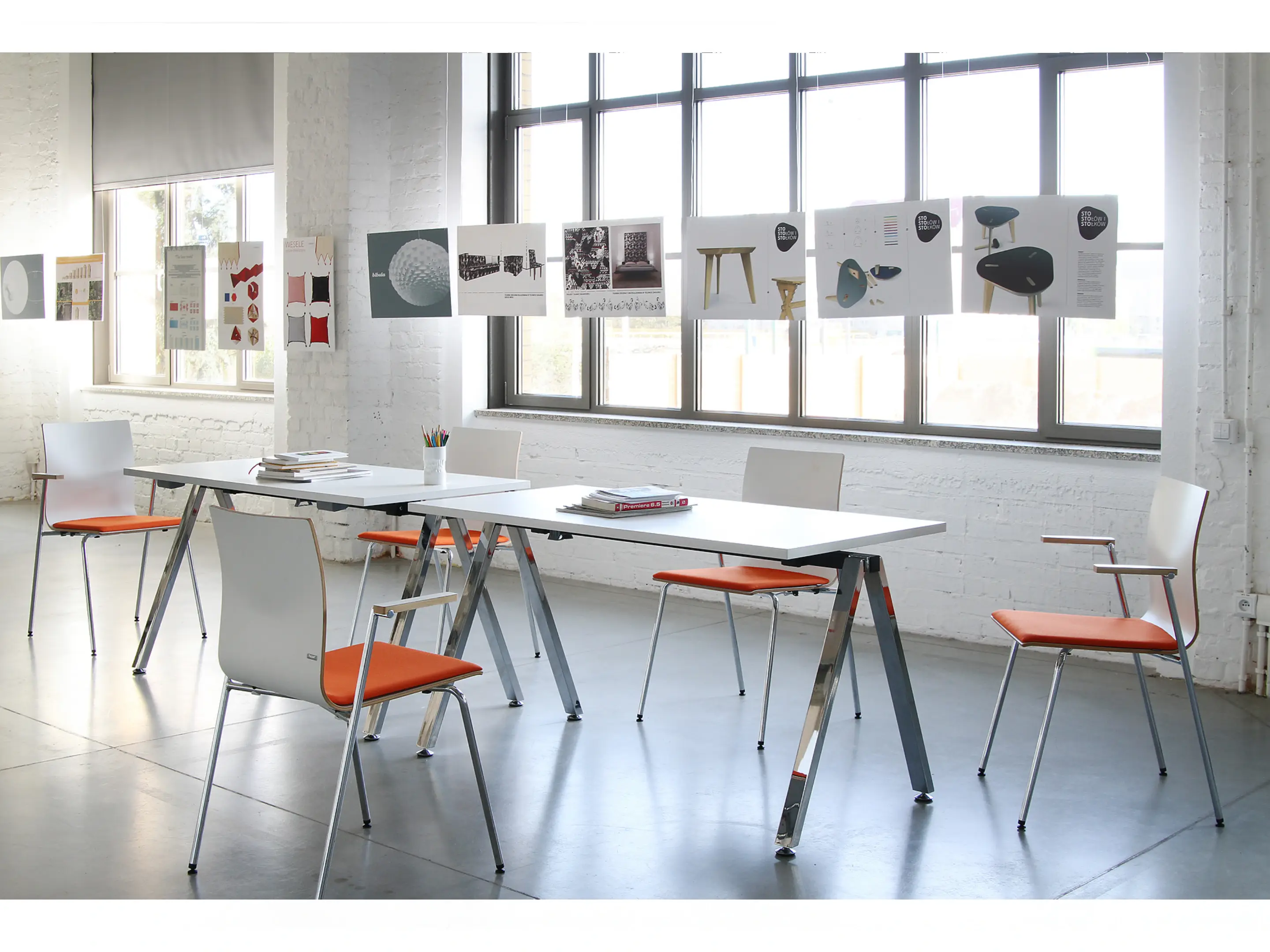 Stoel met volledig gestoffeerde kuip met horizontaal stiksel, 4-poots frame, exclusief armleggers. Stapelbaar tot 3 stuks.