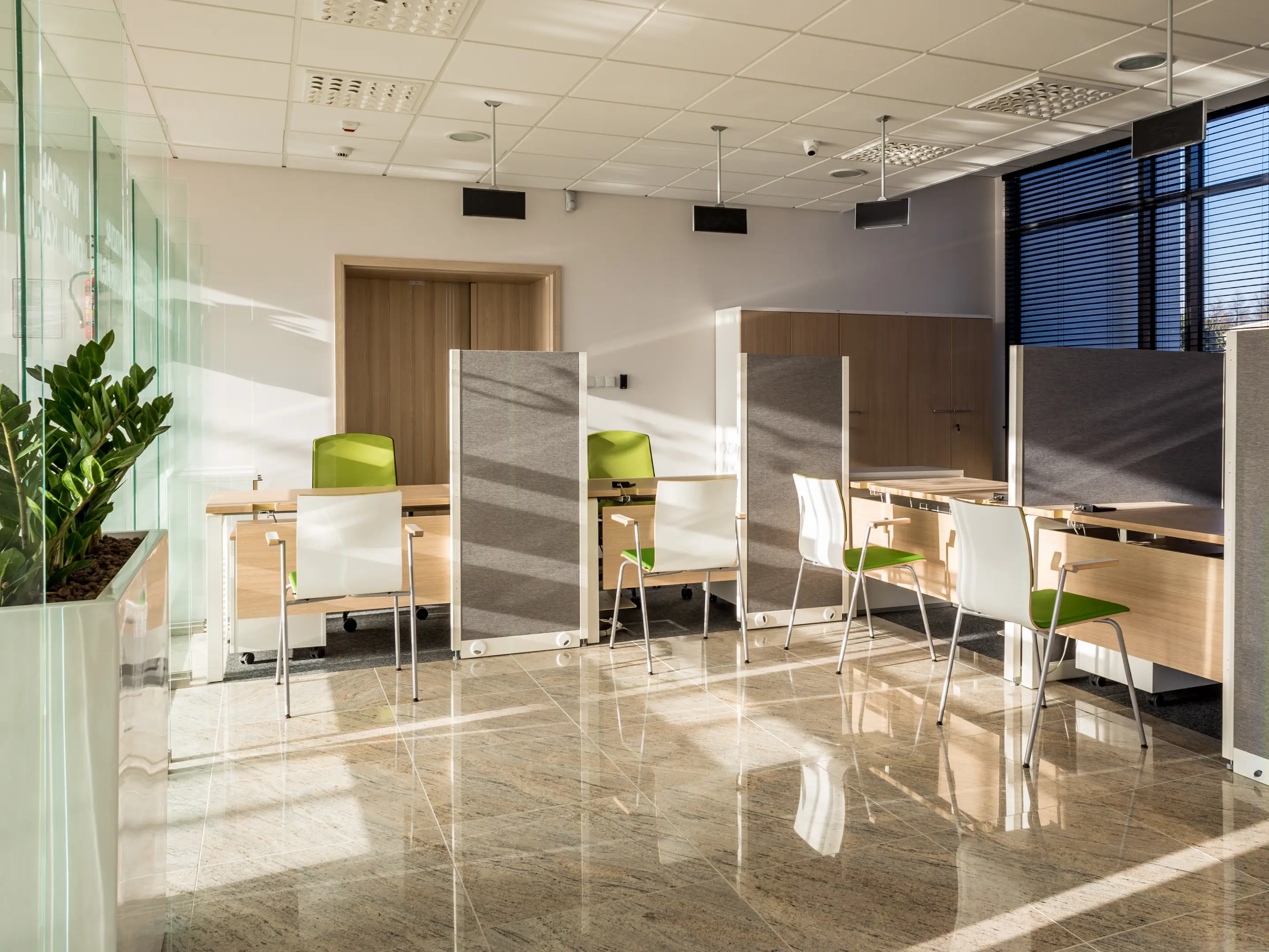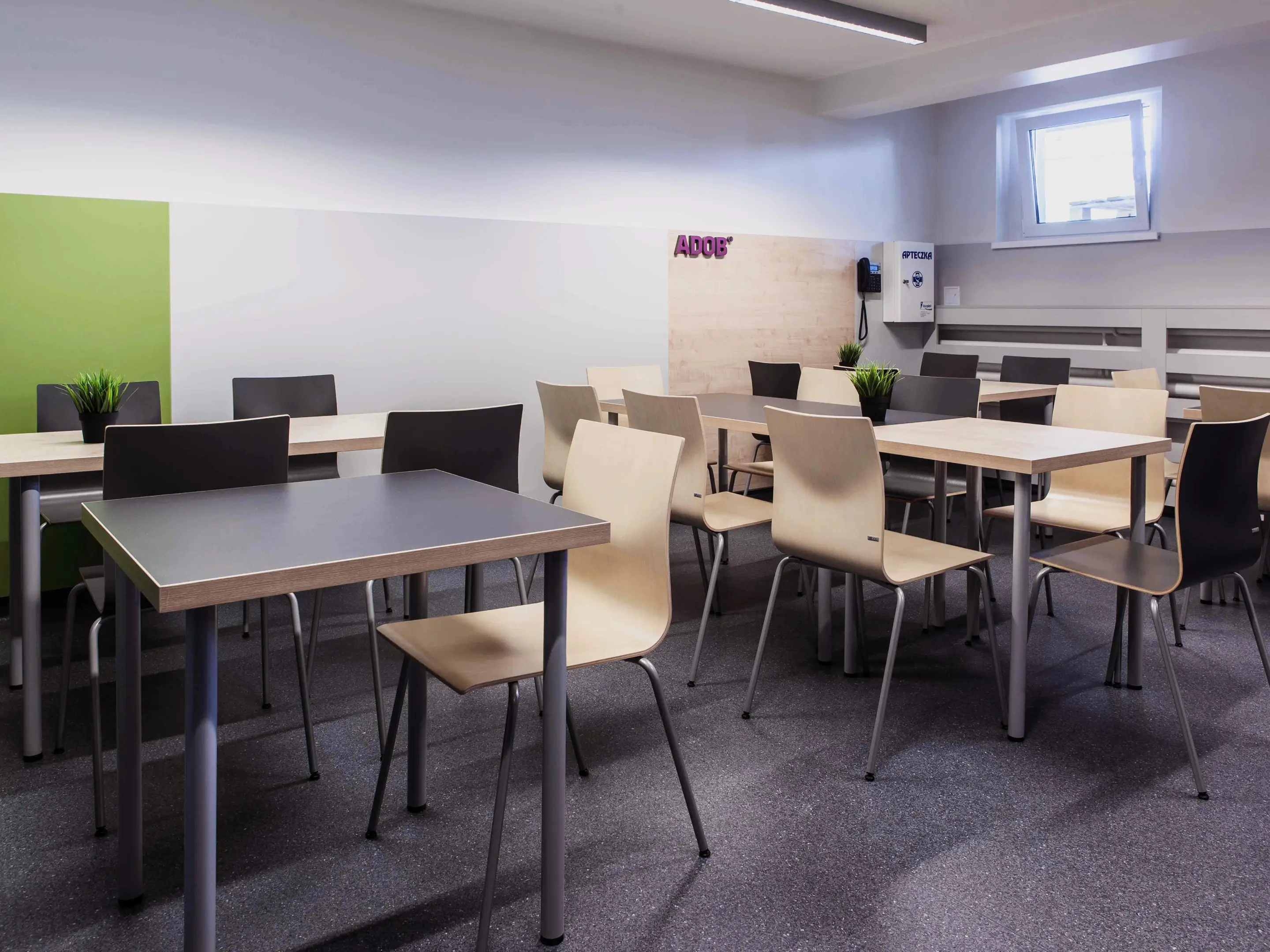 Stoel met CPL kuip met gestoffeerde zitting en rug, 4-poots frame, armleggers met pads. Stapelbaar tot 10 stuks.