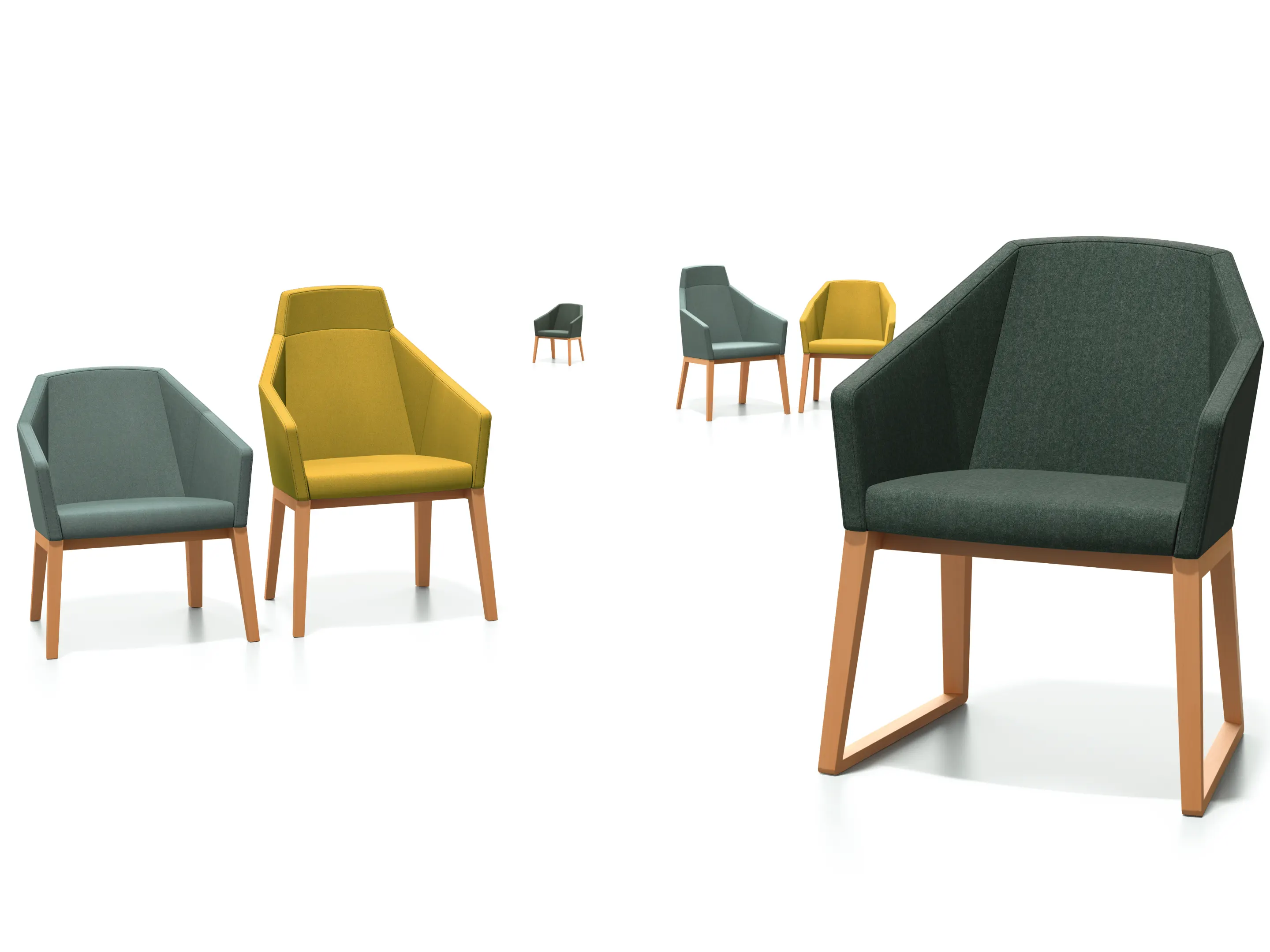 Volledig gestoffeerde kuip met een rughoogte van 81cm, op 4-poots frame voorzien van kunststof glijders, met een zithoogte van 41cm.