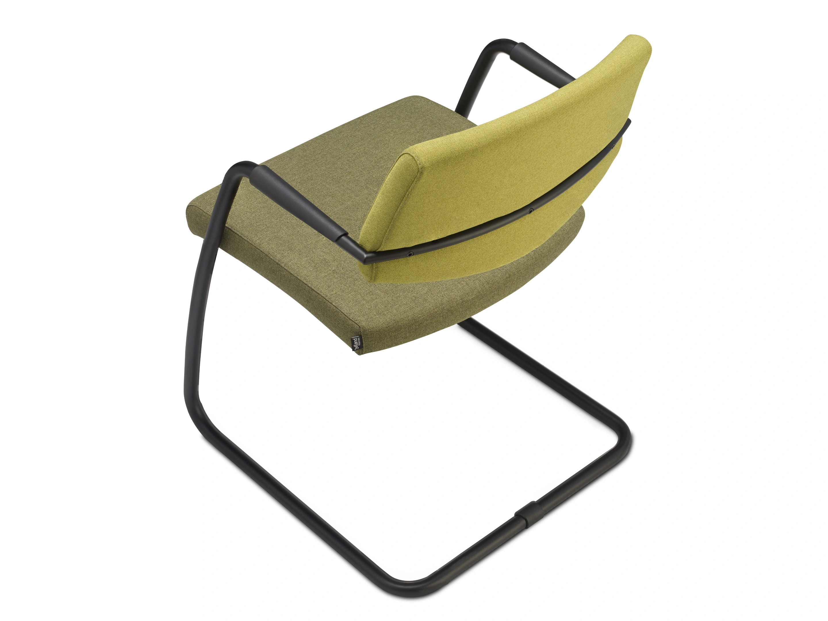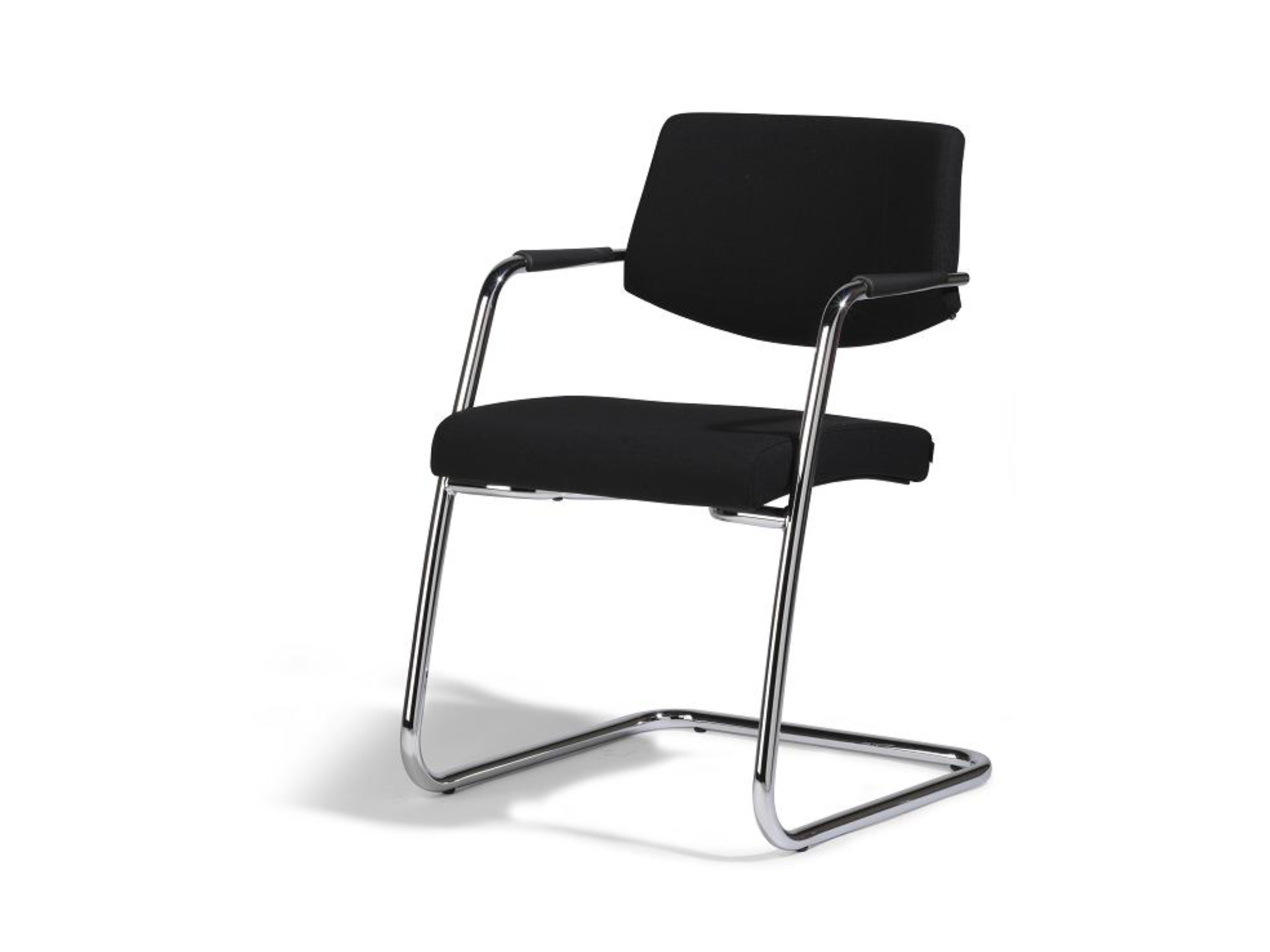 Vergaderstoel met een volledig gestoffeerde zitting en medium rug, op een matzwarte sledeframe voorzien van armleggers.