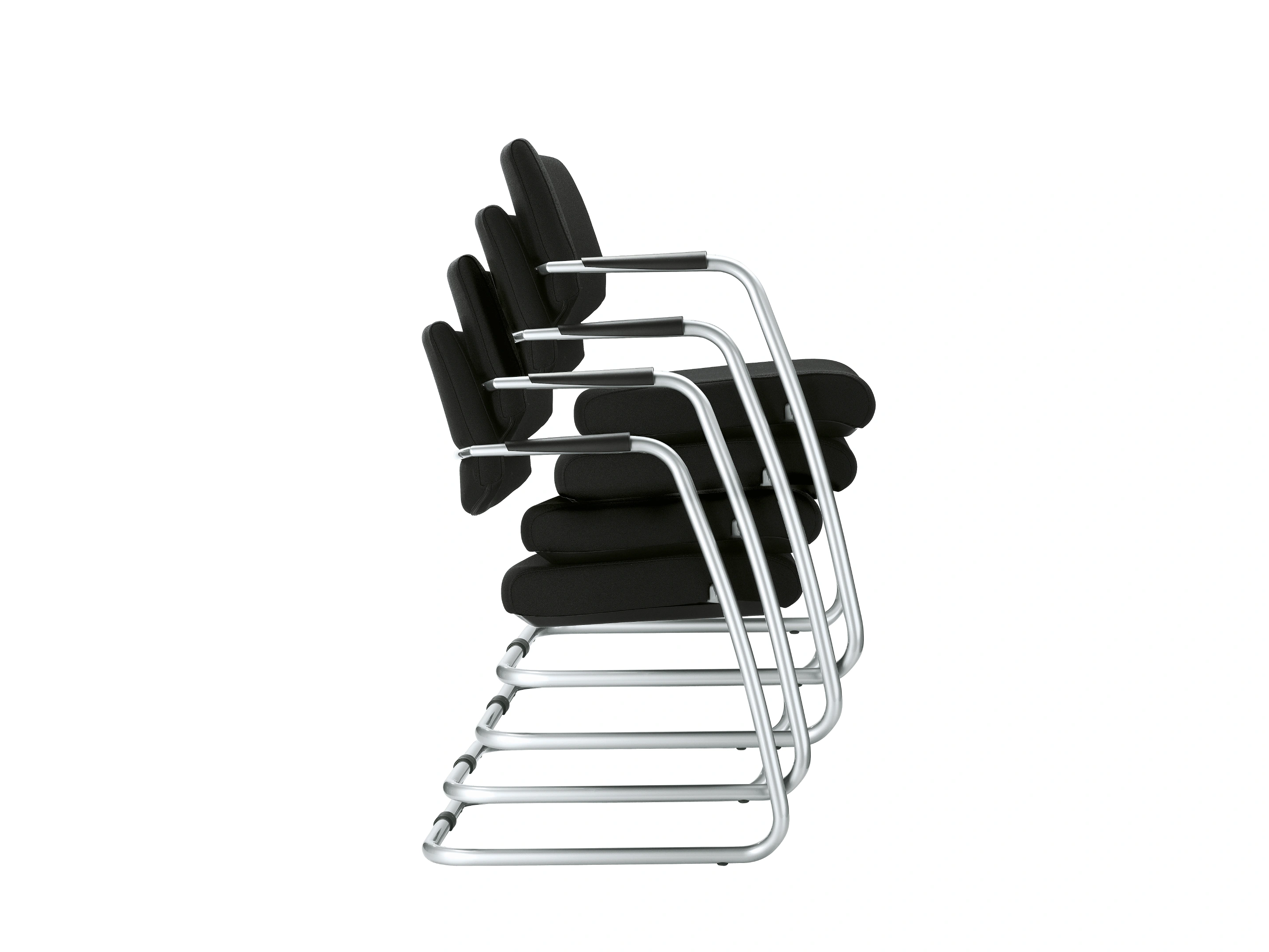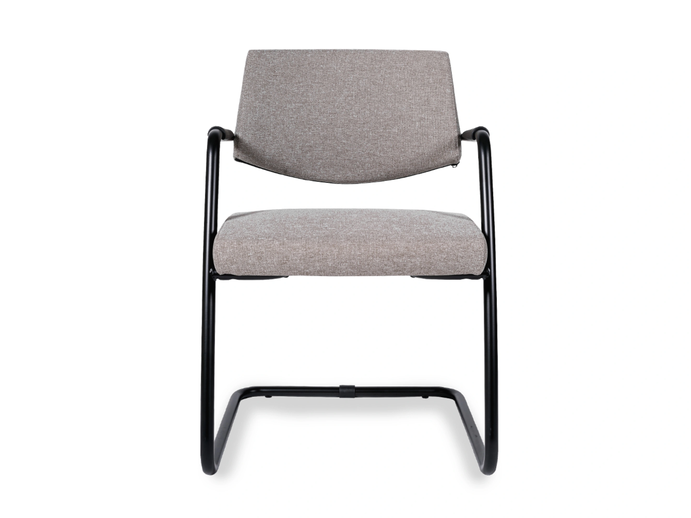 Vergaderstoel met een volledig gestoffeerde zitting en medium rug, op een matzwarte sledeframe voorzien van armleggers.
