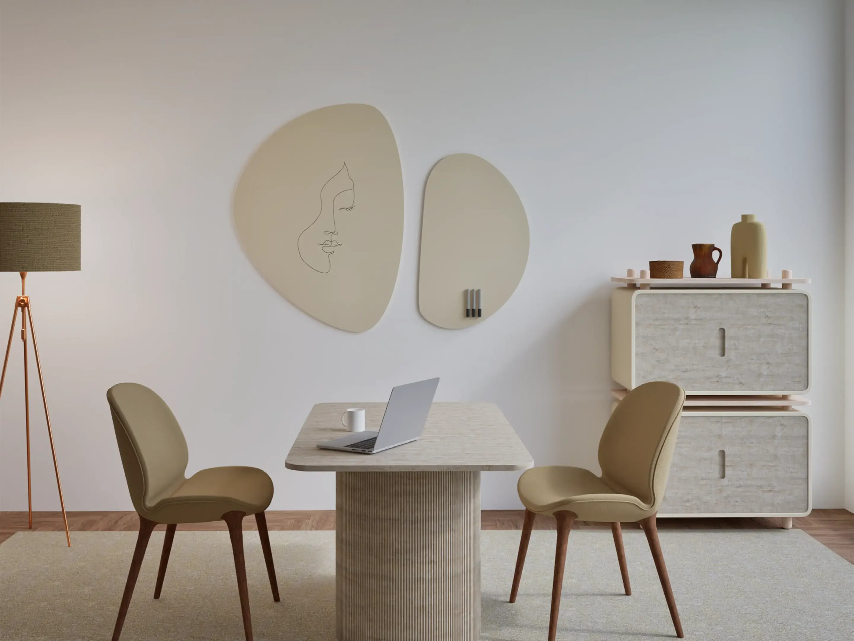 Kiezelvormig whiteboard zonder frame. Set van 3 verschillende vormen en afmetingen. Alle 3 zijn ook los verkrijgbaar. Afmeting vorm 1: 880 x 1180mm (B x H), afmeting vorm 2: 750 x 880mm (B x H), afmeting vorm 3: 620 x 580mm (B x H).